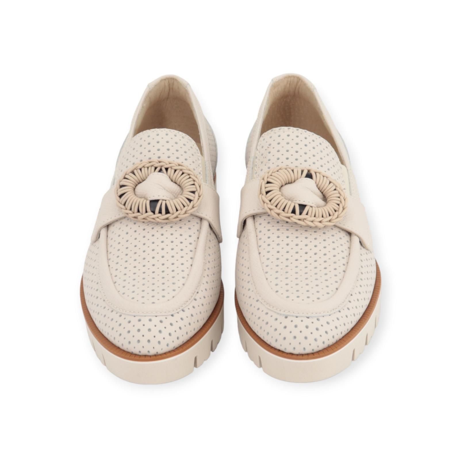 Mocassin 7011 van DL Sport voor dames. Deze mocassin is in beige geperforeerd leer. Heeft een band over de wreef met een beige raffia boekel. Blijft mooi vast aan de voet door de elastieken aan de wreef. Heeft een microzool met een lichte sleehak van 2cm hoog. De binnenzool is uitneembaar.