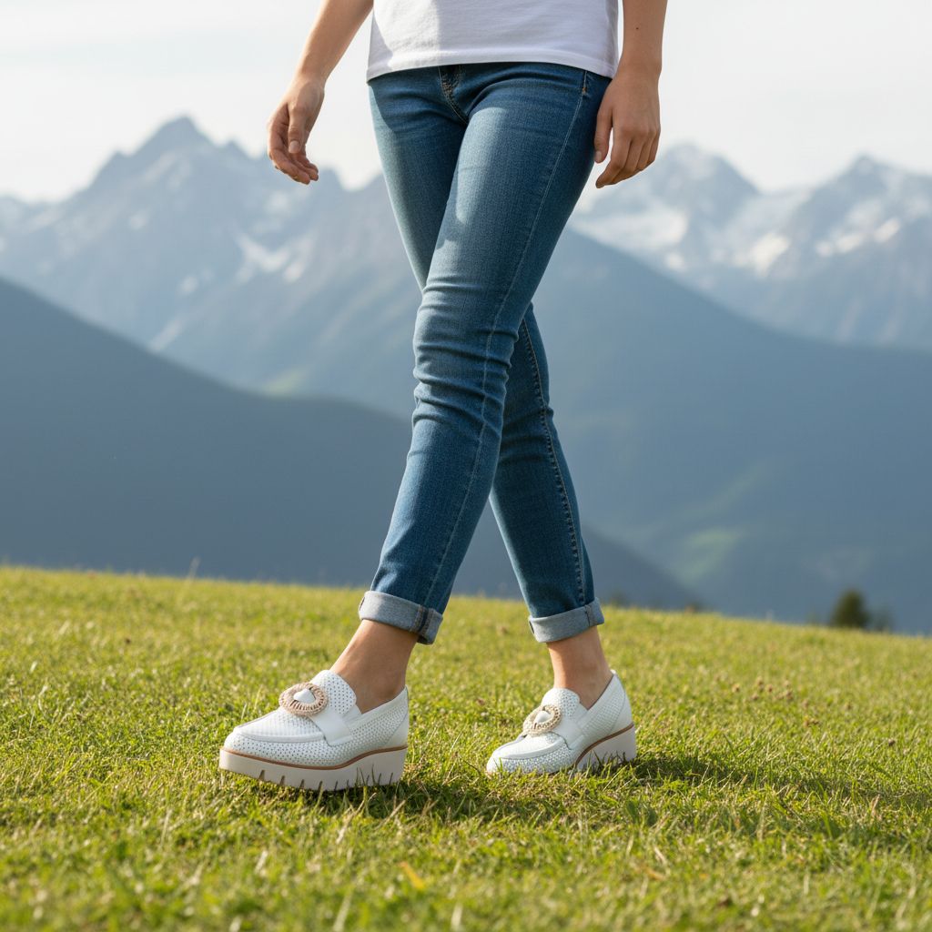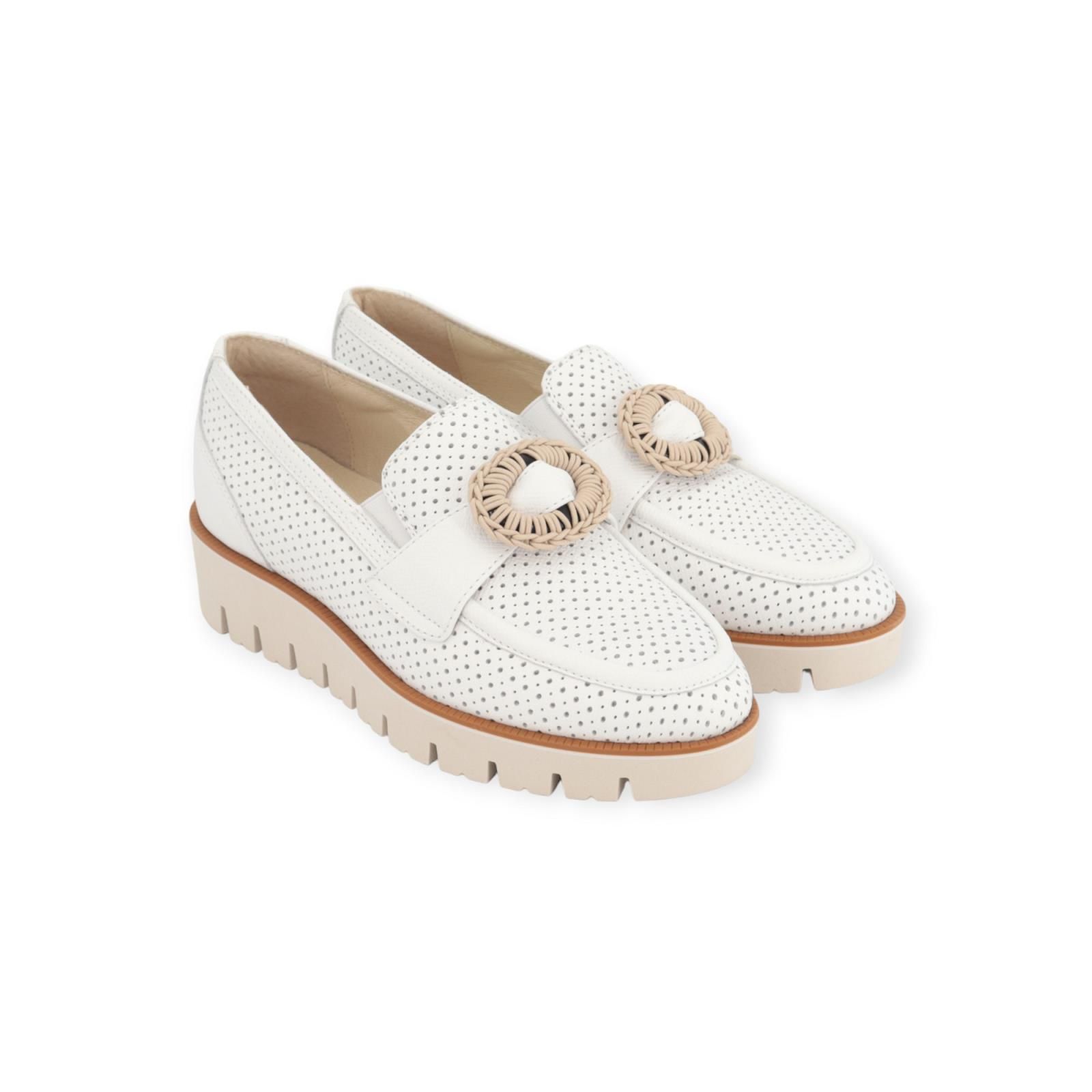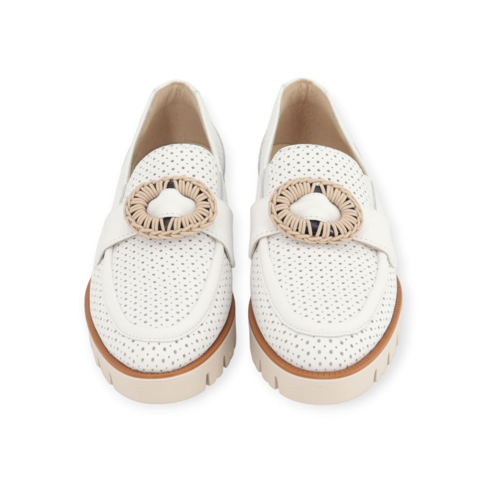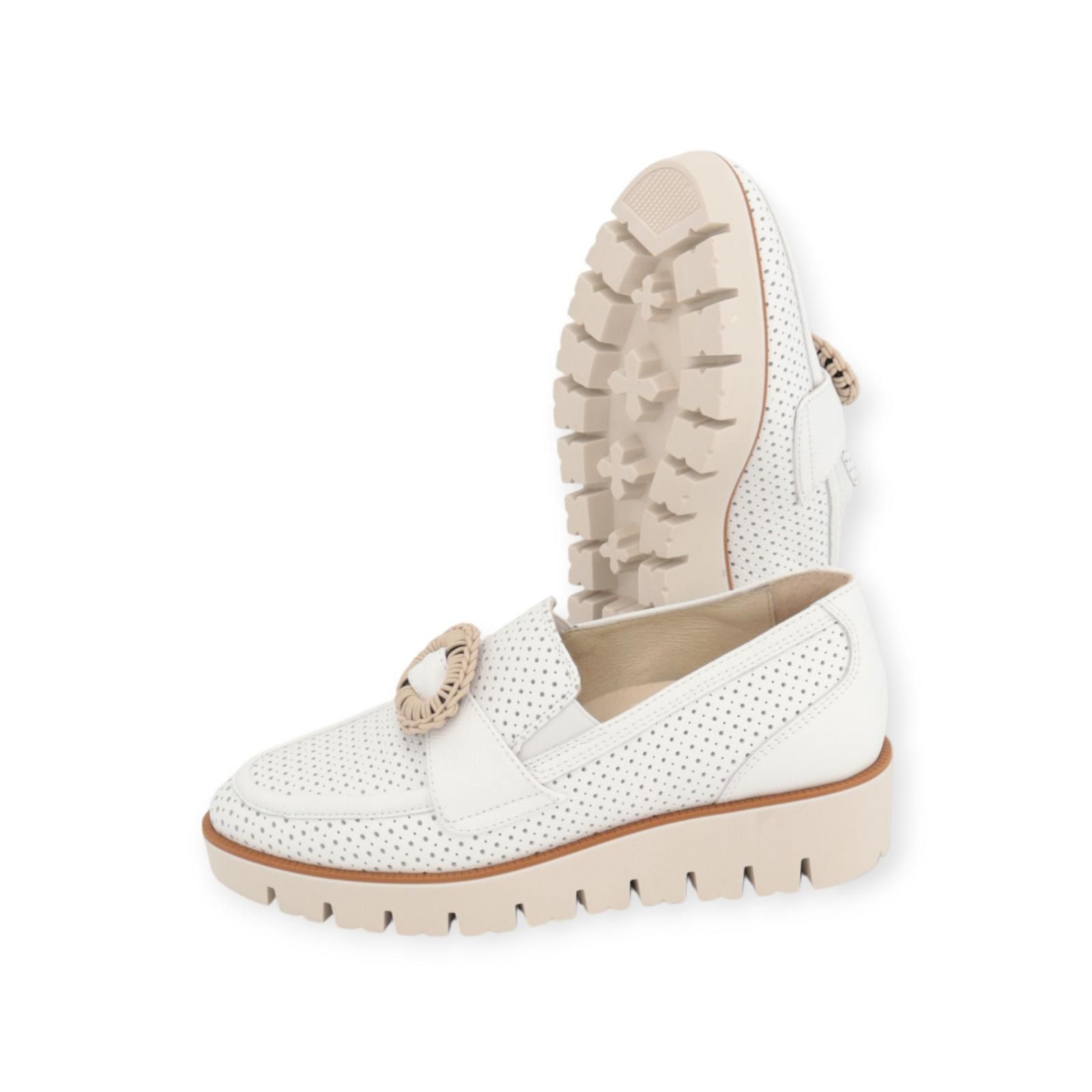 Mocassin 7011 van DL Sport voor dames. Deze mocassin is in wit geperforeerd leer. Heeft een band over de wreef met een beige raffia boekel. Blijft mooi vast aan de voet door de elastieken aan de wreef. Heeft een microzool met een lichte sleehak van 2cm hoog. De binnenzool is uitneembaar