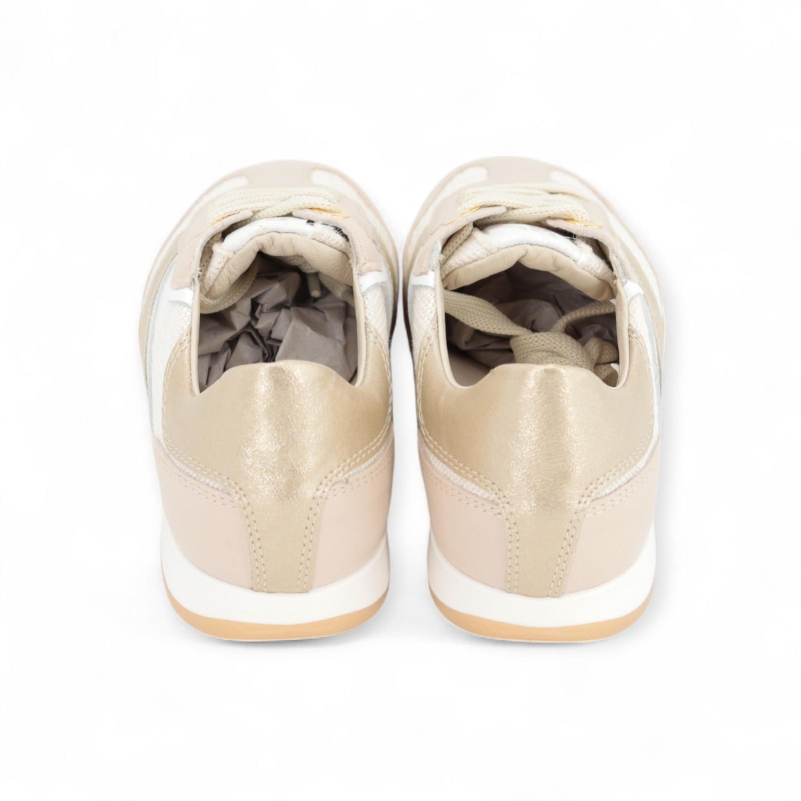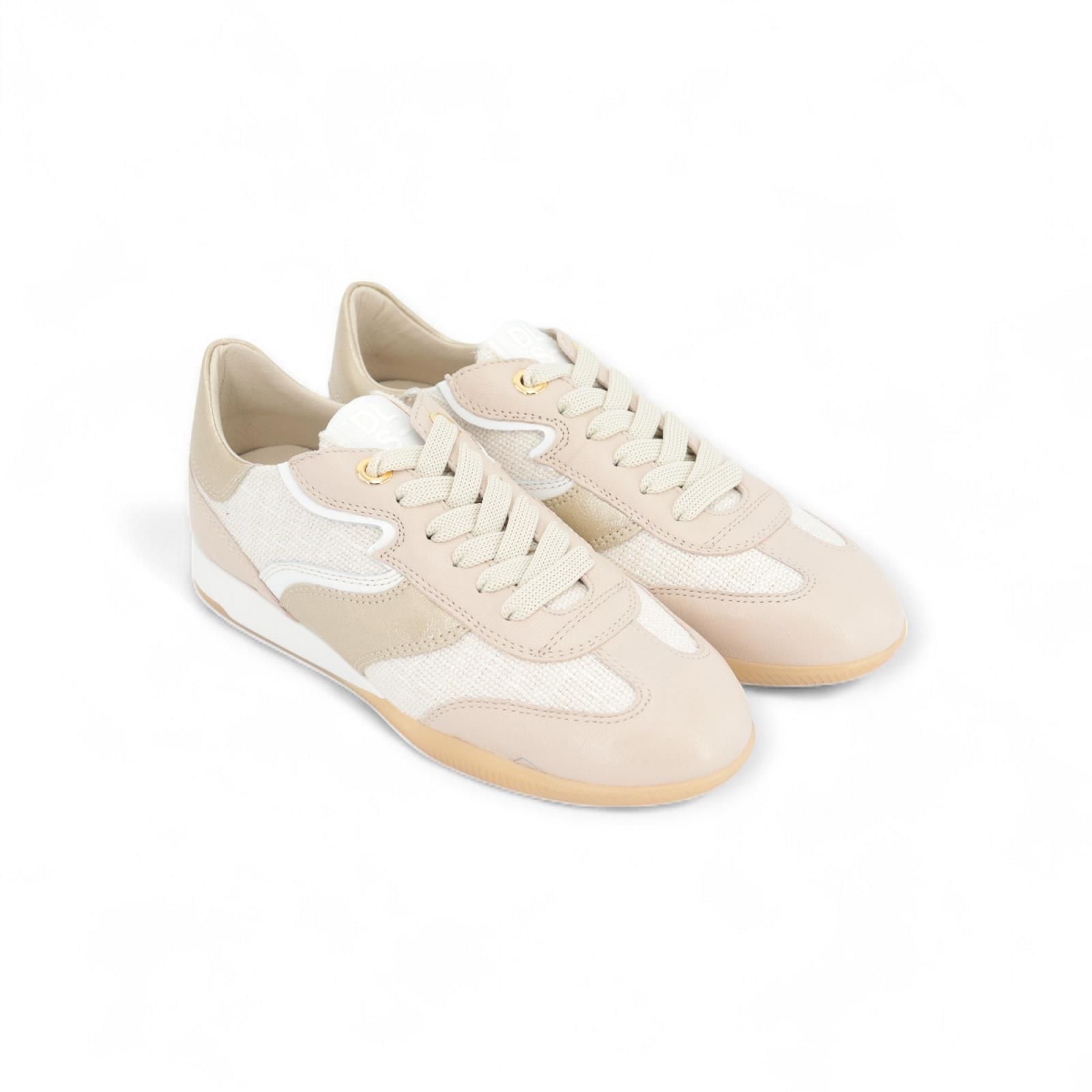 Beige sneaker 6572 V07 van Dl Sport voor dames is de meer geklede schoen. Afgewerkt met wit en gouden details, in leder en geweven structuren vervaardigt. Beschikt over een goeie rubberen zool die makkelijk plooibaar is. Dit model heeft ook een uitneembare binnenzool.