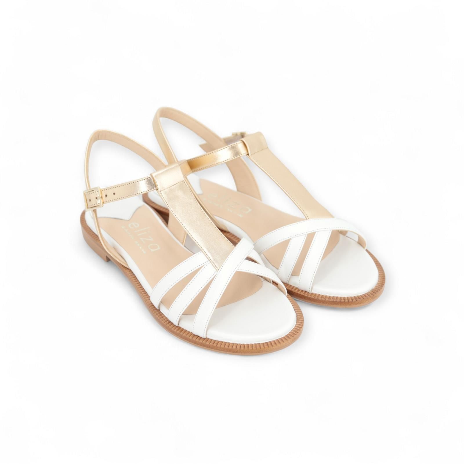 Eliza di venezia dames sandaal in wit met goud. De drie bandjes vooraan en het bandje rond de enkel zorgen dat deze sandaal mooi en elegant aan de voet staat. Deze sandaal is volledig in leer afgewerkt. Deze 100% handgemaakte Italiaanse leren schoenen zijn typerend voor haar vormen, materialen en unieke combinaties. Stuk voor stuk schoenen voor de elegante dame.