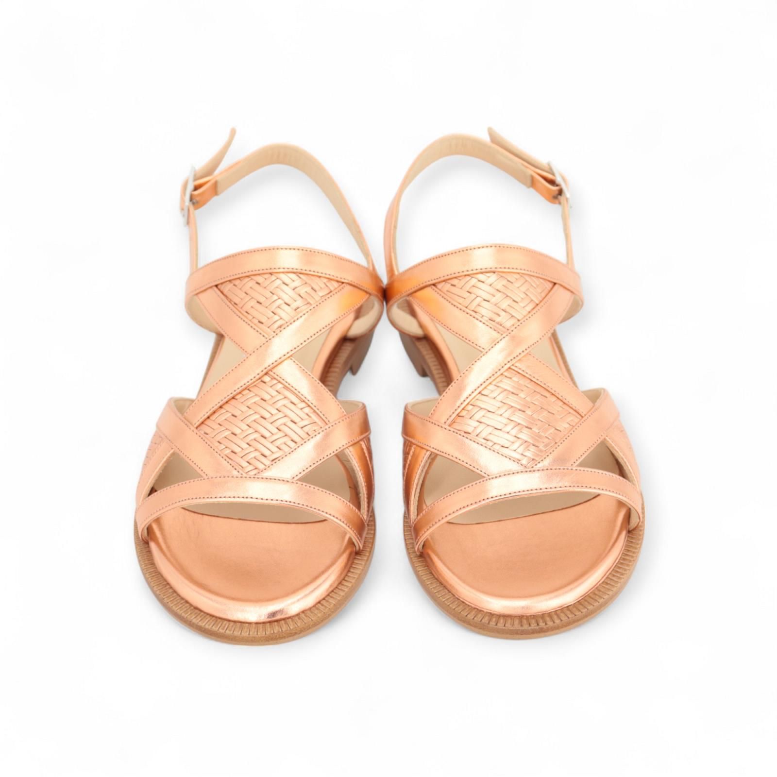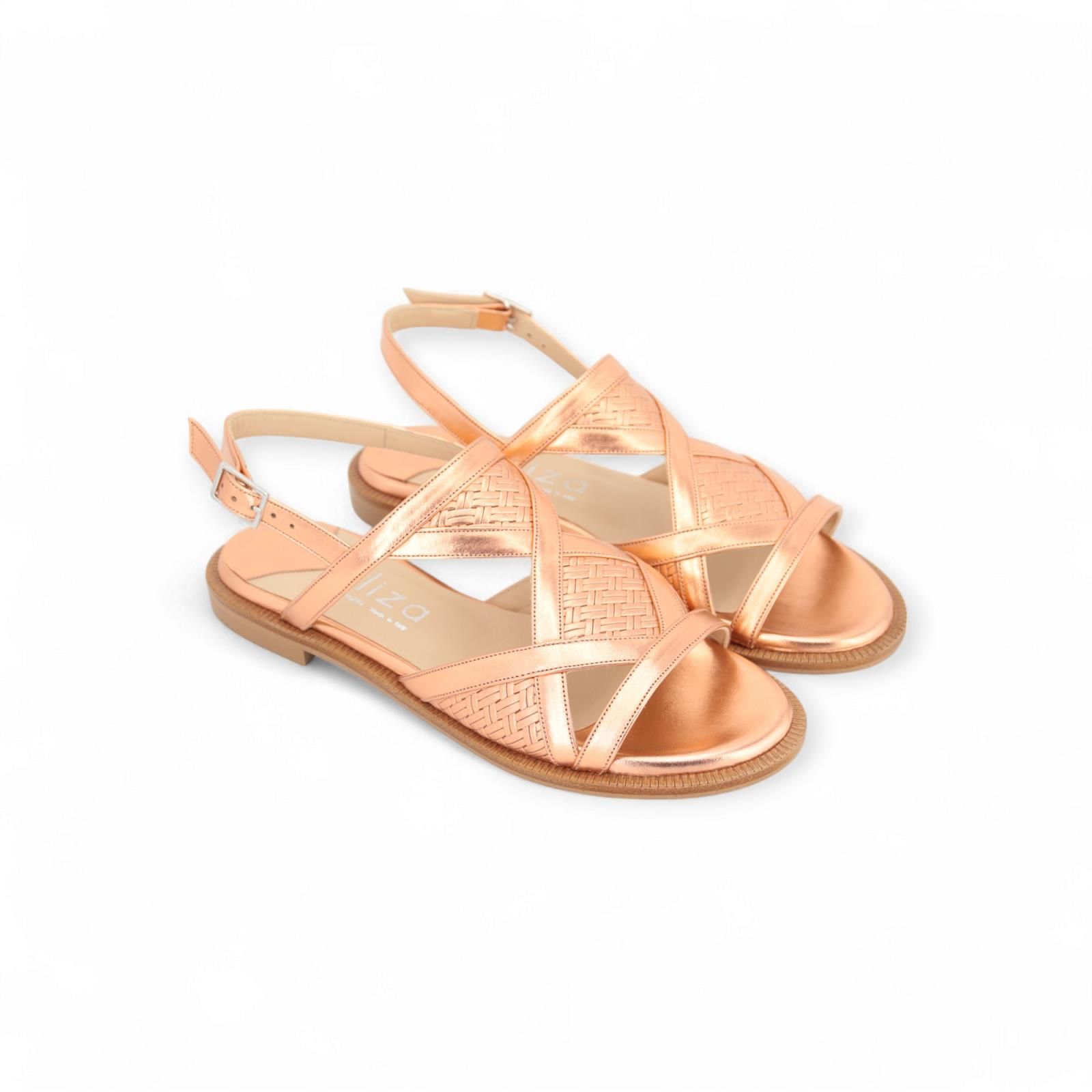 Eliza di venezia dames sandaal in rosé goud. De bandjes vooraan en het bandje rond de enkel zorgen dat deze sandaal mooi en elegant aan de voet staat. Deze sandaal is volledig in leer afgewerkt. Deze 100% handgemaakte Italiaanse leren schoenen zijn typerend voor haar vormen, materialen en unieke combinaties. Stuk voor stuk schoenen voor de elegante dame.