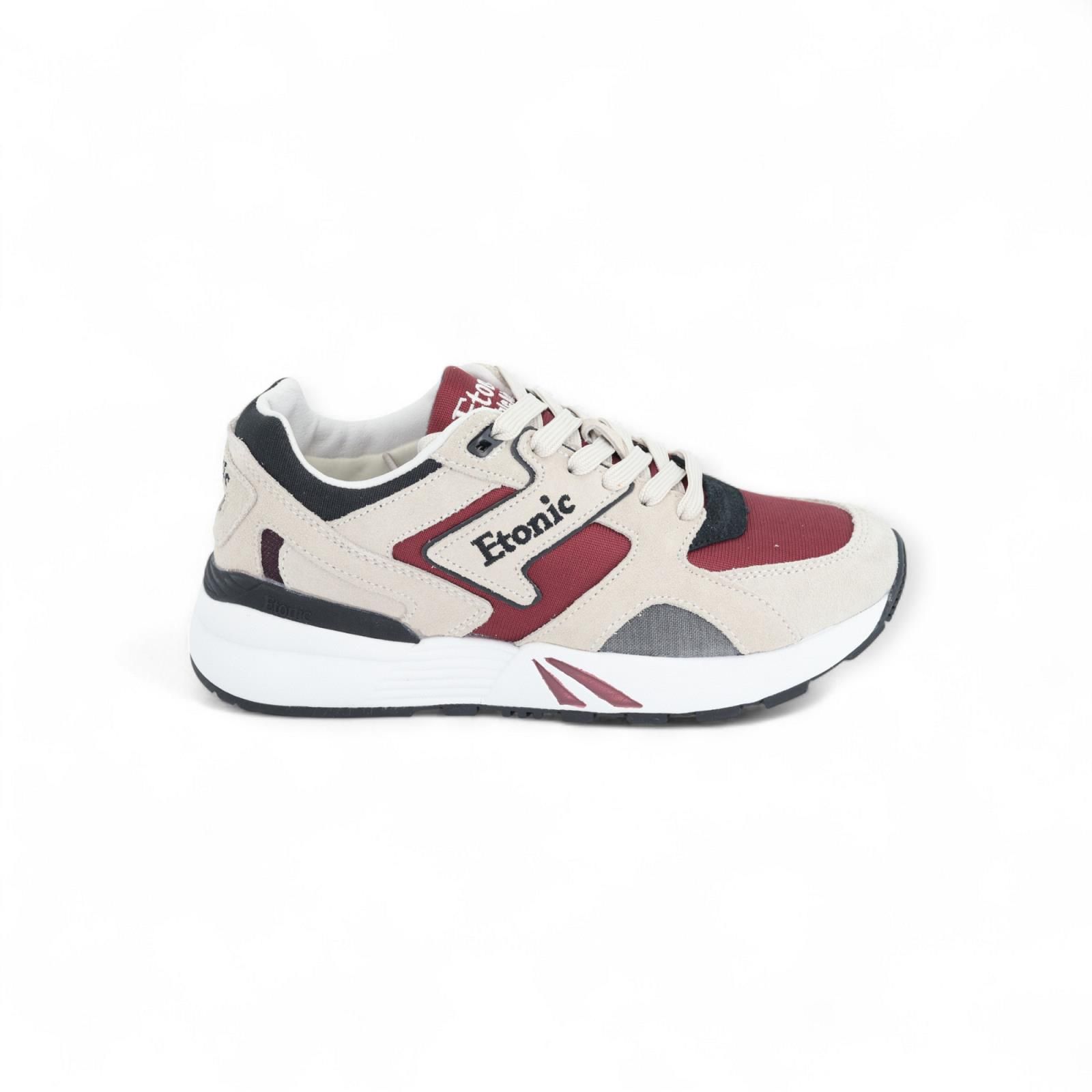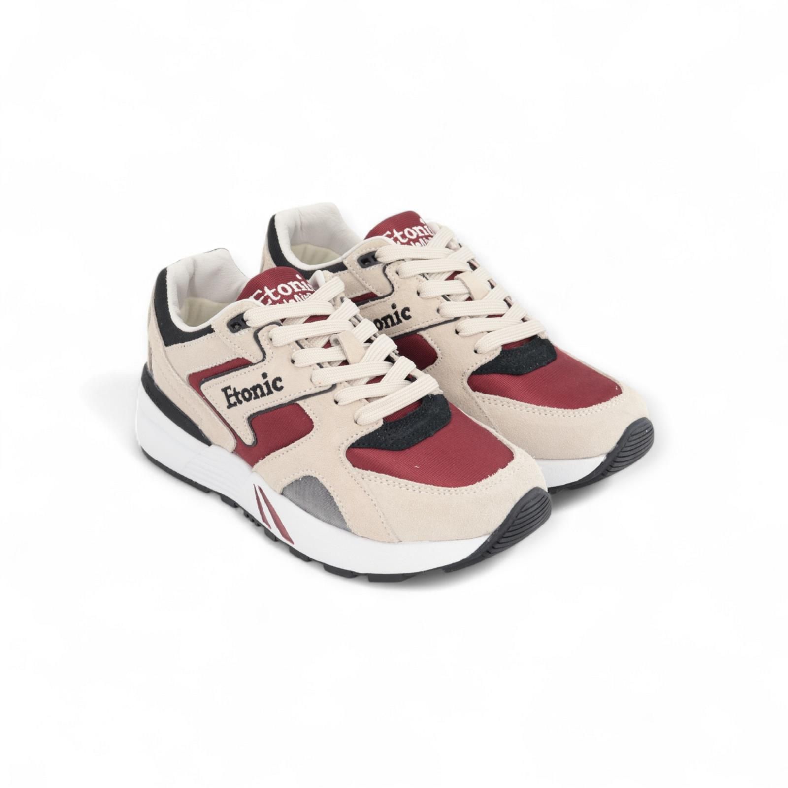 Sneaker Stable Air Block van Etonic. Is gemaakt van bordeaux en grijs mesh met off wit suède inzetstukken afgewerkt met zwarte accenten. Deze sneaker combineert lichtgewicht demping op een dikke witte runnerzool. De binnenzool is uitneembaar.
