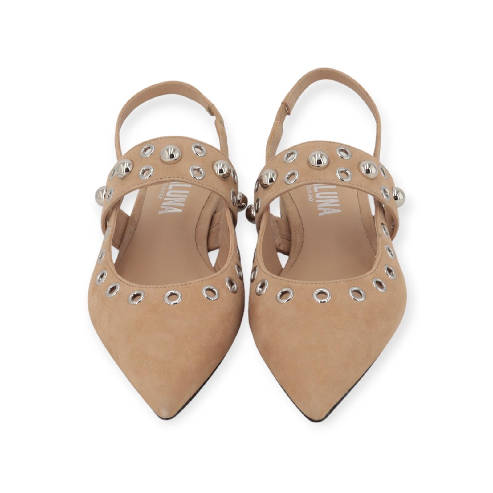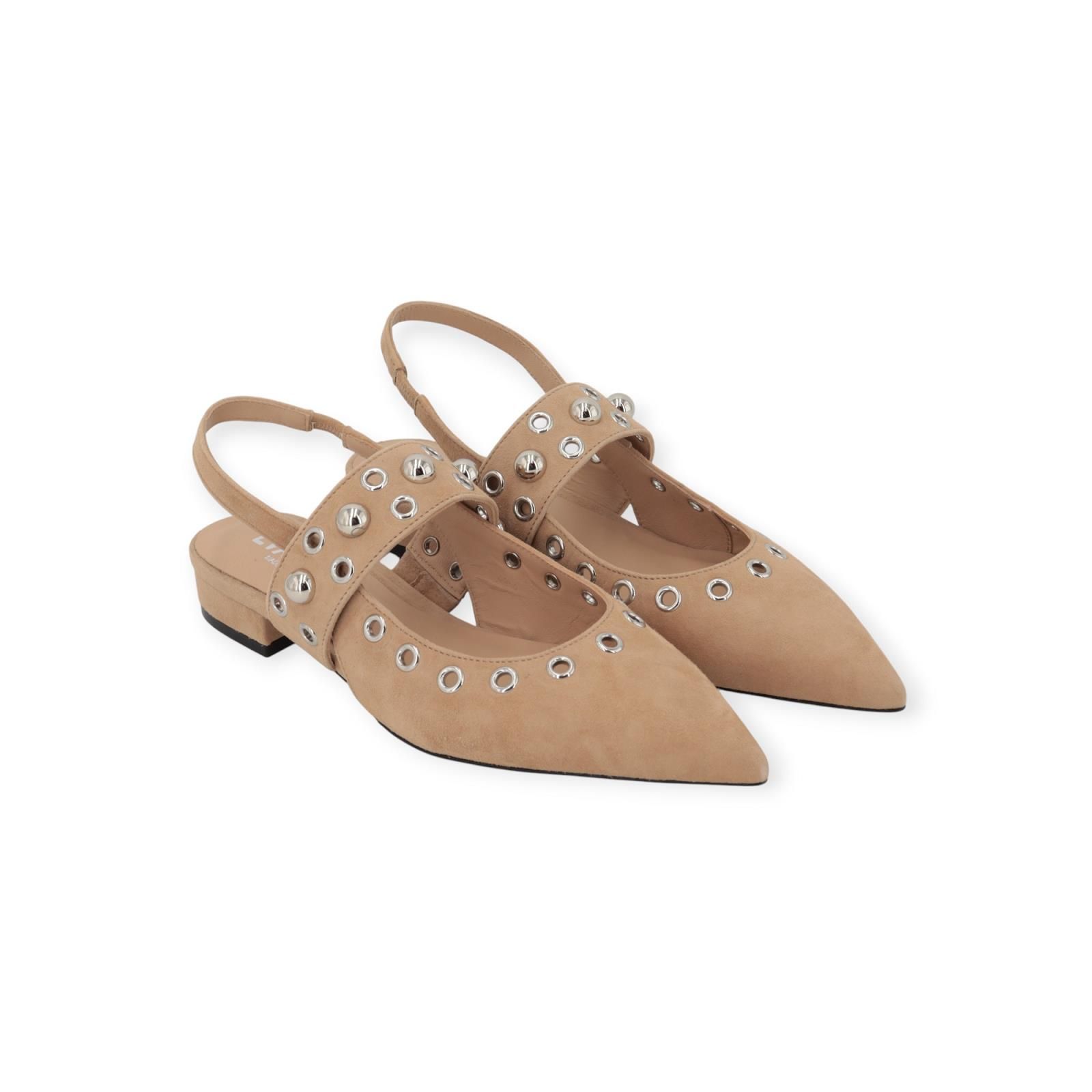 Ballerina 316 van Evaluna voor dames. Deze slingback is in zand suède met een scherpe neus omrand met zilveren oogjes. Heeft een brede band over de wreef voorzien van zilveren studs en oogjes. Blijft mooi vast aan de voet door het bandje rond de hiel met elastiek. Is op een leren buitenzool.