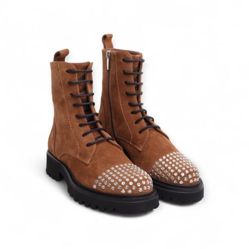 Enkellaars Eda van Evaluna voor dames. Dit western enkellaarsje is in cognac suède. Afgewerkt met een rekker aan de achterkant. Heeft een gouden gespsluiting en studs als extra detail. Is met een scherpe top en een klein blokhakje van 3-3.5cm hoog.