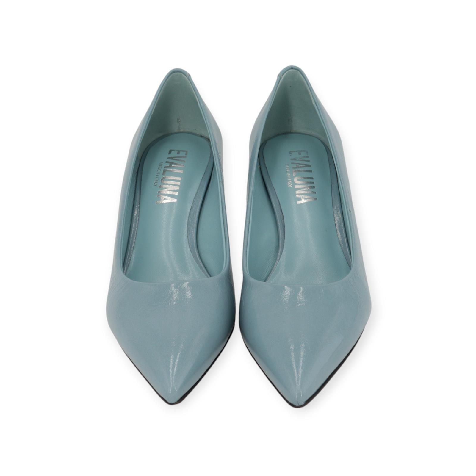 Pump 5503 van Evaluna voor dames. Deze tijdloze pump is in lichtblauw lakleer met een scherpe neus. Heeft een schuin (vernieuwde) fijne hak van 5-5.5cm hoog met een leren buitenzool.