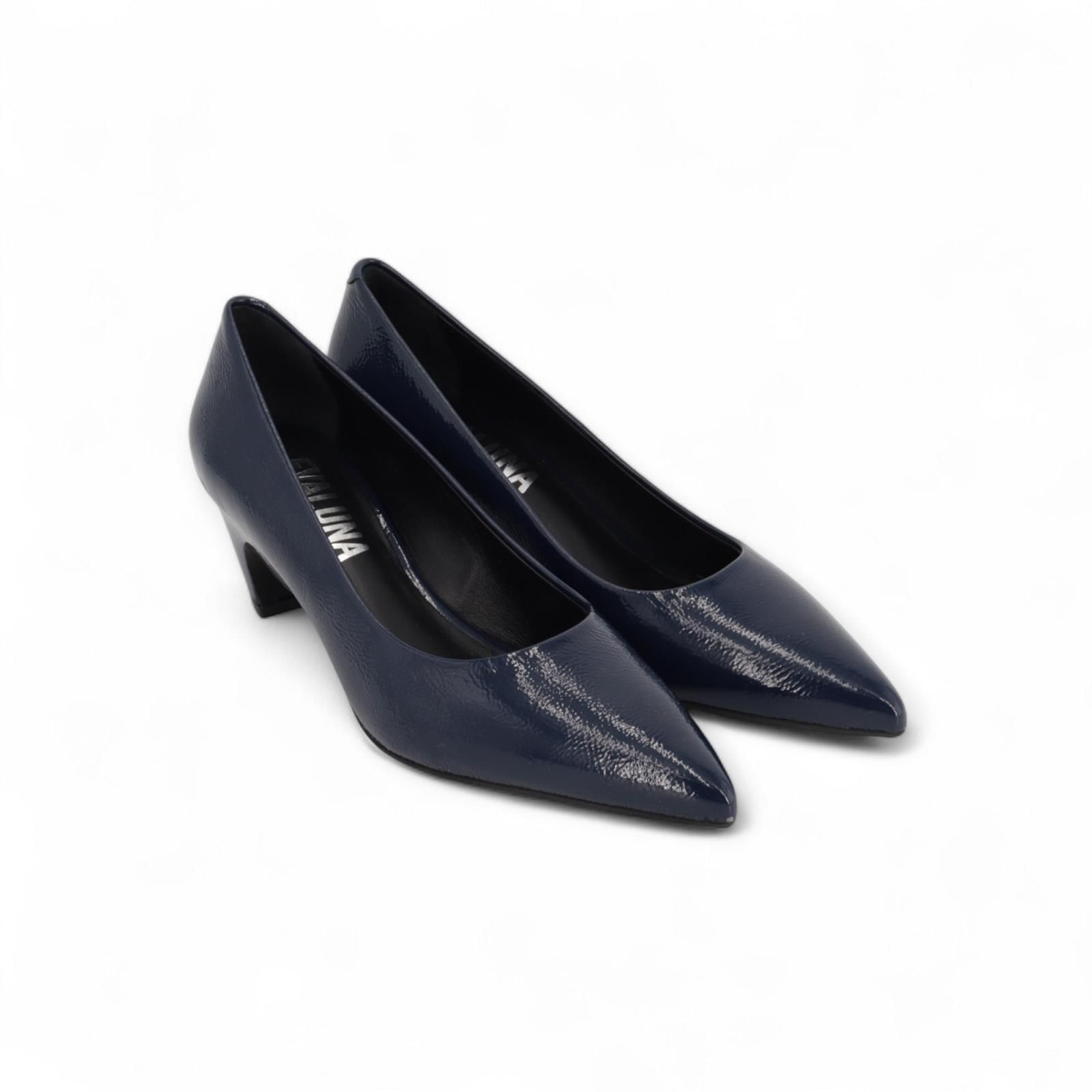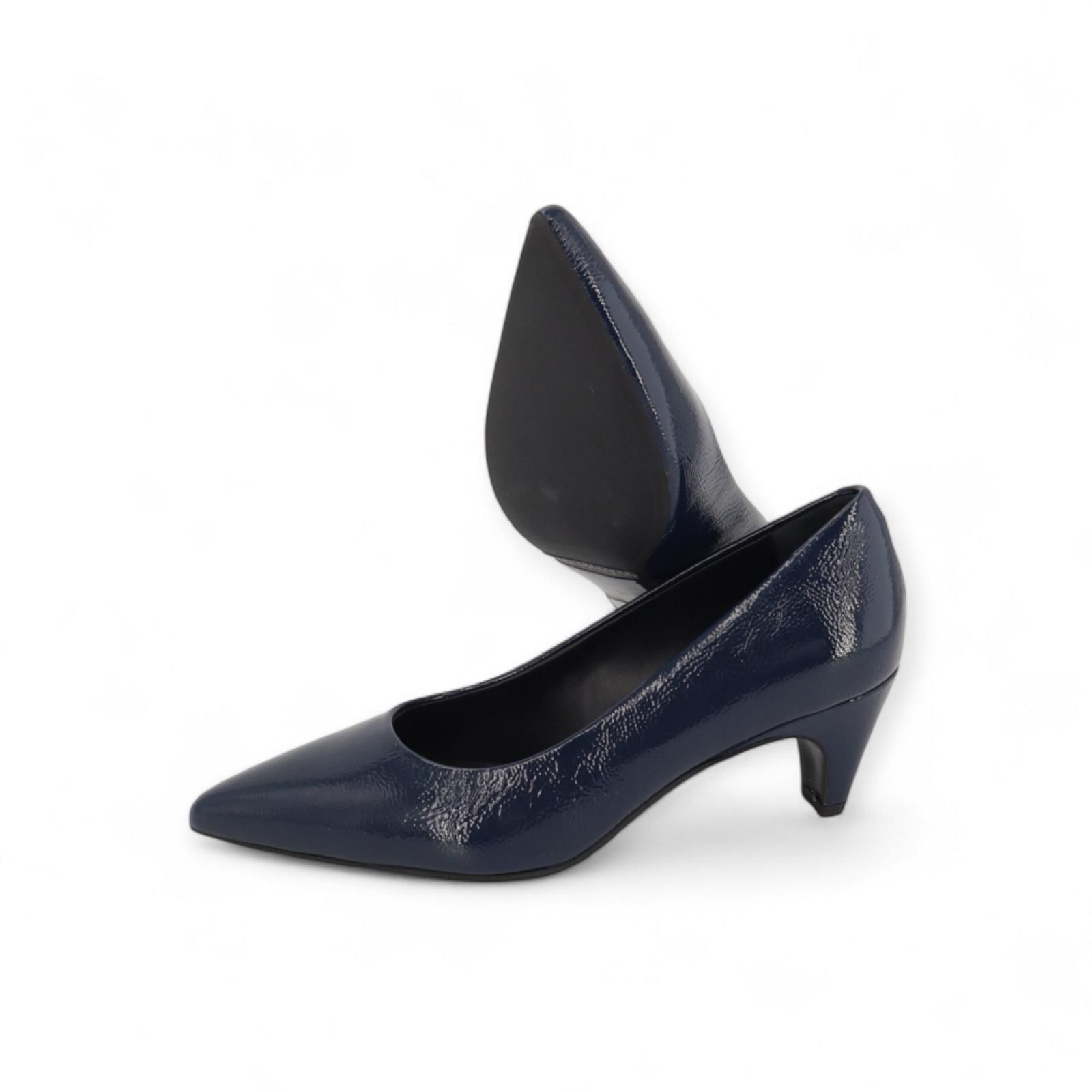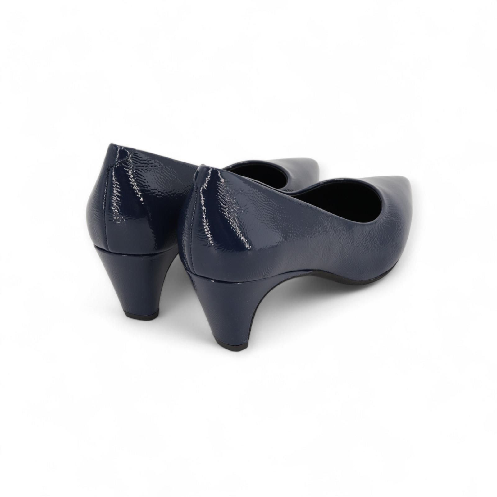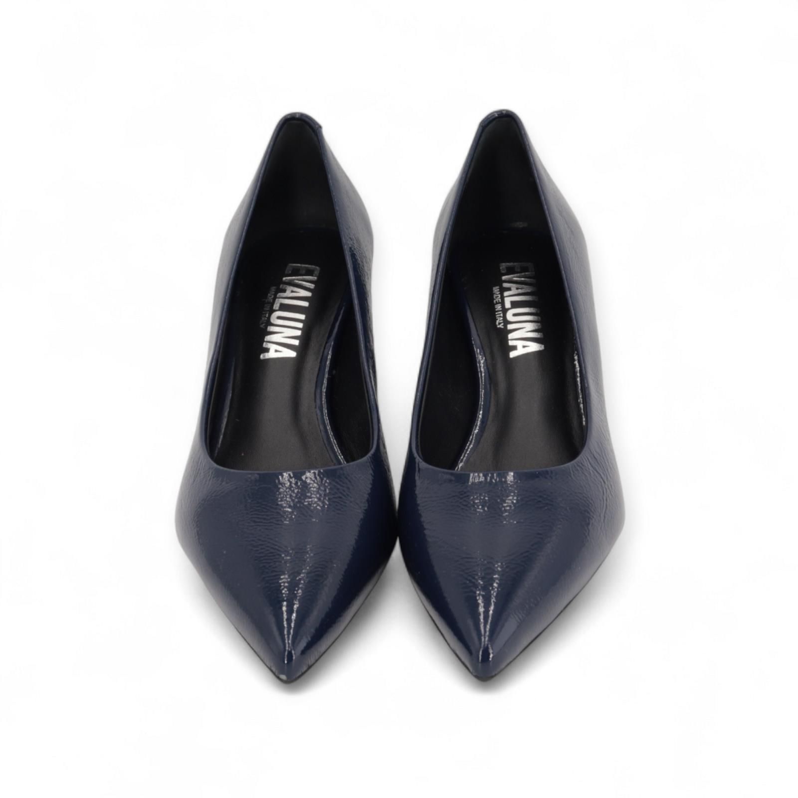 Pump 5548 van Evaluna voor dames. Deze elegante pump is in blauw lakleer. Heeft een scherpe top en een fijn hakje van 4cm hoog op een zwarte antislipzool.