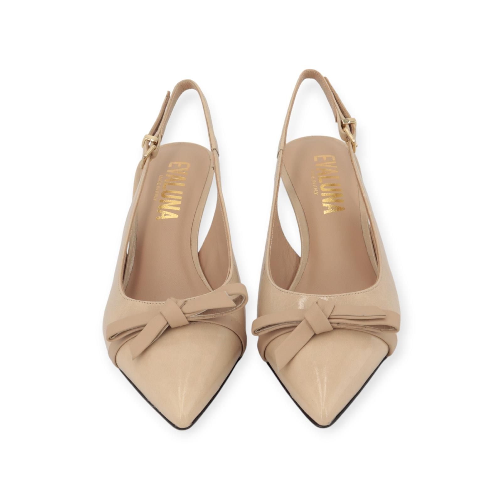 Pump 5618 van Evaluna voor dames. Deze elegante slingback is in nude shining suède met een scherpe neus. Heeft een leren beige strikje over de wreef. Is met een bandje rond de open hiel die mooi aan de voet blijft met een elastiek. Is op een leren buitenzool met een schuin (vernieuwd) fijn hakje van 5-5.5cm hoog.