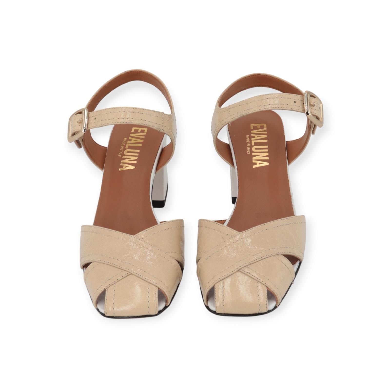 Sandaal 6313 van Evaluna voor dames. Deze sandaal is in beige craquelé lakleer met een carré neus. Is met gekruiste, gesloten bandjes over de wreef. Blijft mooi vast aan de voet door het bandje rond de hiel en enkel met gouden gespsluiting. Heeft een blokhakje in wit lakleer van 5-5.5cm hoog met een leren buitenzool.