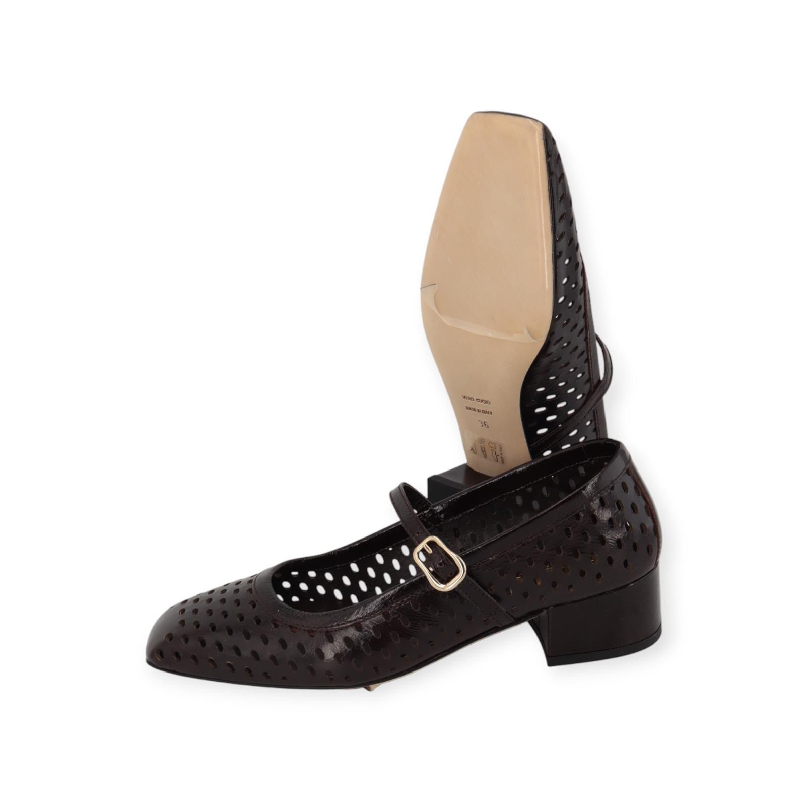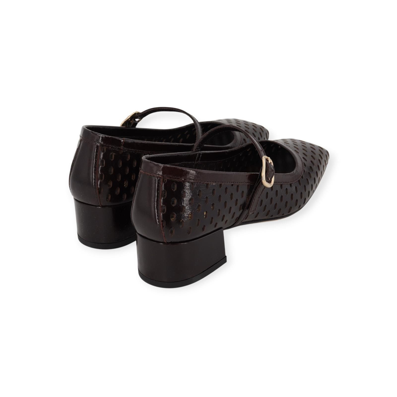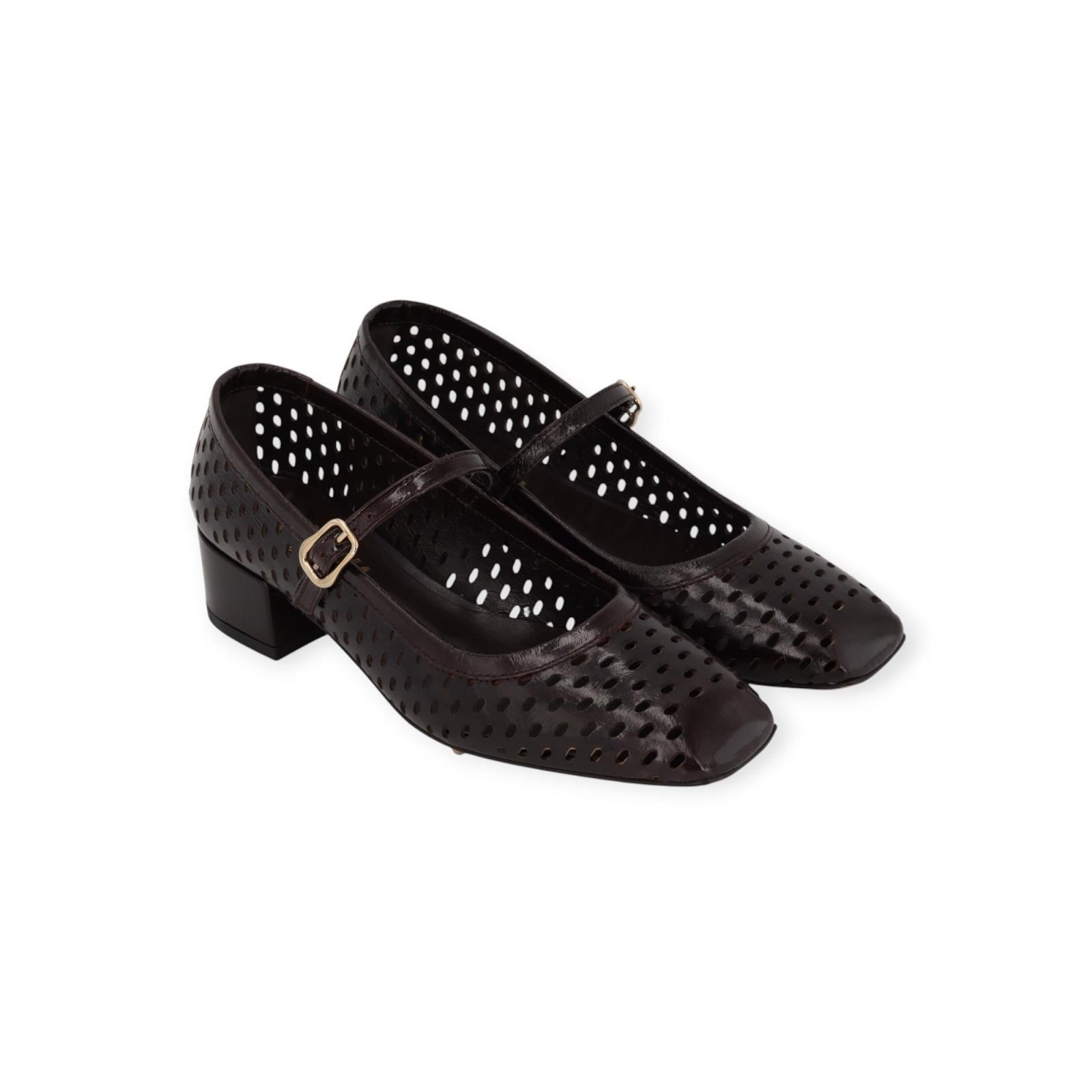 Ballerina CA04 van Evaluna voor dames. Deze geklede ballerina is in bruin geperforeerd lakleer. Heeft een carré neus met als extra detail een bandje over de wreef met gouden gespsluiting. Is op een aangenaam blokhakje van 4cm hoog met een leren buitenzool.