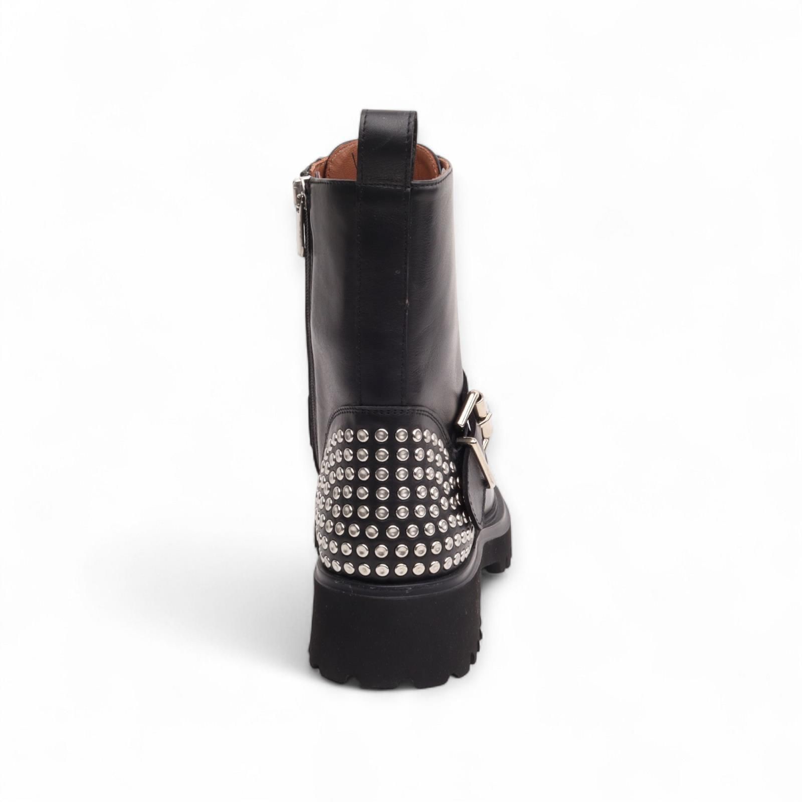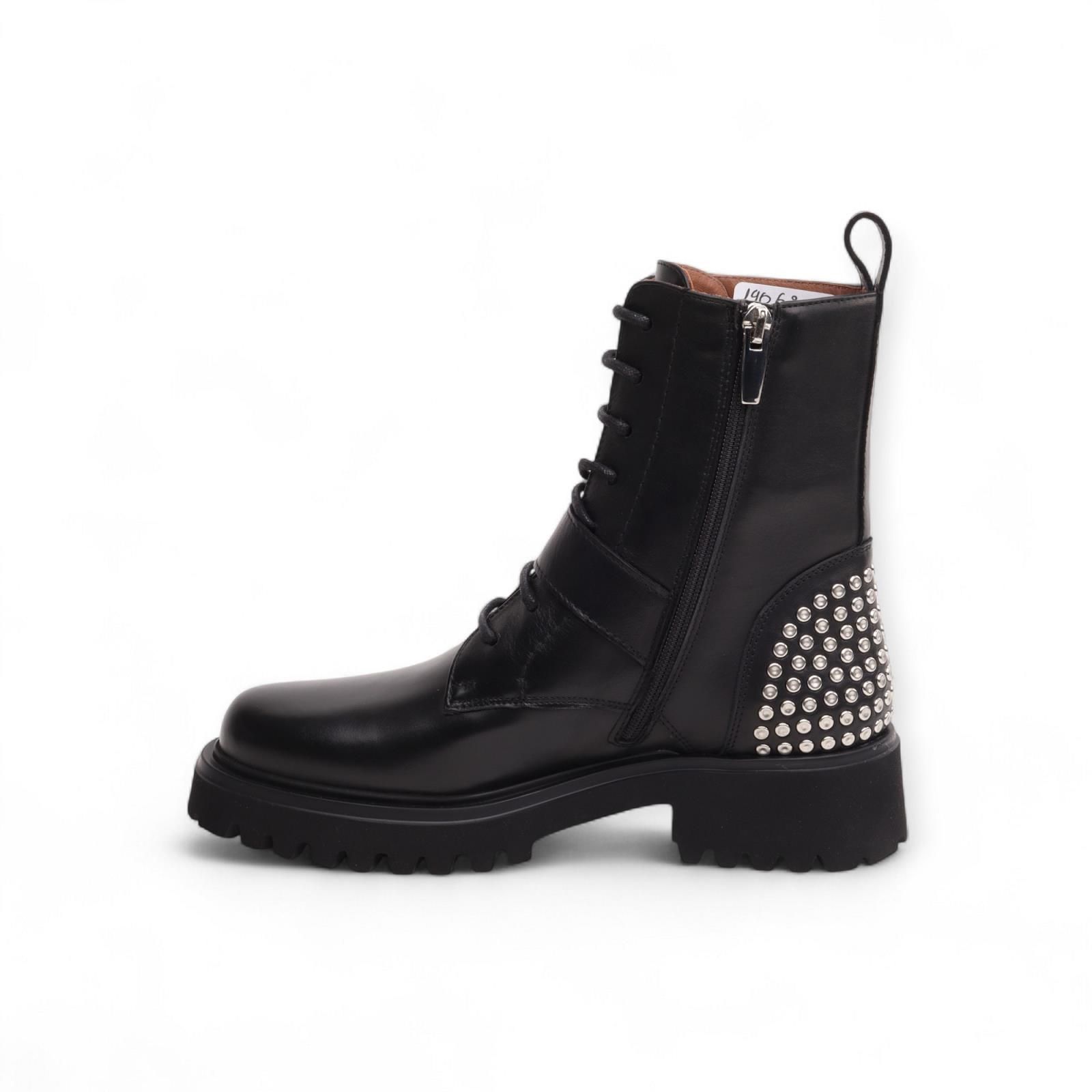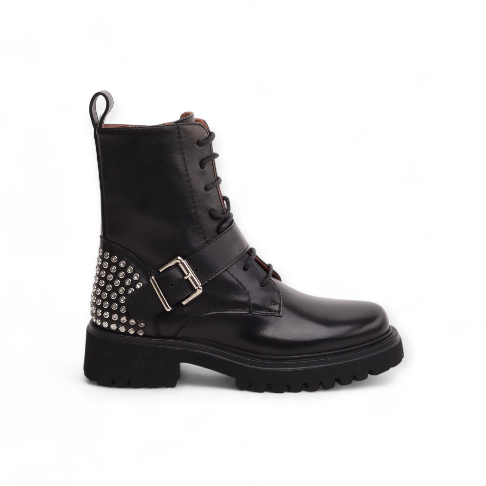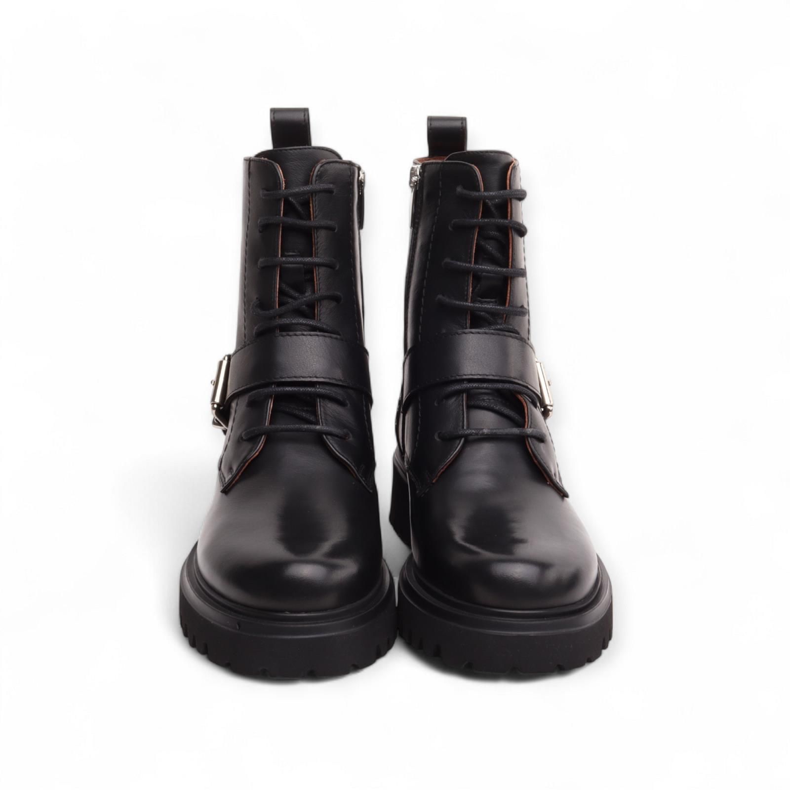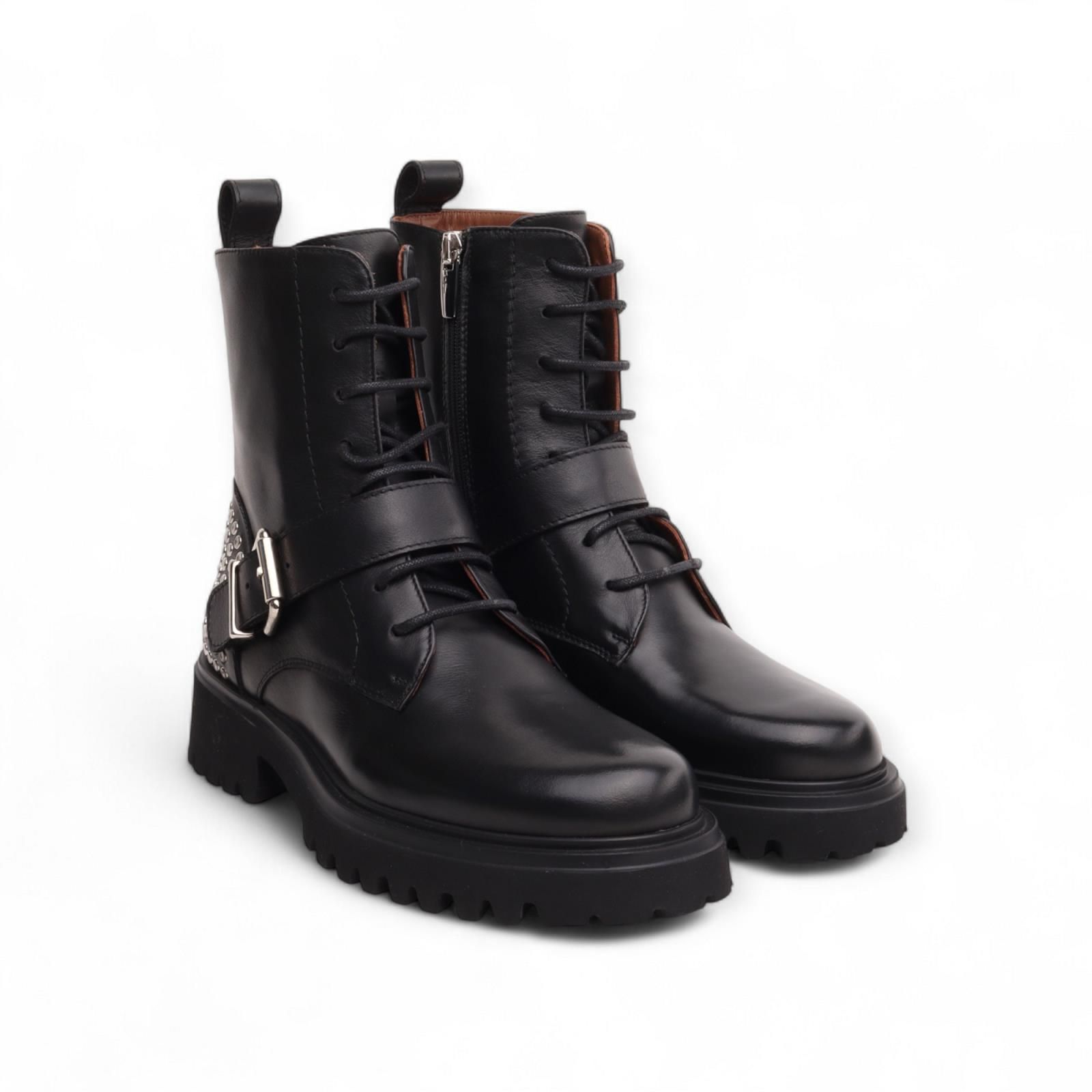 Enkellaars Iris van Evaluna voor dames. Deze boot is in zwart leder. Heeft een ritssluiting en veters. De veters zijn bedekt met een gespsluiting in zilver alsook de hiel. Is op een dikke zool die voor nog meer comfort zorgt.