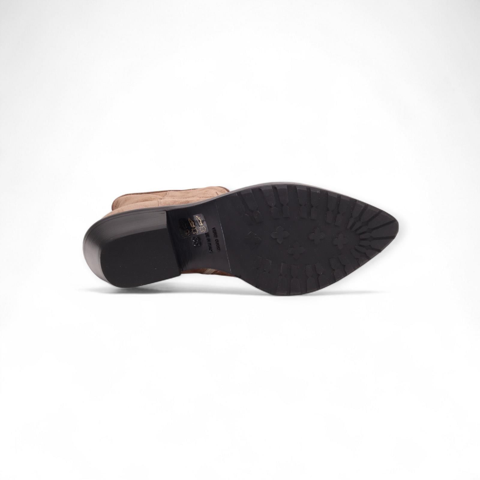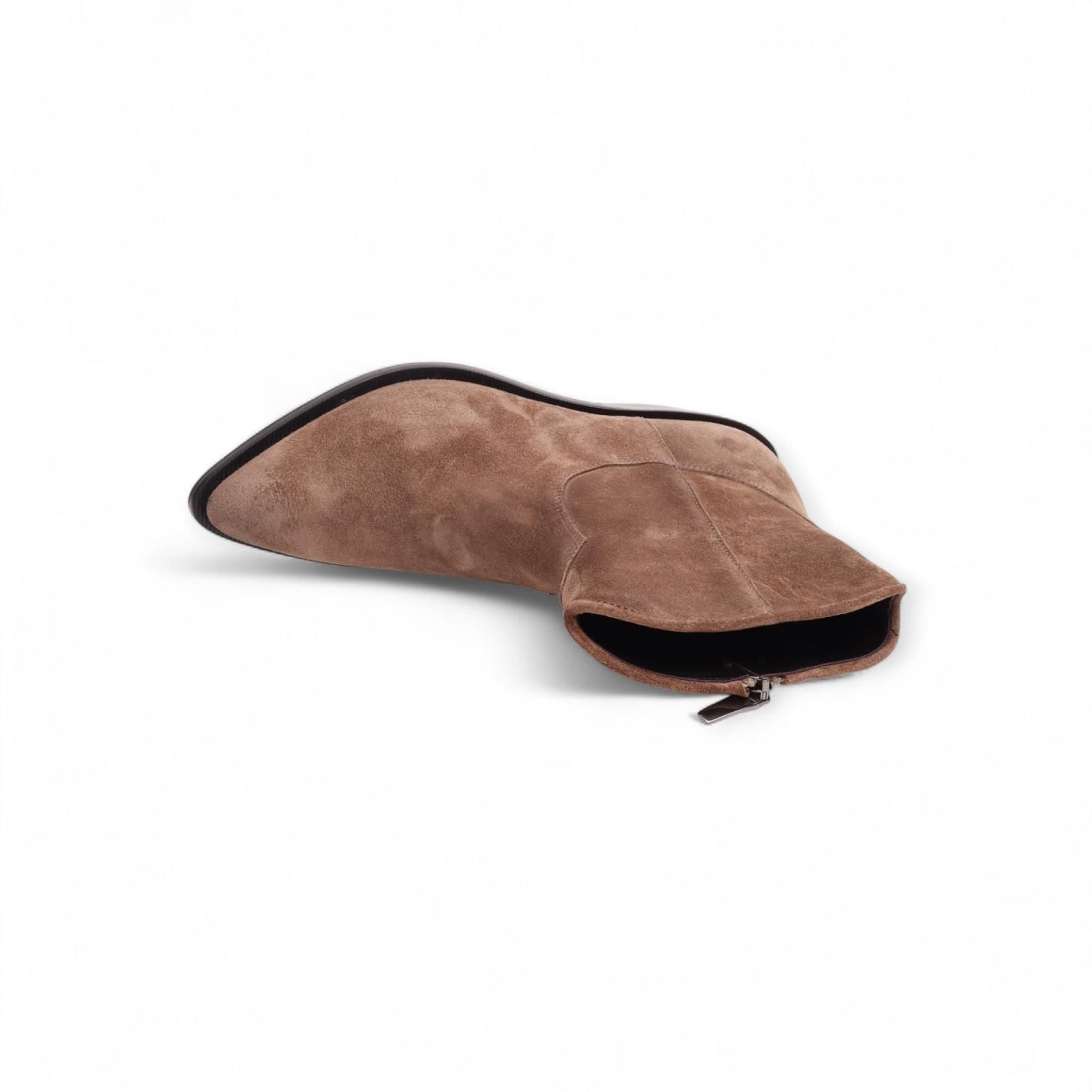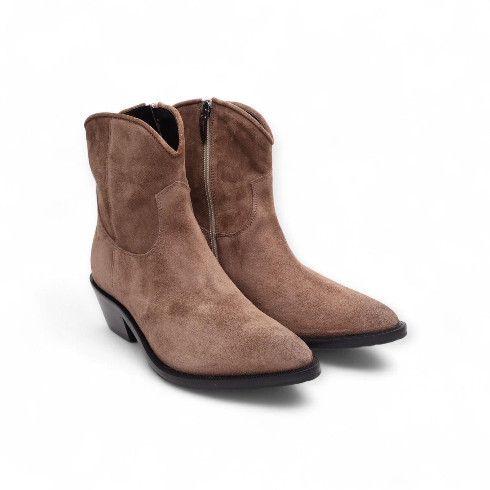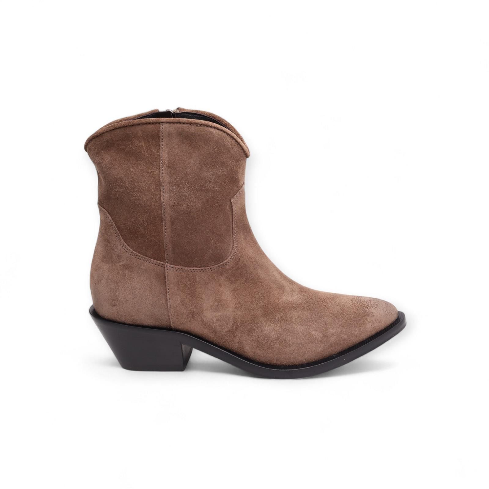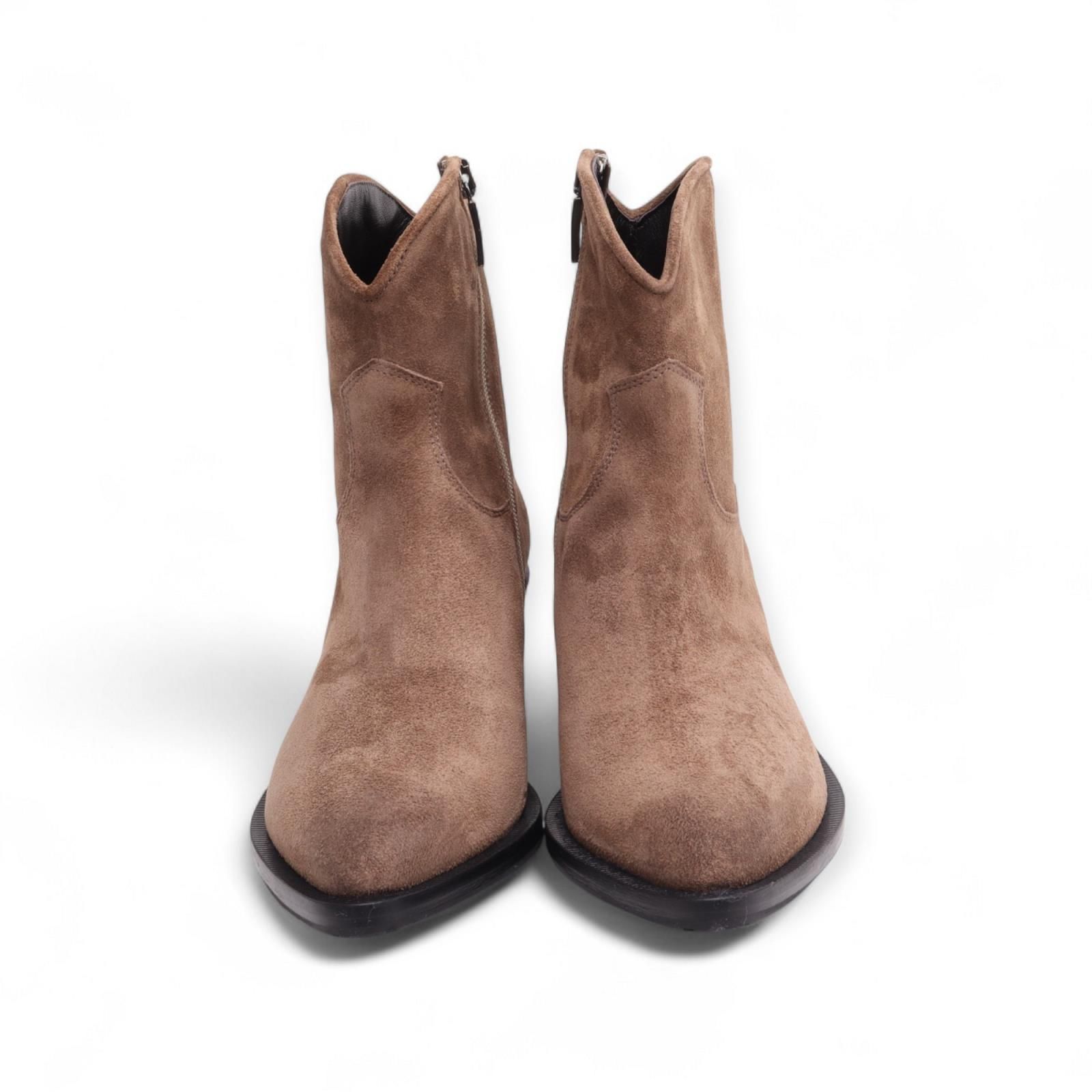 Enkellaars van Faire voor dames. Dit western enkellaarsje is in taupe suède. Is met een ronde schacht en komt tot aan de kuit. Heeft een scherpe top en een klein blokhakje van 3-3.5cm hoog.