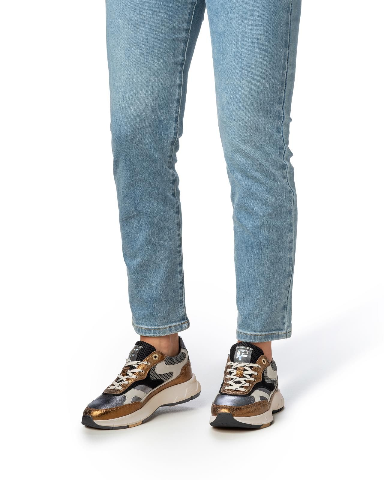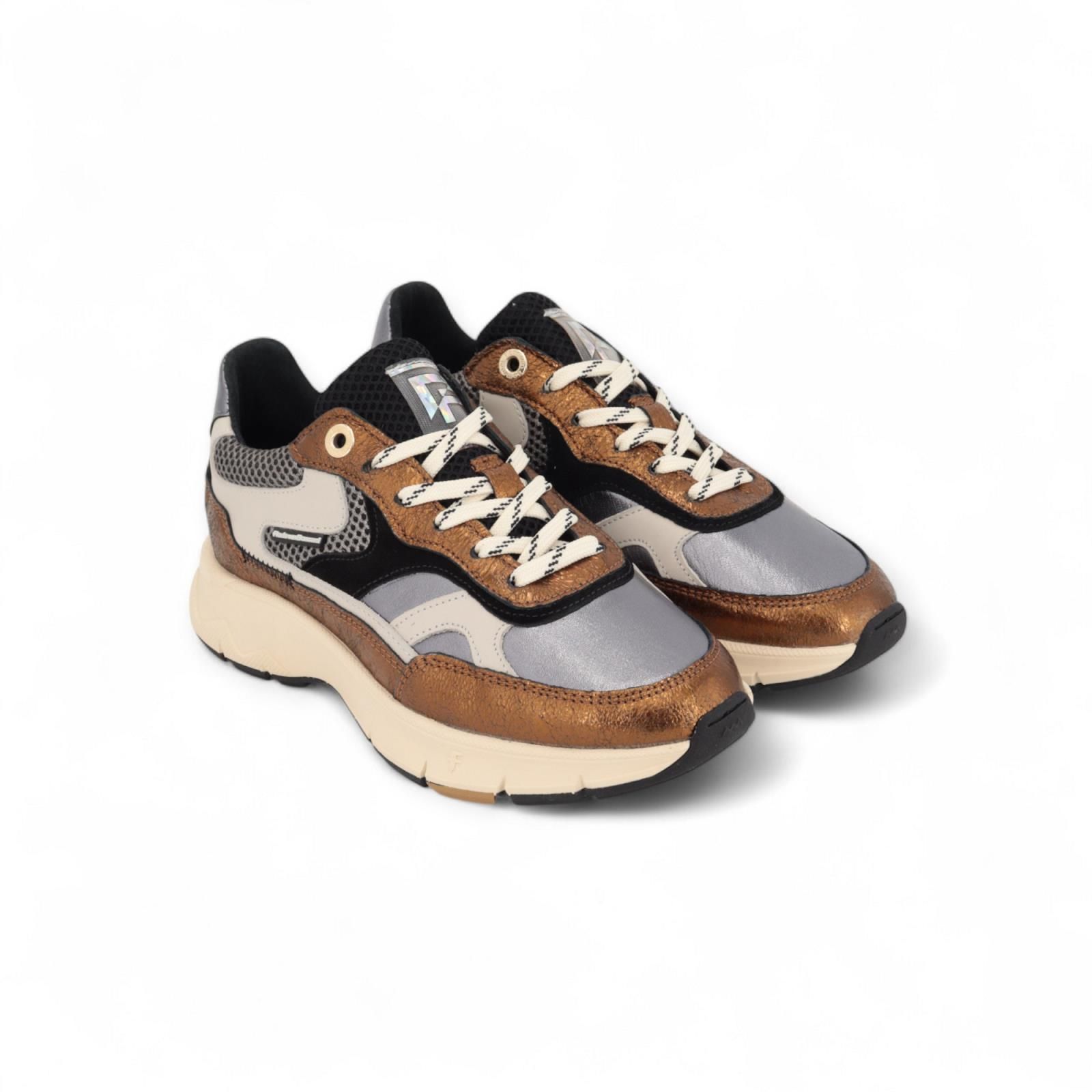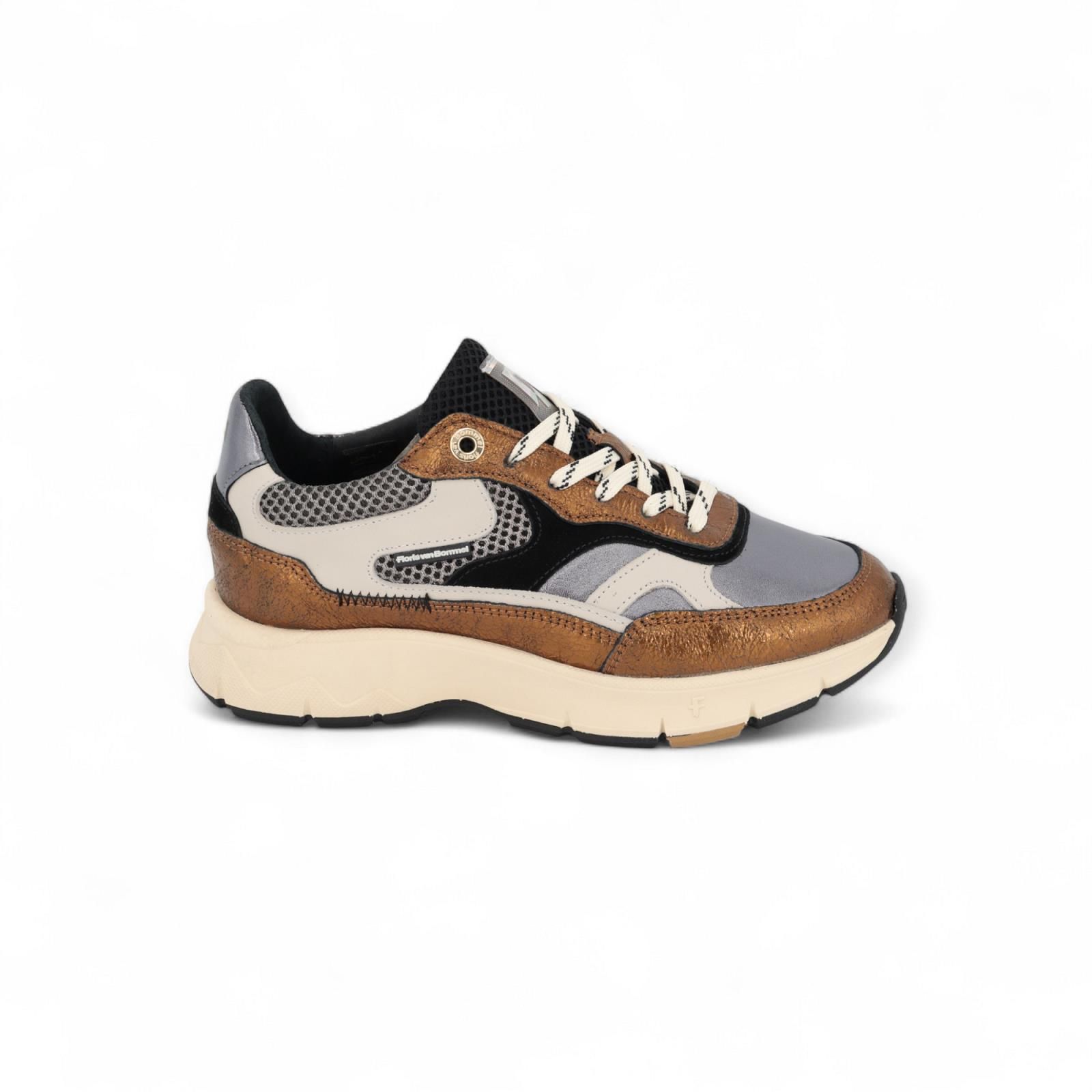 Sneaker Daysi 03.09 van Floris Van Bommel voor dames. Deze runner is ontworpen op een lichtgewicht sportzool. Is met een kenmerkende Floris zigzagbelijning bij de hiel. De runner is uitgevoerd in een mix van brons shining en offwit leer met zilver zwart mesh. De binnenkant is uit leer en is met een uitneembare zool.
