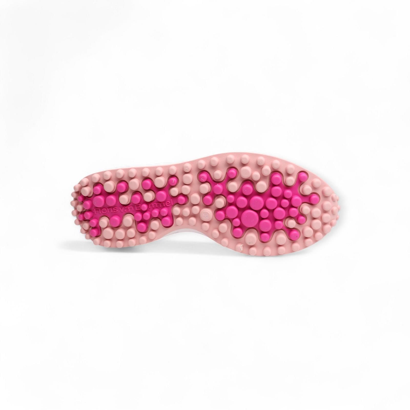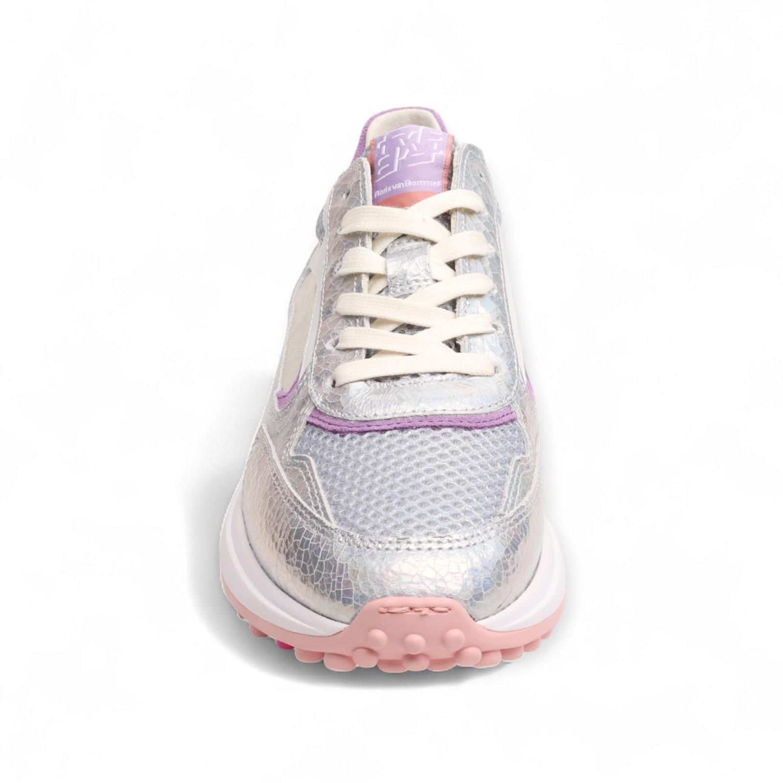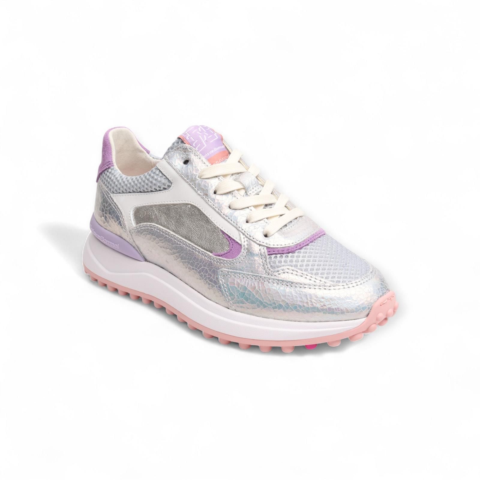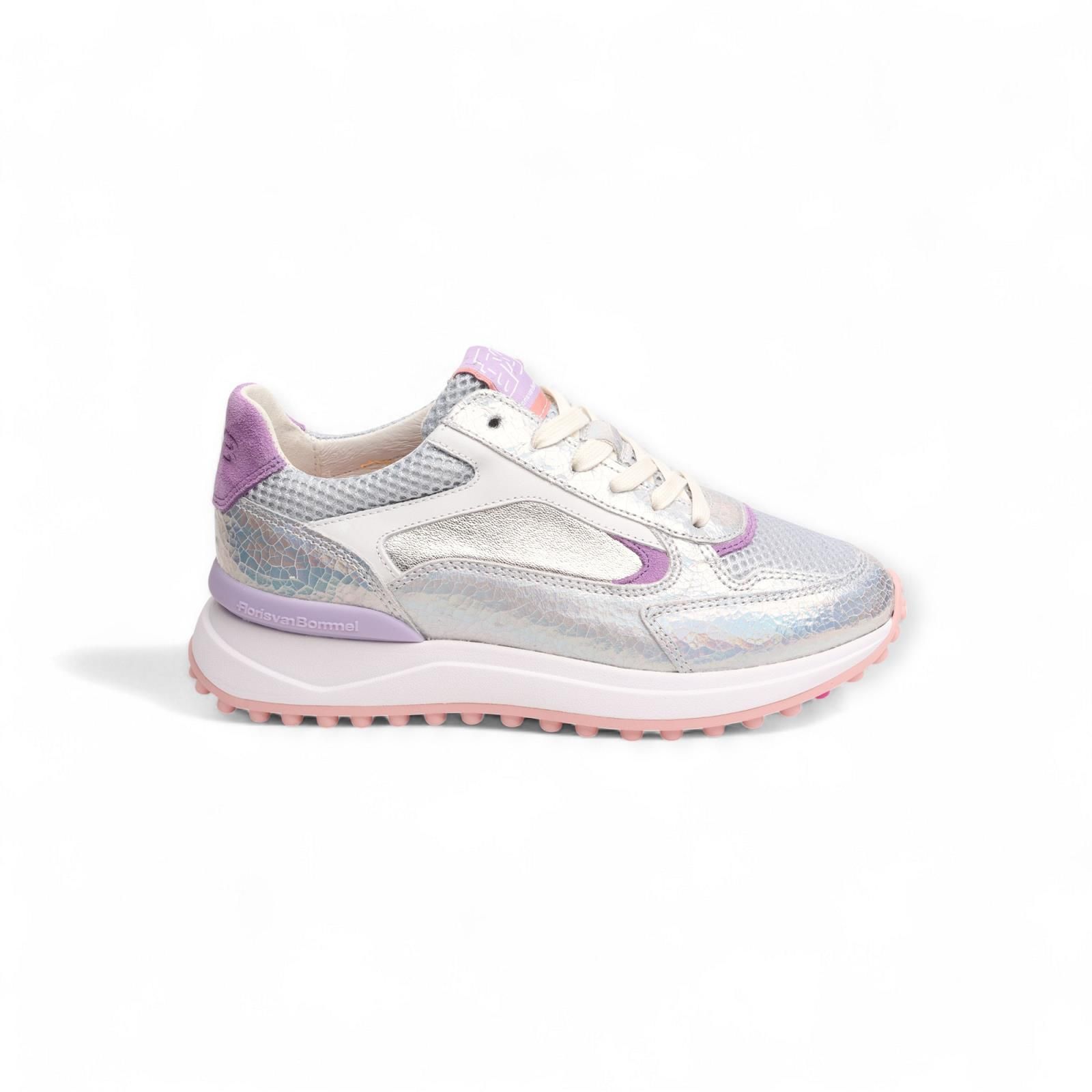 Sneaker Noppi van Floris van Bommel voor dames. De lichtgewicht zool is voorzien van een slijtvast loopvlak met opvallende noppen. In het noppenpatroon is een kleurvlak aangebracht dat de zool nog net wat meer eigen maakt. Deze variant is uitgevoerd in een rijke mix van leder materialen in zilver en lila kleuren. De binnenzool is uitneembaar.