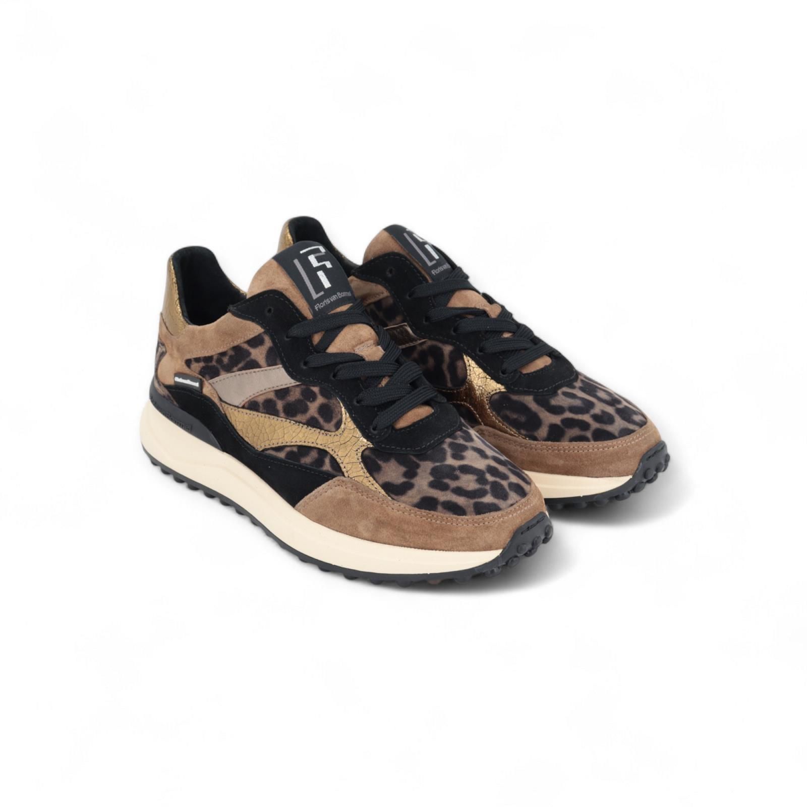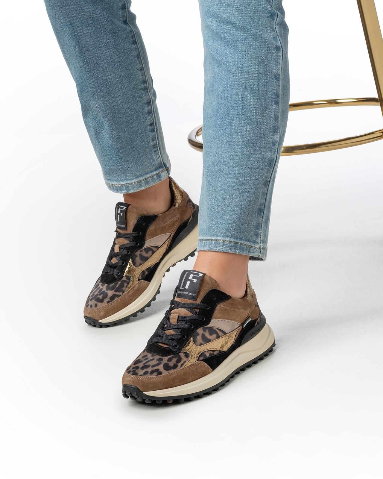 Sneaker Noppi 41.02 van Floris Van Bommel voor dames. Deze noppi sneaker is in een rijke mix van materialen in leopard met bruine en zwarte tinten. Aan de achterkant is de hielflap in brons met het logo F. De lichtgewicht zool is voorzien van een slijtvast loopvlak met opvallende noppen. Draagcomfort is gegarandeerd dankzij een zorgvuldig ontworpen leest, hoogwaardige lederen voering en een uitneembaar voetbed.