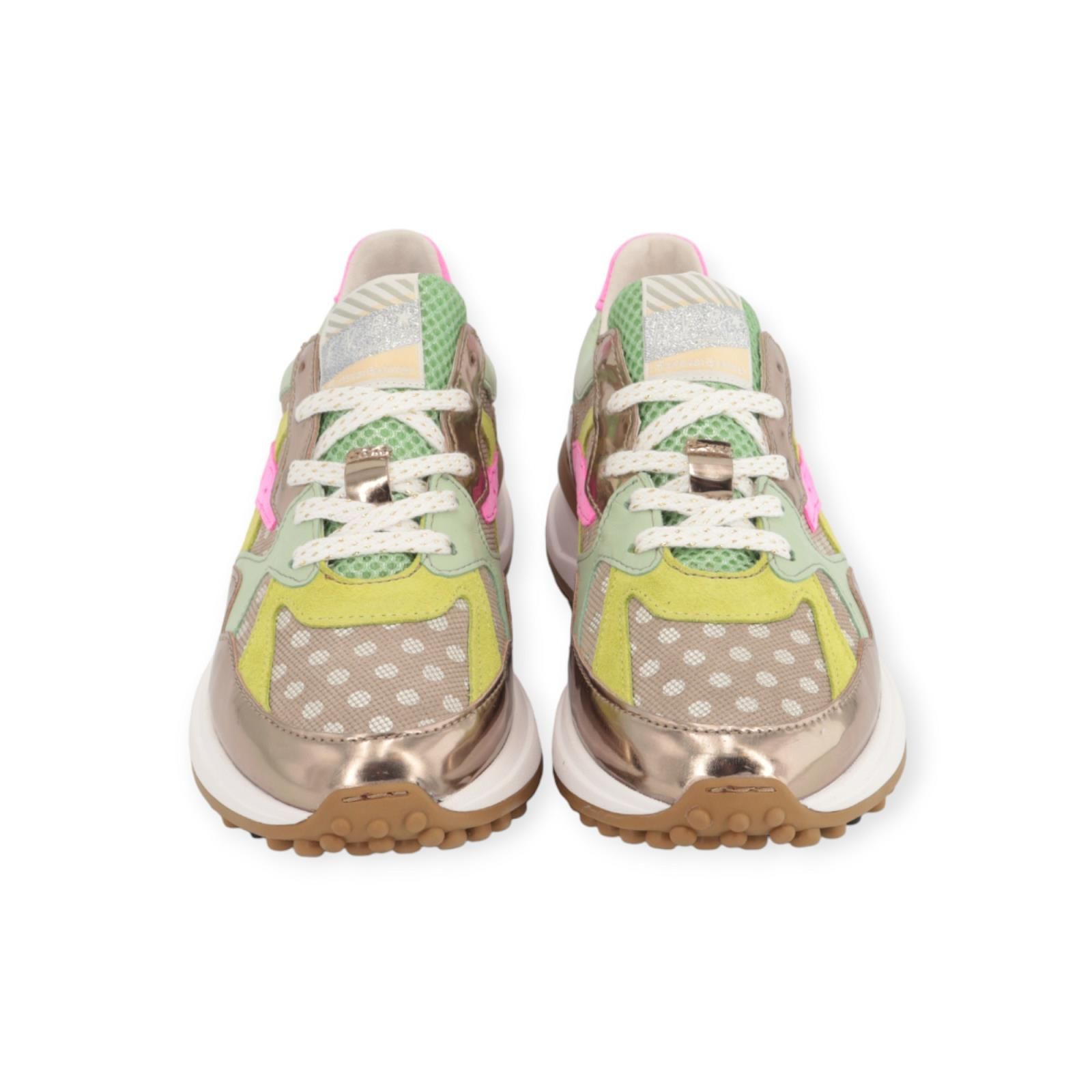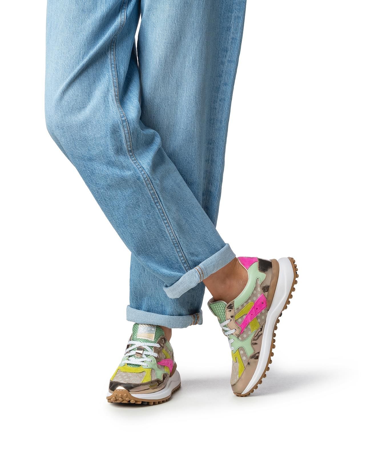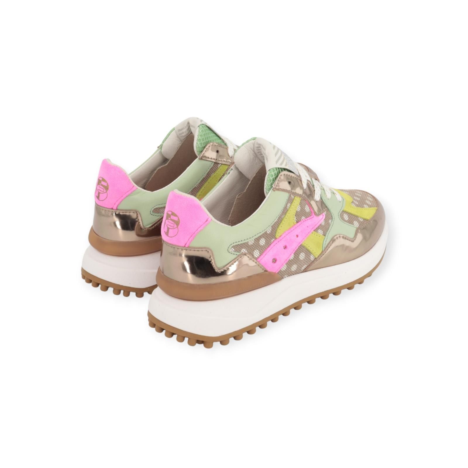 Sneaker Noppi 46.08 van Floris Van Bommel voor dames. Deze runner is in een rijke mix van materialen en kleuren. Brons met geprint suède in beige en verschillende texturen roze, groen, geel in suède en leer. Een echte eyecatcher! De lichtgewicht zool is voorzien van een slijtvast loopvlak met opvallende noppen. Draagcomfort is gegarandeerd dankzij een zorgvuldig ontworpen leest, hoogwaardige lederen voering en een uitneembaar voetbed.