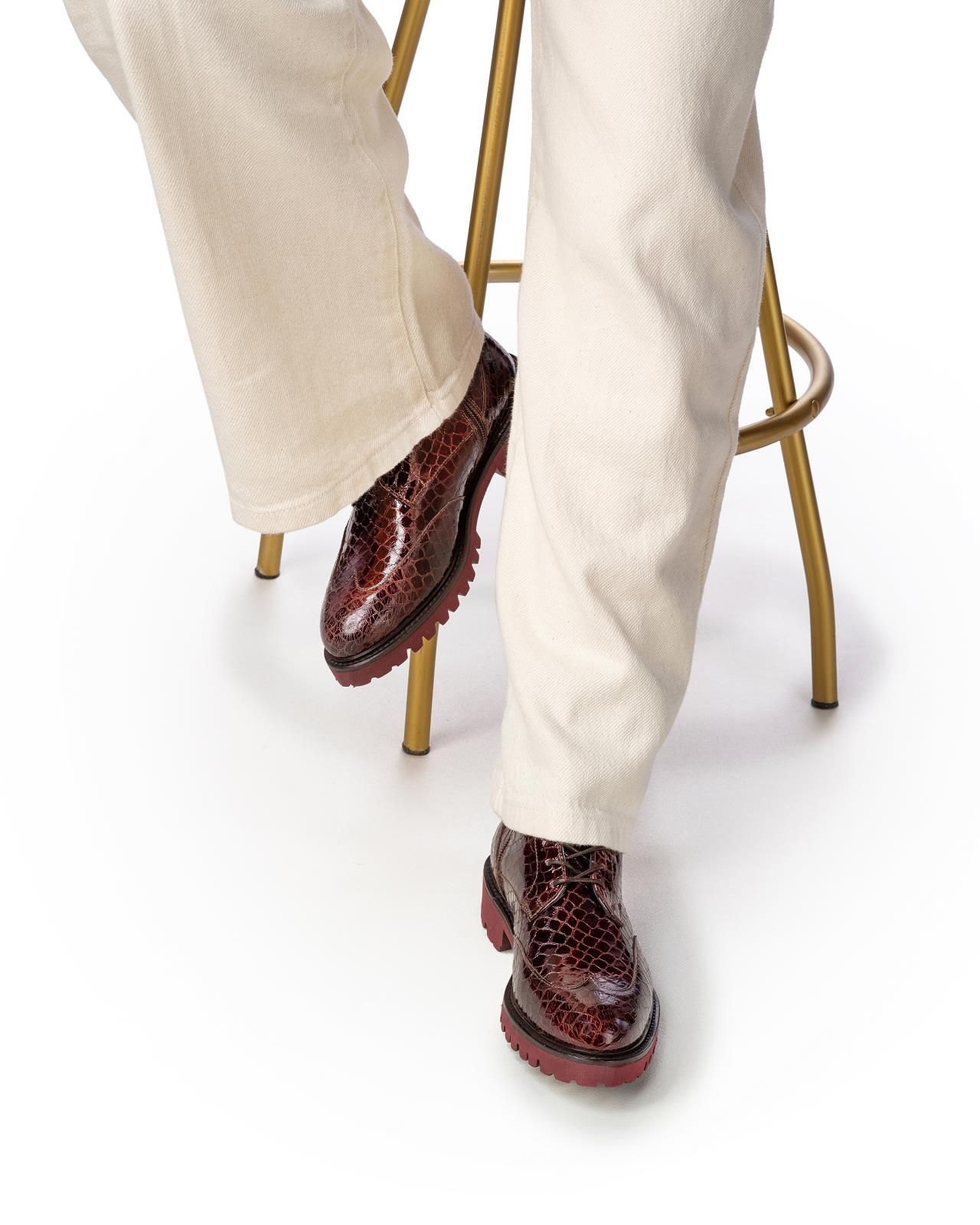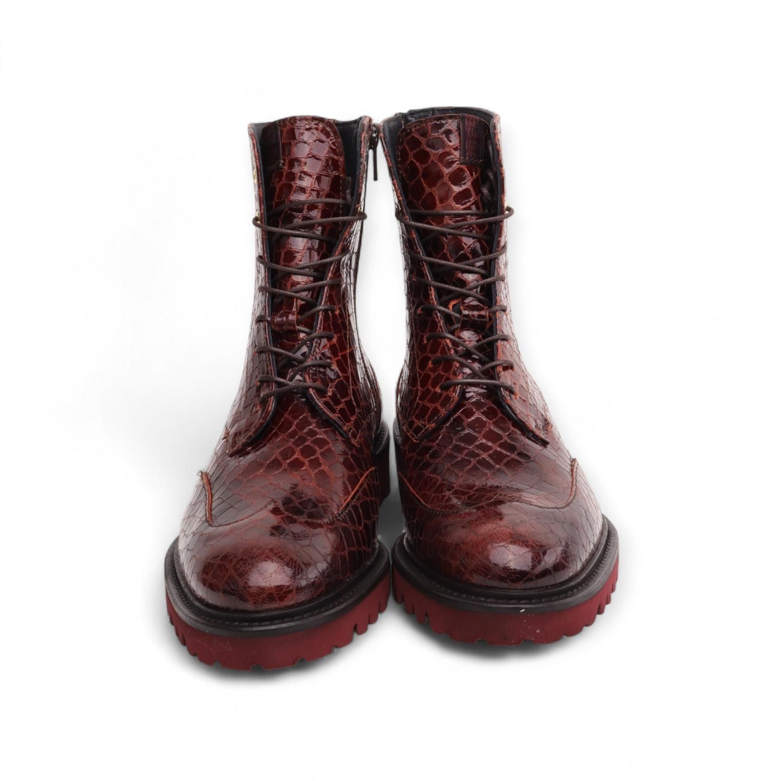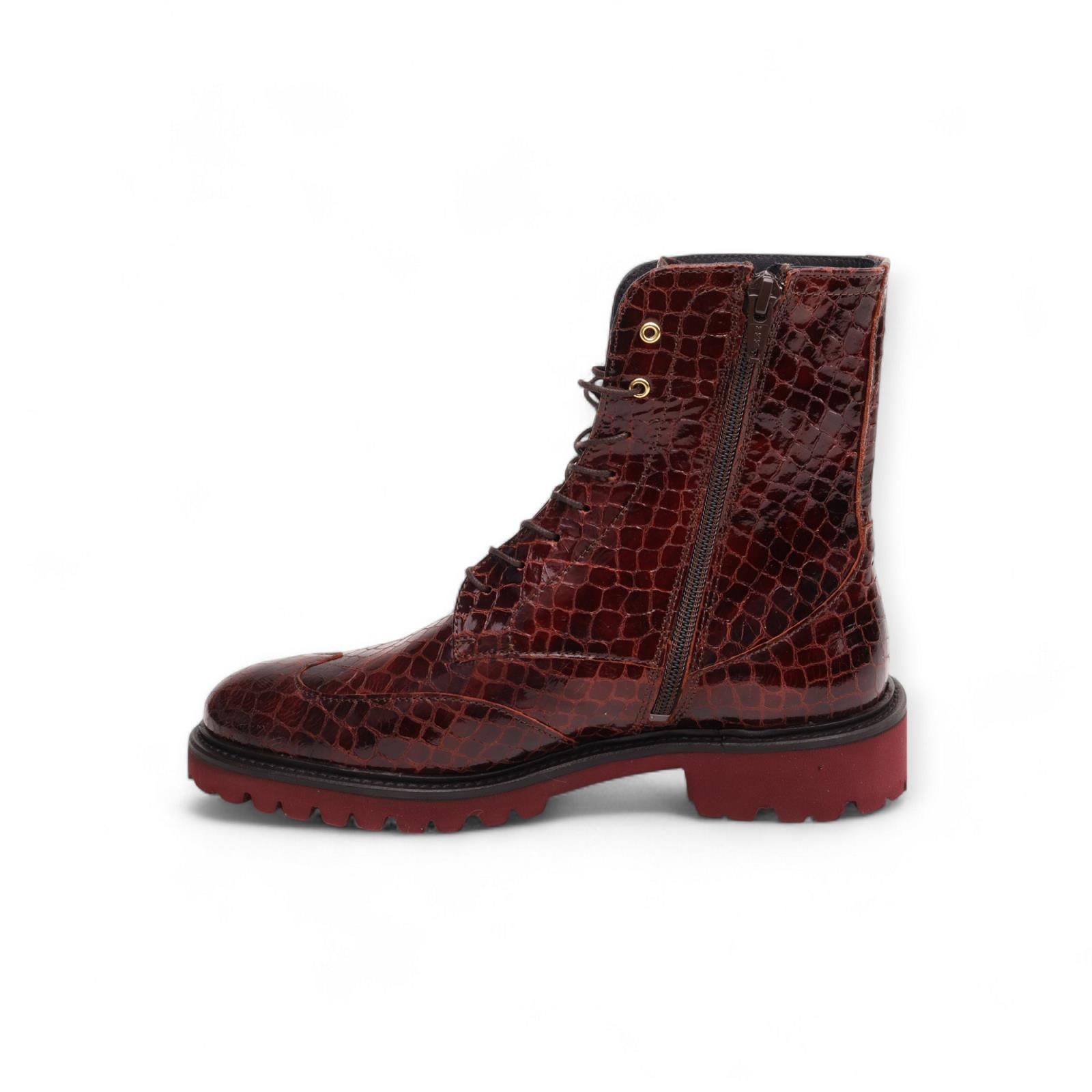 Enkellaarsje Selsi van Floris van Bommel voor dames. Deze enkelboot is gemaakt van super licht EVA materiaal. Aan de zijkant van de is een rits voorzien. Bij de enkel is een lederen inzet geplaatst met het Floris van Bommel logo. De schoen is gevoerd met topkwaliteit voering van dun geitenleer. Het bovenwerk is gemaakt van zacht metallic leer met een mat glanzend, bordeaux two-tone effect. De binnenzool is uitneembaar.