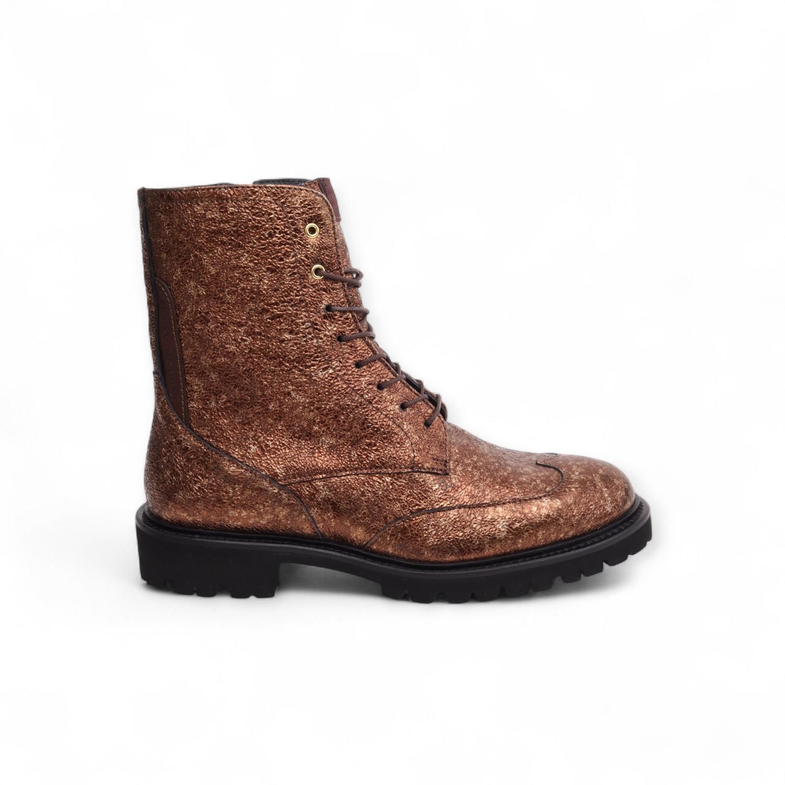 Enkellaarsje Selsi van Floris van Bommel voor dames. Deze enkelboot is gemaakt van super licht materiaal. Aan de zijkant van de is een rits voorzien. Bij de enkel is een lederen inzet geplaatst met het Floris van Bommel logo. De schoen is gevoerd met topkwaliteit voering van dun geitenleer. Het bovenwerk is gemaakt van zacht metallic leer met een mat glanzend, brons two-tone effect. De binnenzool is uitneembaar.
