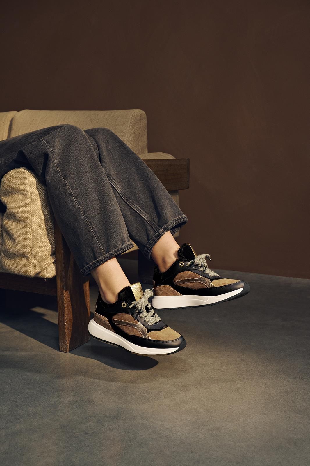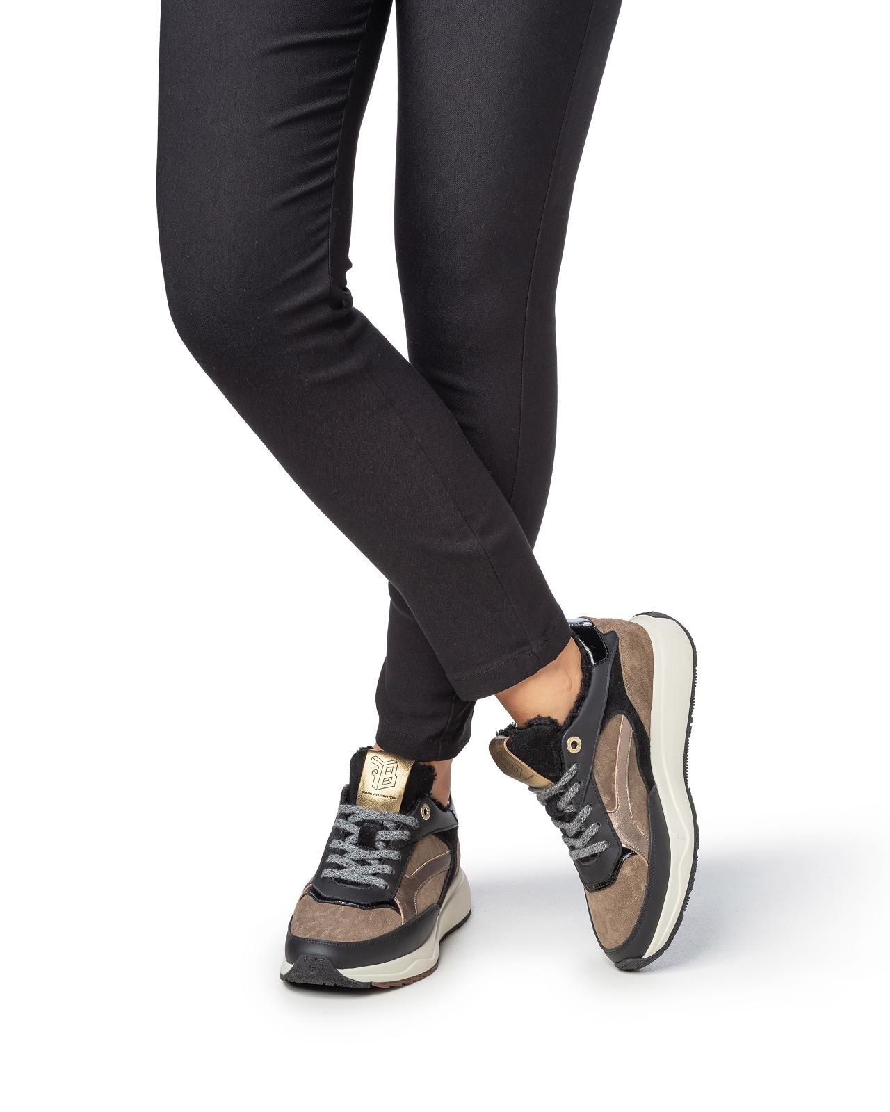 Sneaker Suvi 02.11 van Floris Van Bommel voor dames. Deze sneaker is in brons suède met gouden details in het suède. Afgewerkt met zwart leer en shining gouden leren stiksels. De hielflap in zwart lakleer en zorgt voor een luxueuse uitstraling. Heeft een aangename zool met een uitneembare binnenzool. De binnenrand is afgewerkt met zwarte wol.