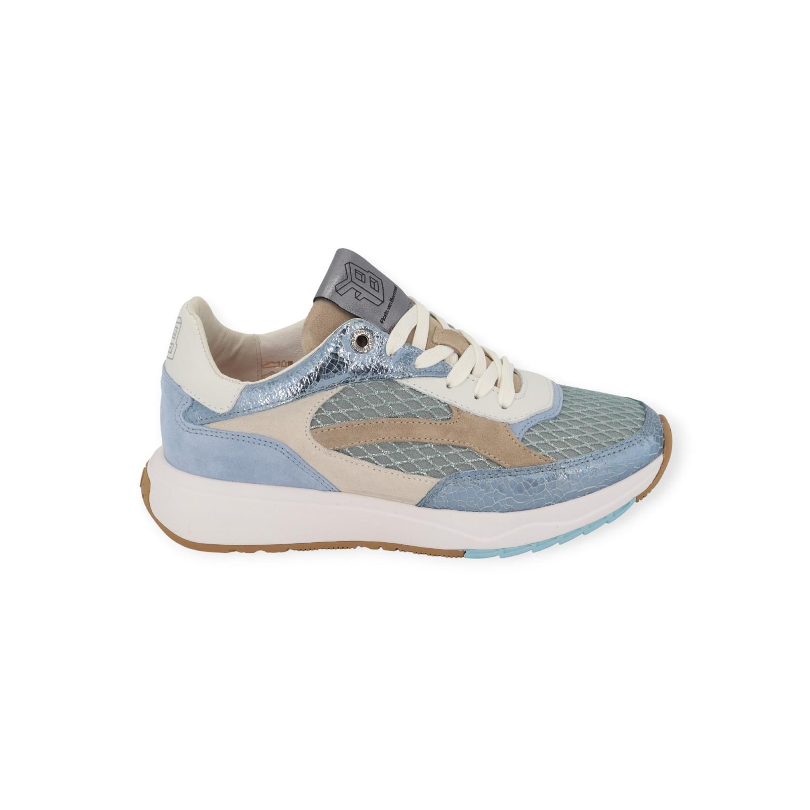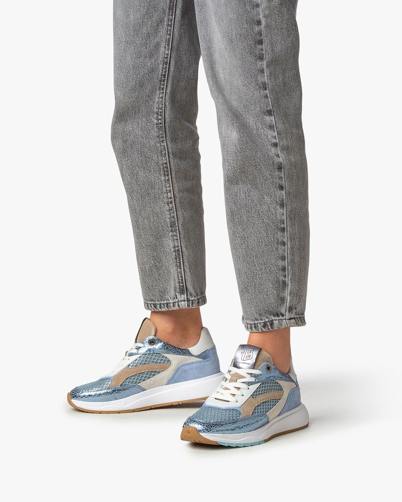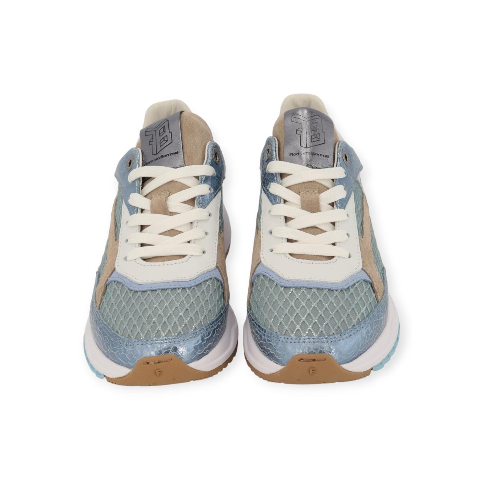 Sneaker Suvi 02.19 van Floris Van Bommel voor dames. Deze runner is in shining lichtblauw leer met beige suède en mesh. Het shining blauw leer op de voorvoet en zijkant is in crocco leer waar een glans op aangebracht is. De binnenzool is uitneembaar en is op een comfortabele, vaste zool.