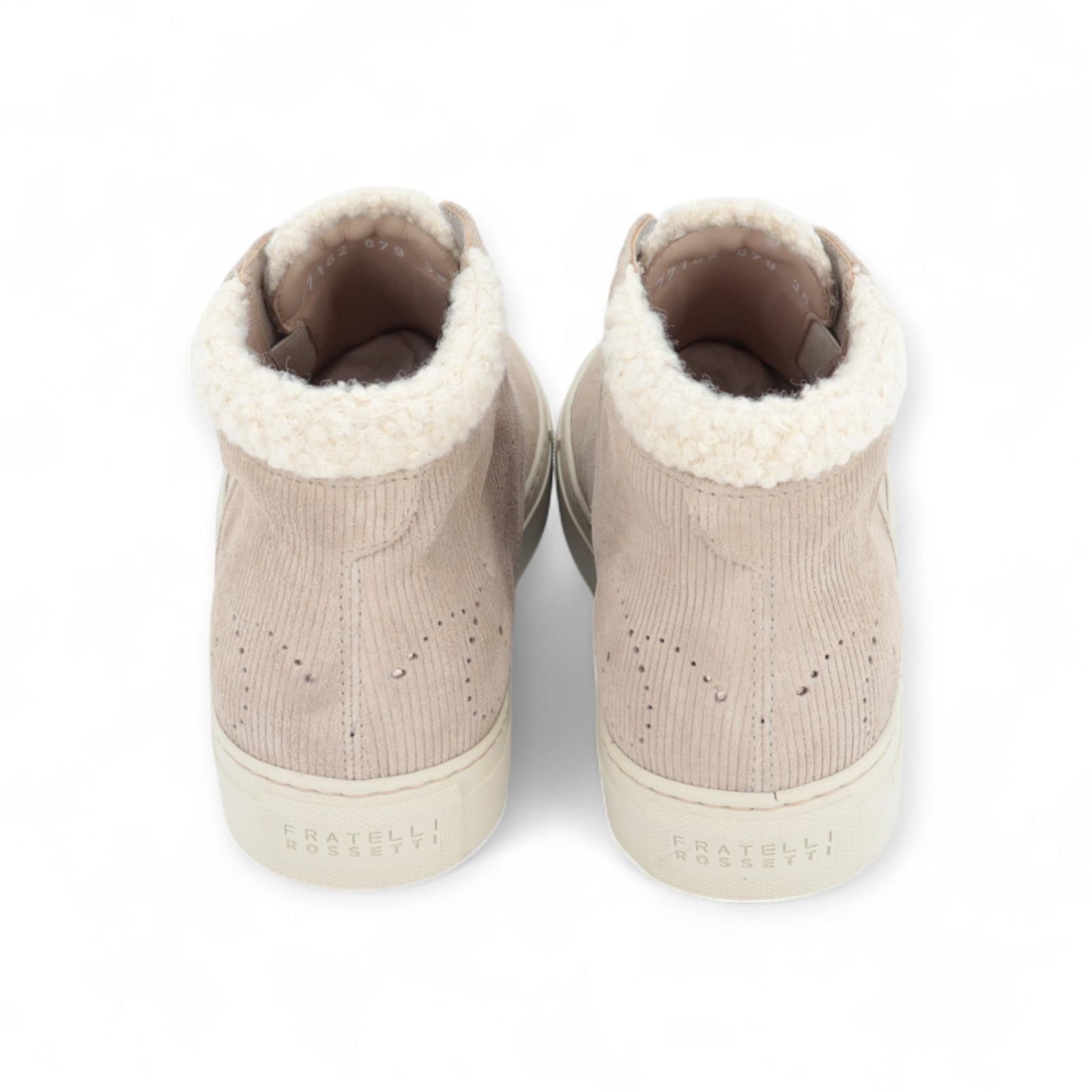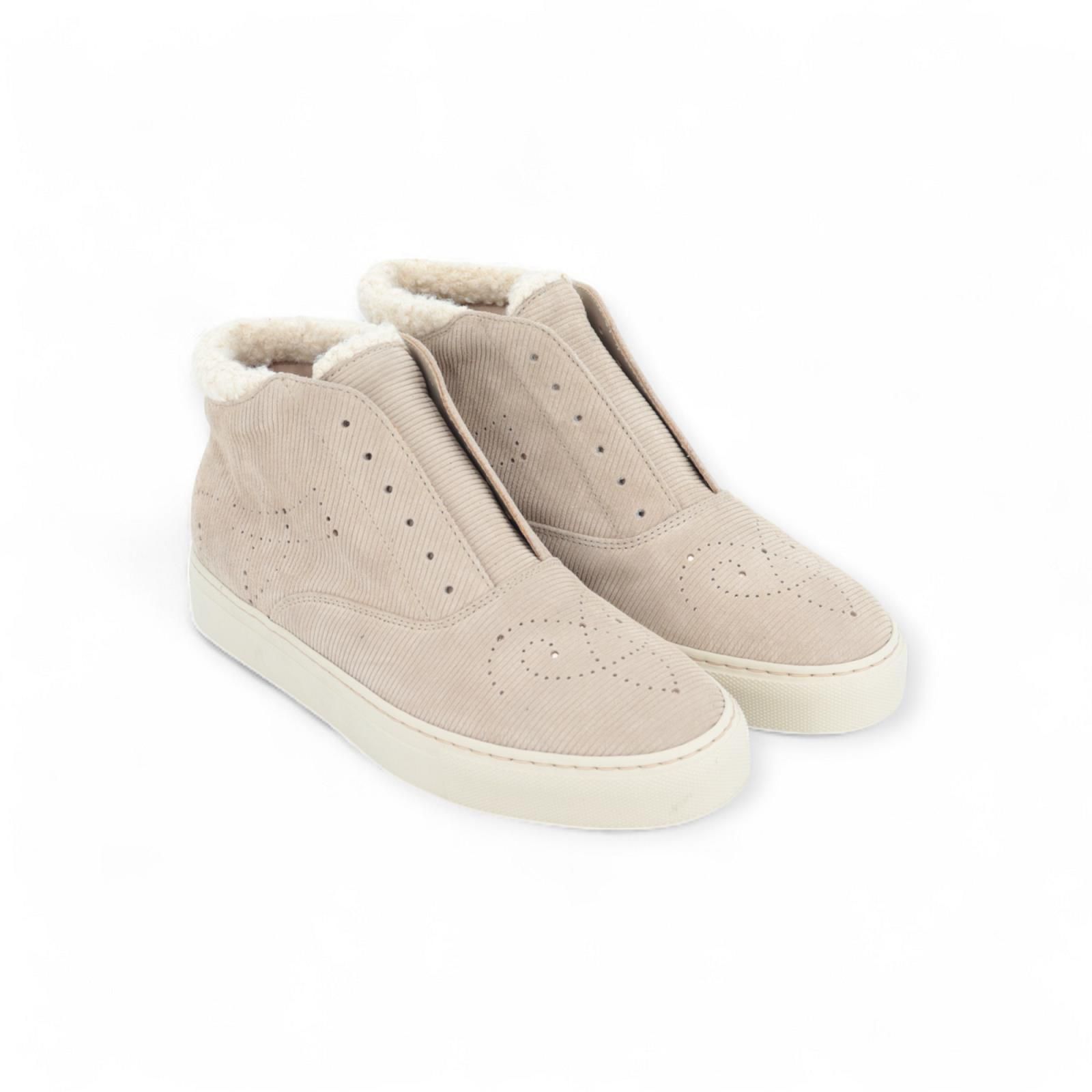 Sneaker Hobo van Fratelli Rossetti voor dames. Deze sneaker komt tot aan de enkel is in mooi zacht beige geribd suède met geperforeerde details en stiksels. Casual maar toch verfijnd elegant! Is bovenaan rond de enkel en flap afgewerkt met wol. Heeft een uitneembare en ademende binnenzool en is op een zachte rubberen off wit cupzool. Dit model is uit de Rossetti One collectie.