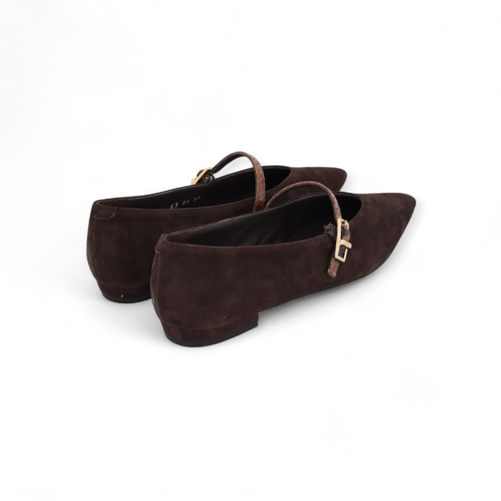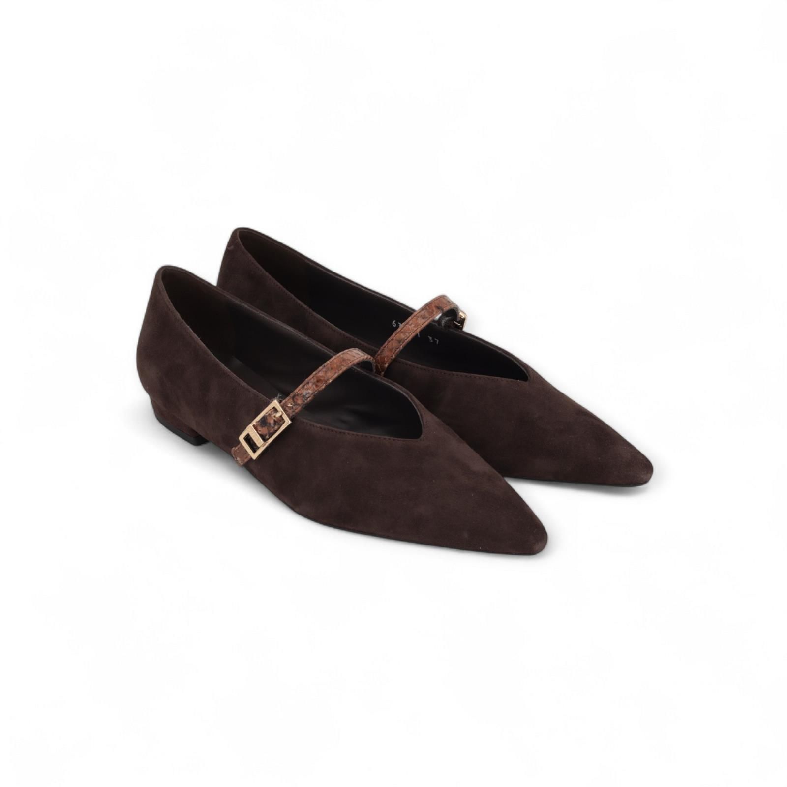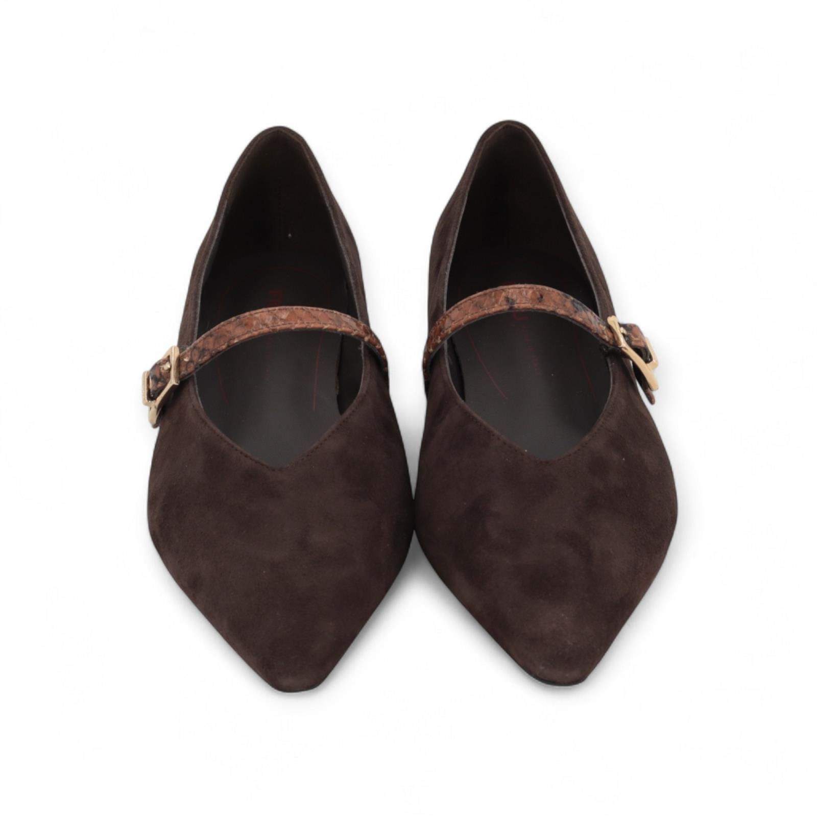 Mocassin 63A1 van Frau voor dames. Deze mocassin is in bruin suède. Is ver uitgesneden met een lichtscherpe punt. Heeft een bandje over de wreef in crocco print met metalen gespsluiting. Heeft een elegant antislipzooltje.