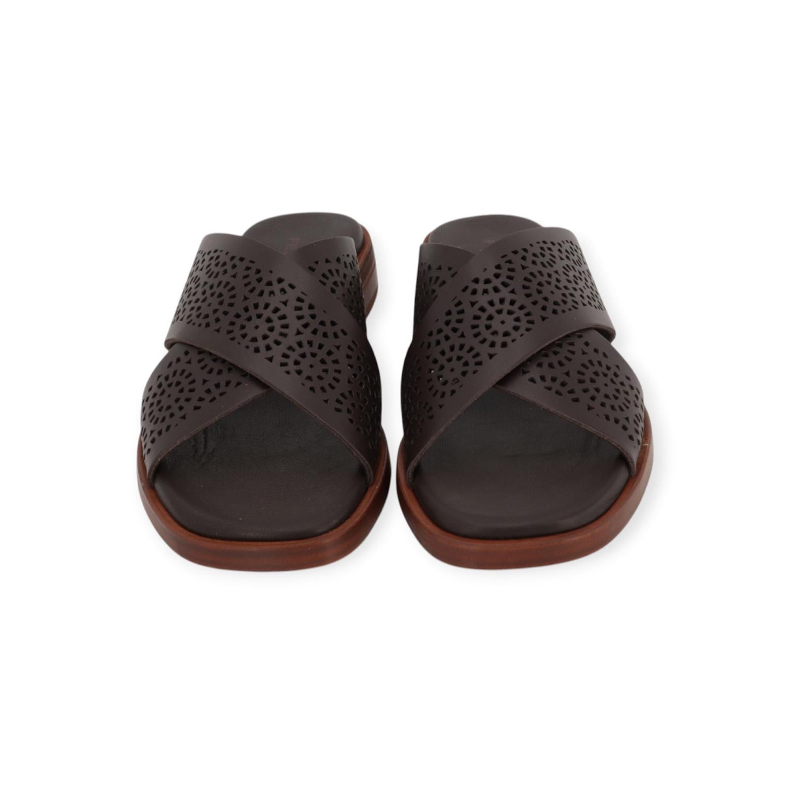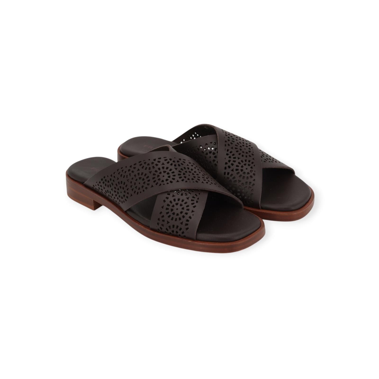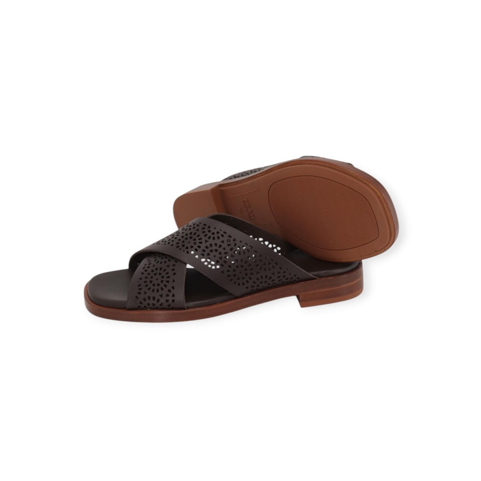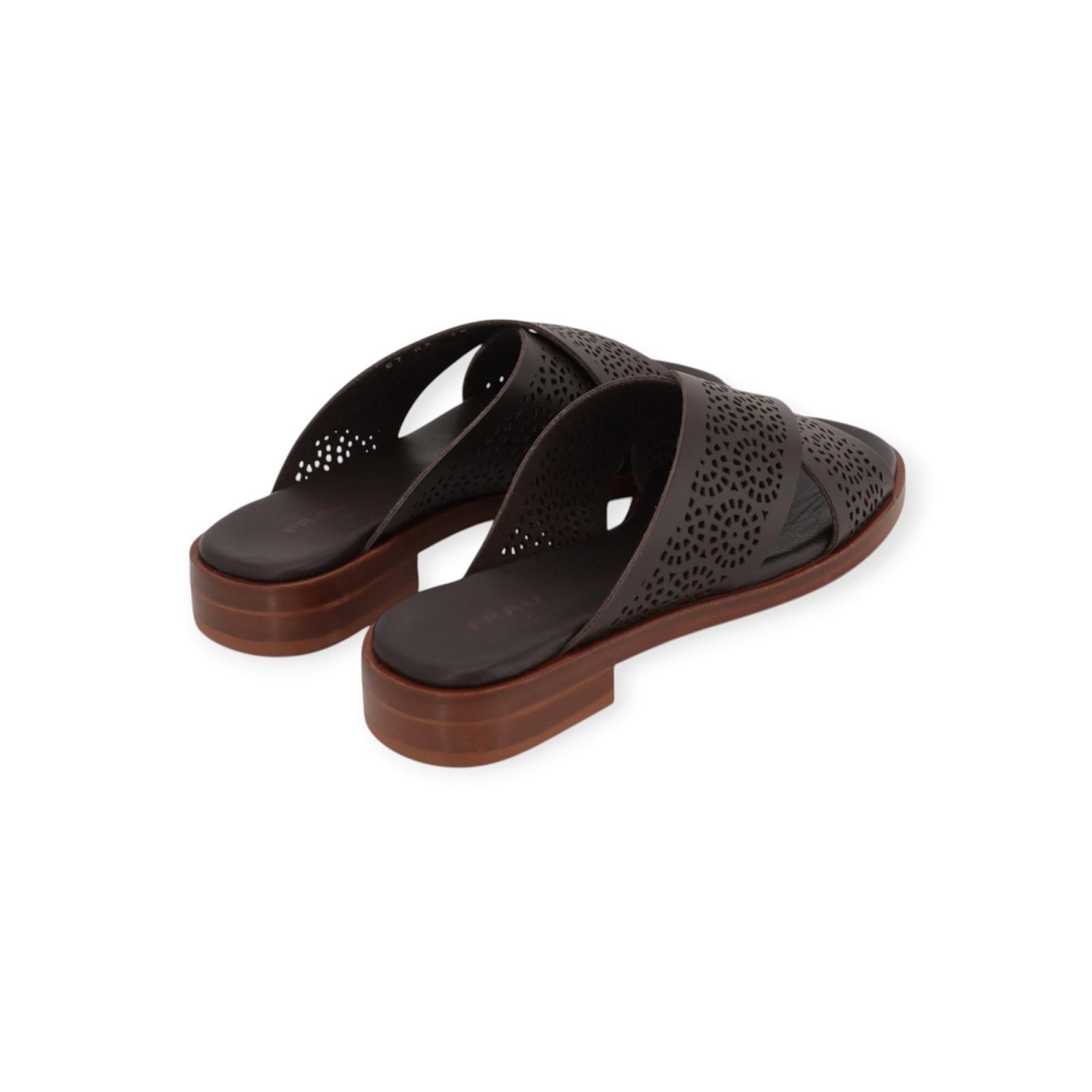 Slipper 87R3 van Frau voor dames. Dit elegant muiltje is in bruin geperforeerd leer. De leren bandjes zijn gekruist over de wreef. Heeft een lichte carré top met een fijn hieltje op een aangename antislipzool.