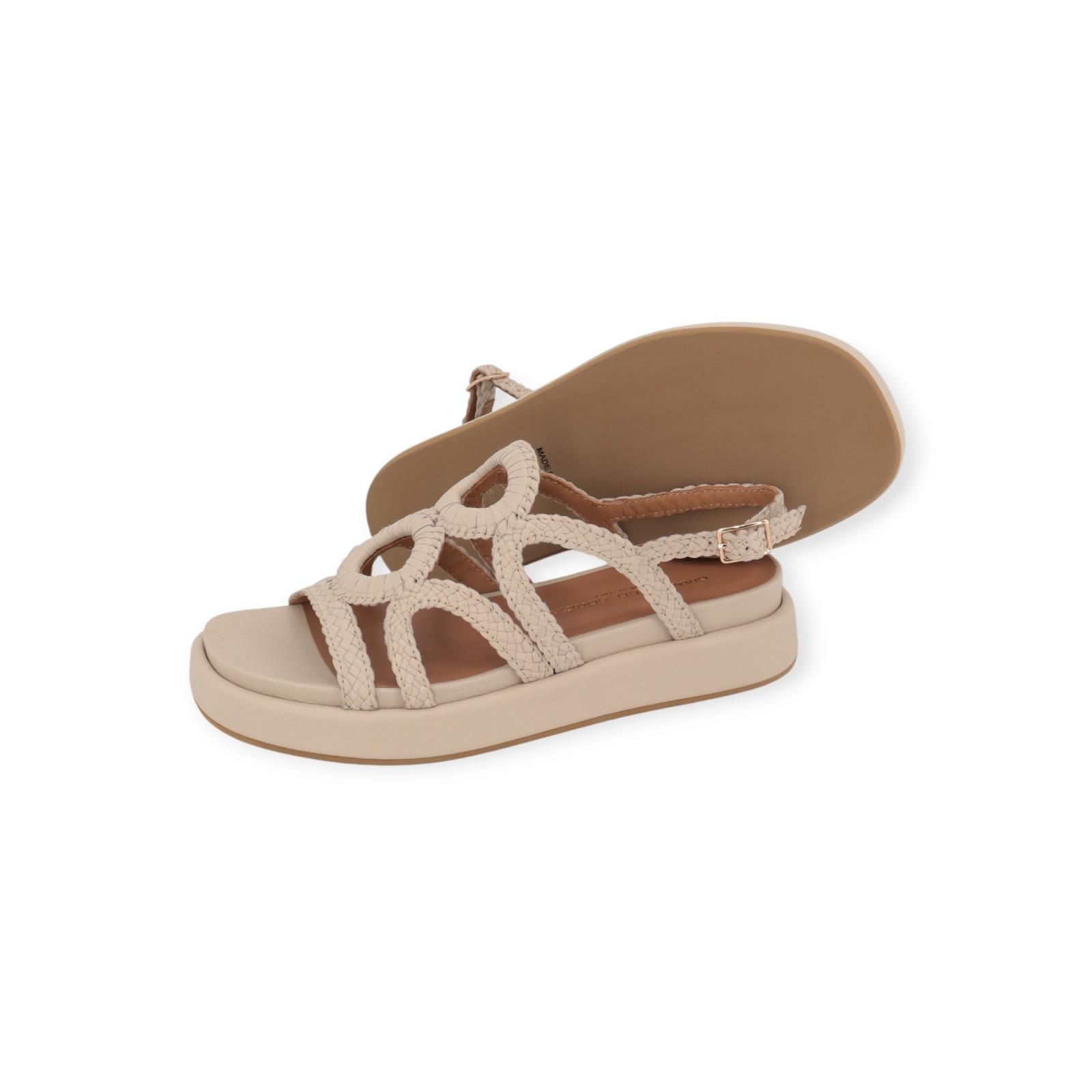 Sandaal Ares van Gianmarco Sorelli voor dames. Deze sandaal is in off wit geweven tressée. Heeft een band over de wreef die doorloopt naar de enkel. Is mooi afgesloten met een bandje rond de hiel en enkel met gespsluiting. De binnenzool komt iets boven de plateauzool uit en heeft een antislip buitenzool.