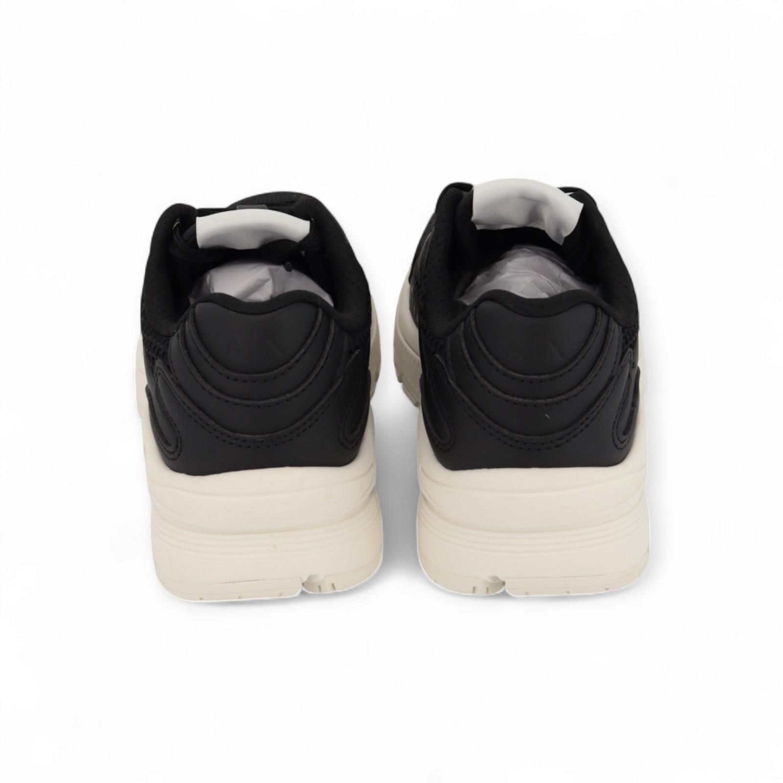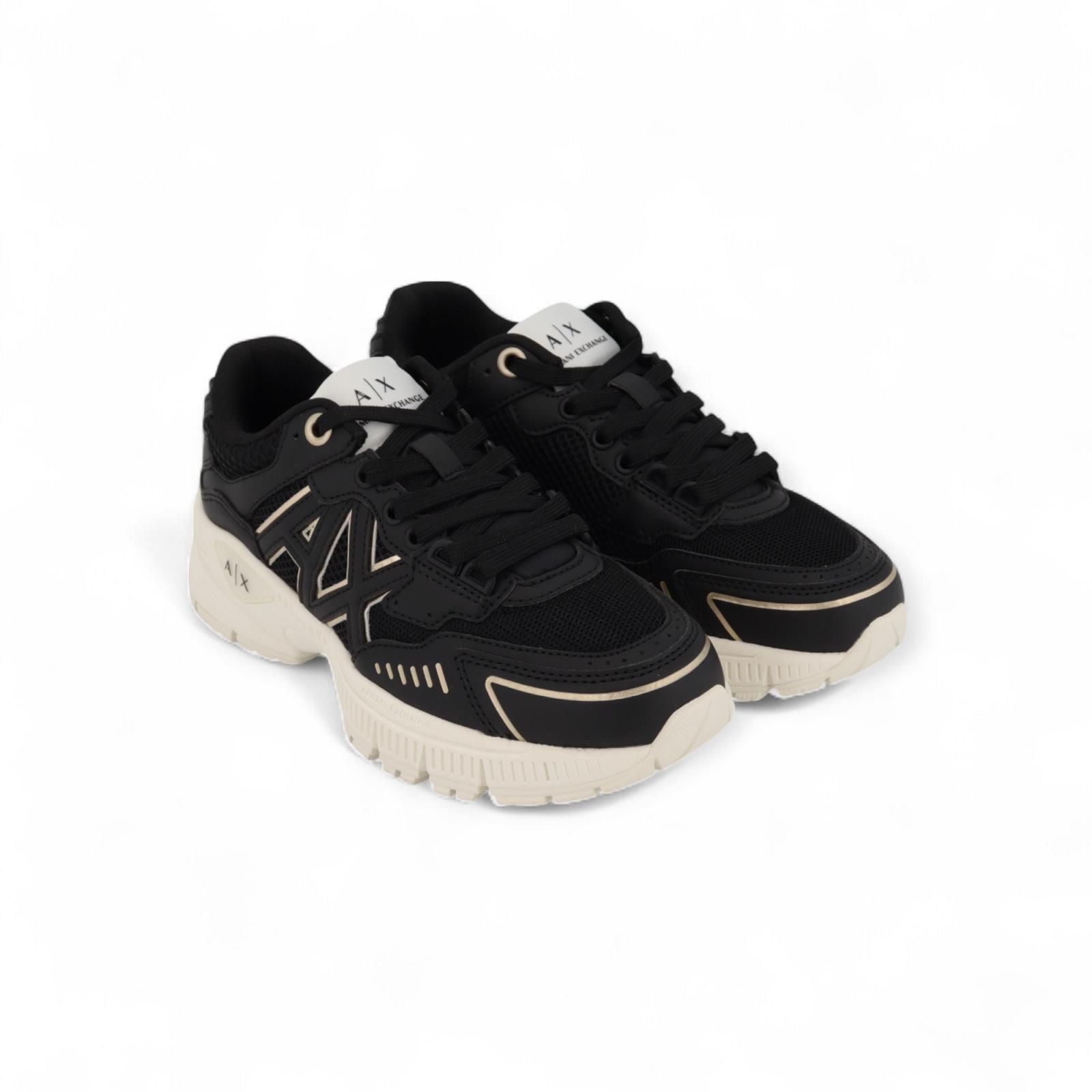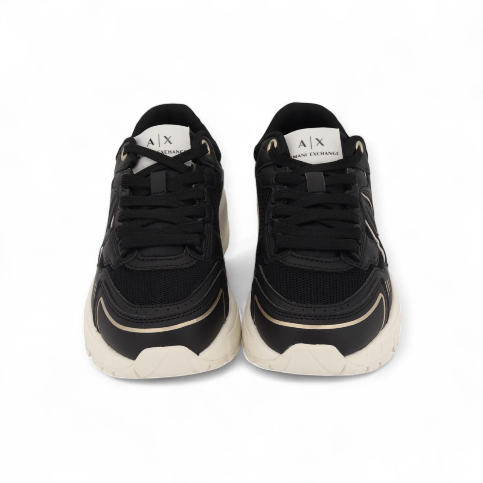 Sneaker Giorgio Armani voor dames. Deze runner is uit de Armani exchange collectie. Is gemaakt in zwart mesh met zwart leder stiksel, aan de zijkant zie je de AX afgewerkt met goud accenten. Het logo & label vind je terug op de rubberen zool en de flap. De binnenzool is uitneembaar.