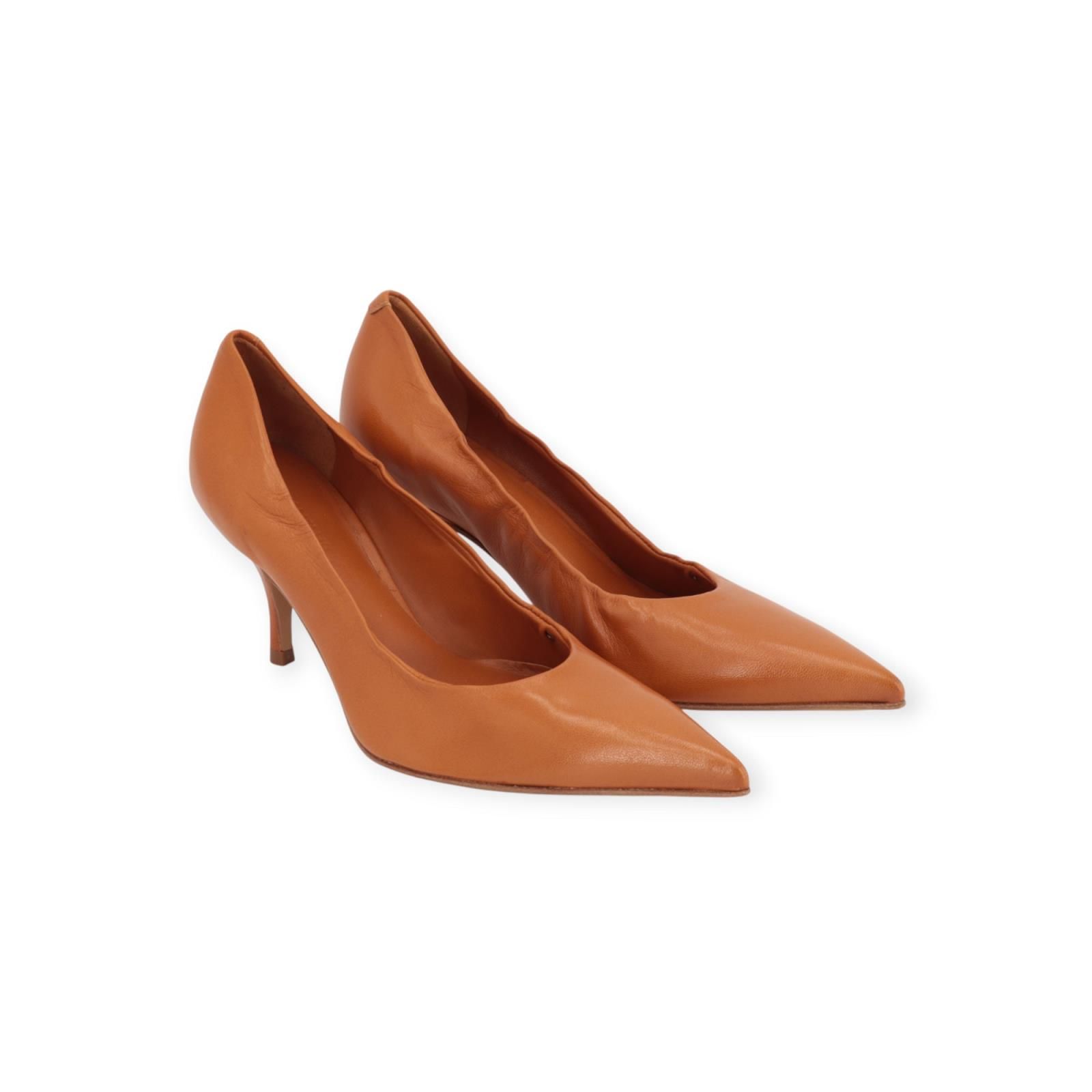 Pump Alesia van Guglielmo Rotta voor dames. Deze pump is in cognac zacht leer. Heeft een zeer scherpe neus met een fijn naaldhakje van 7cm hoog. Het leer aan de zijkant is licht rekbaar waardoor het model zeer mooi aan de voet blijft. De buitenzool is in leer.