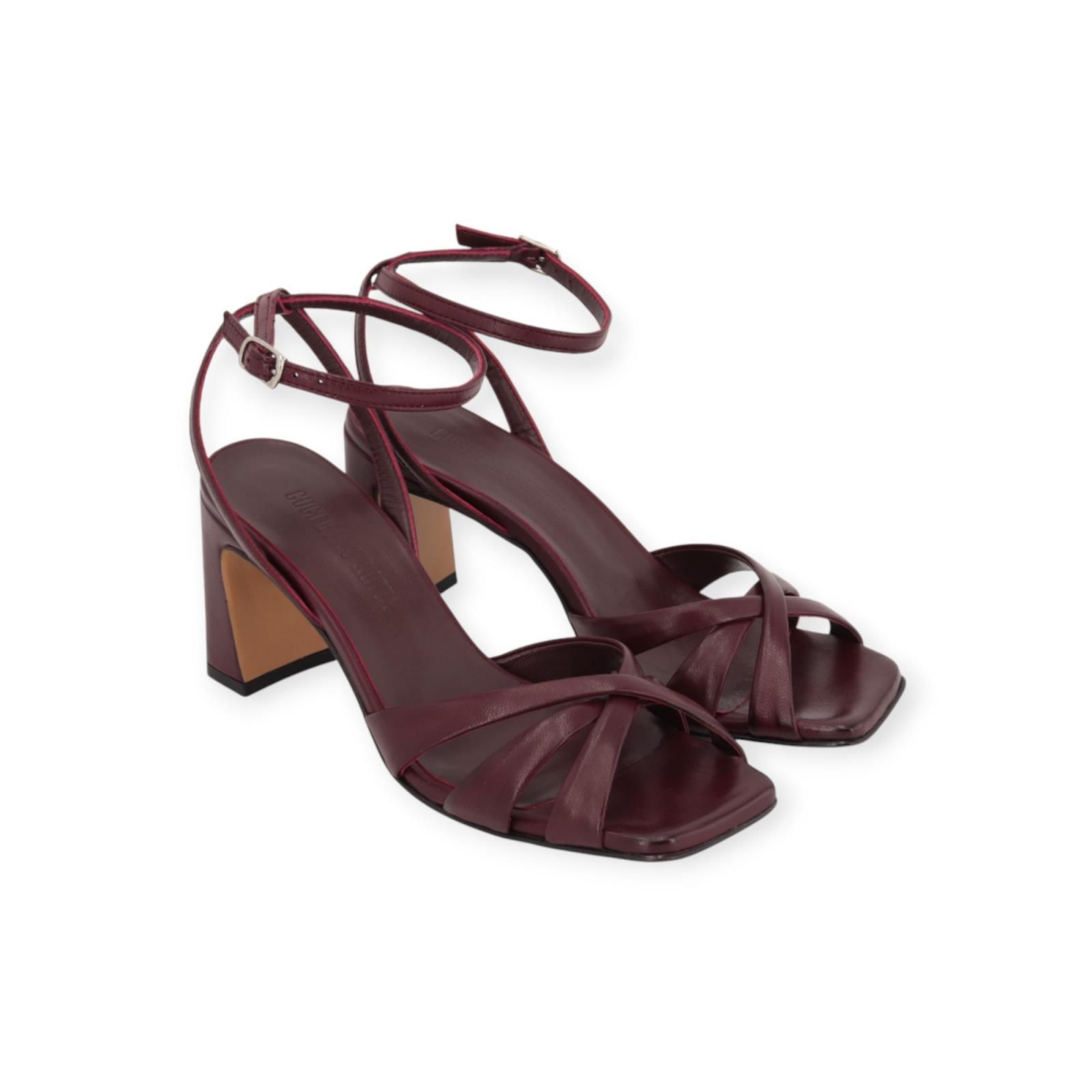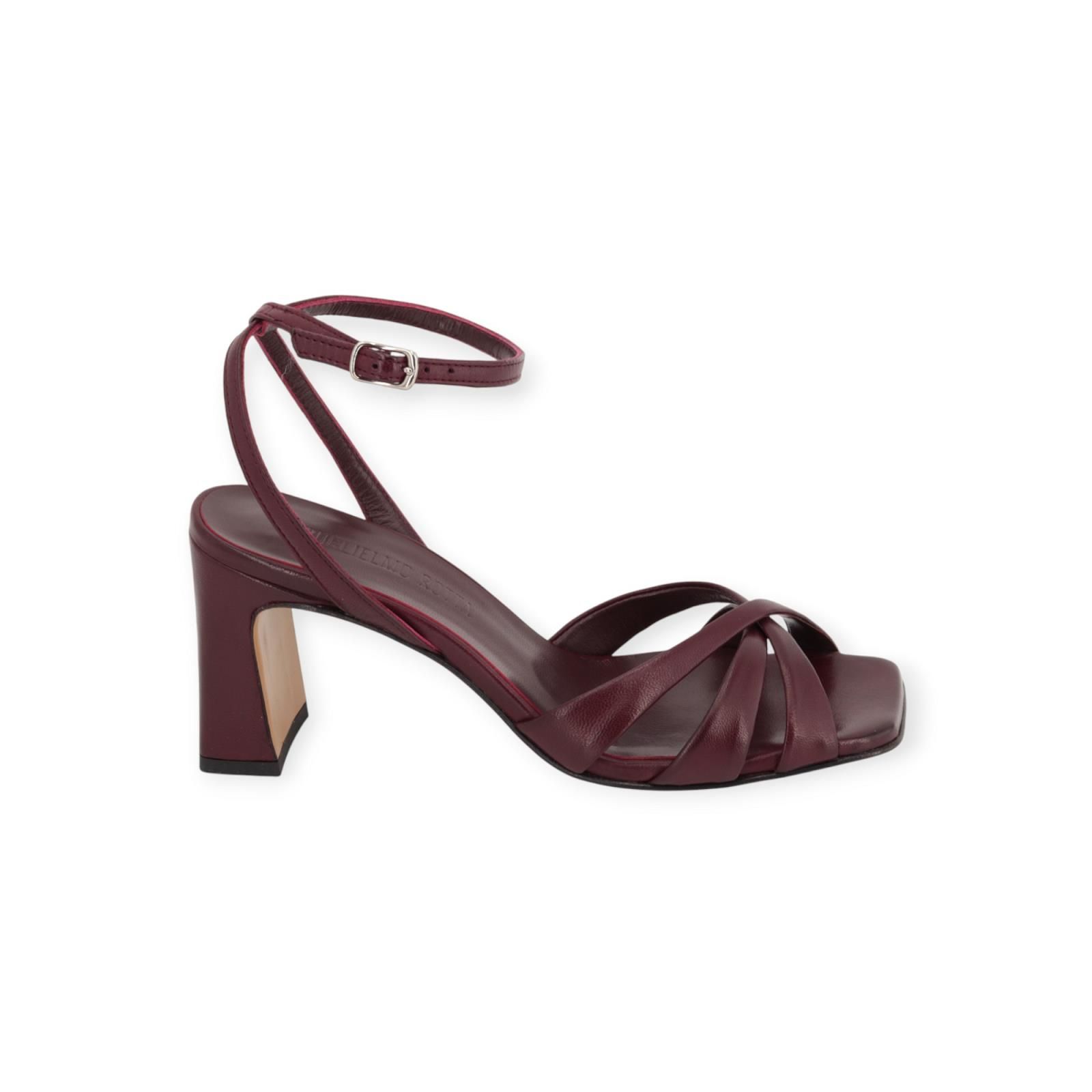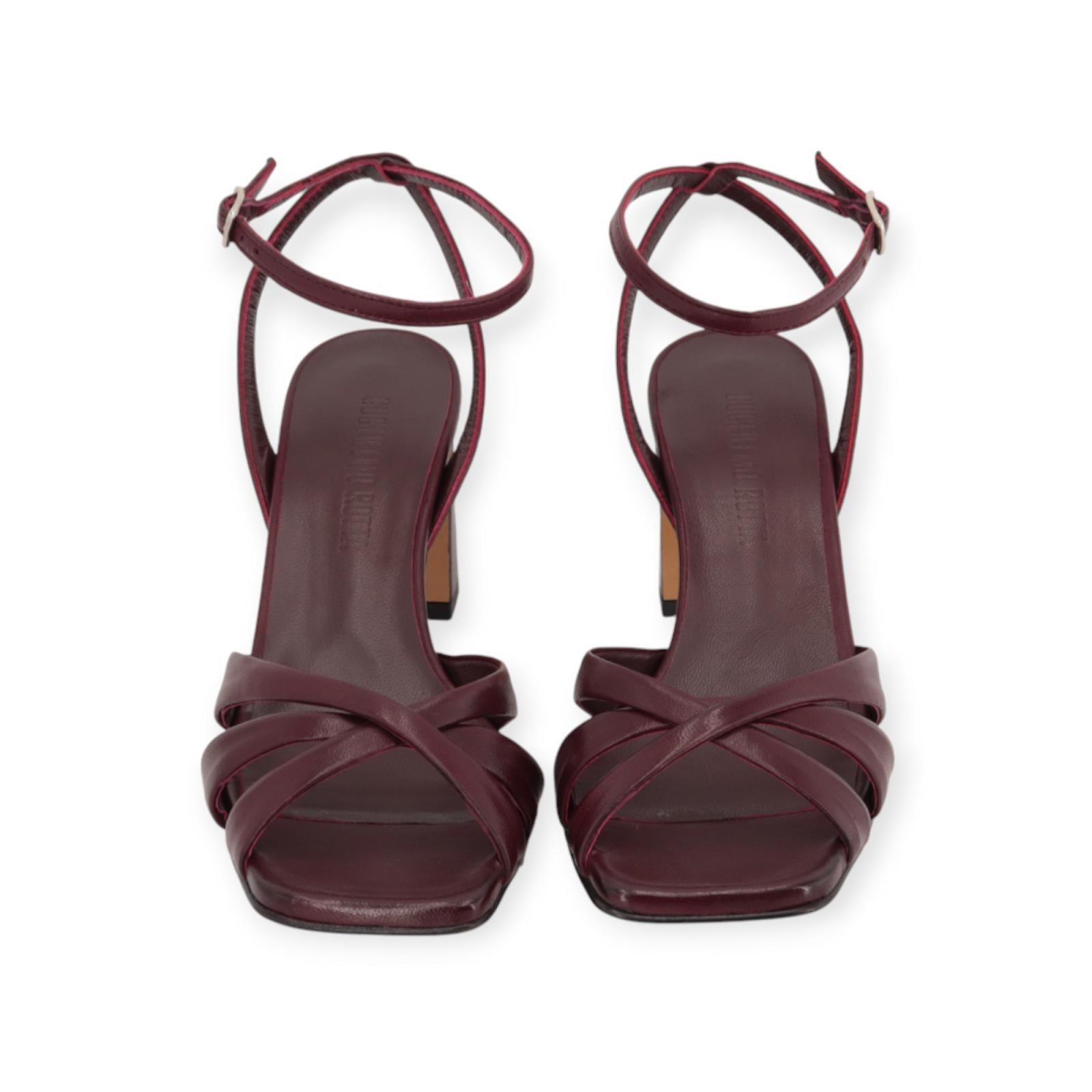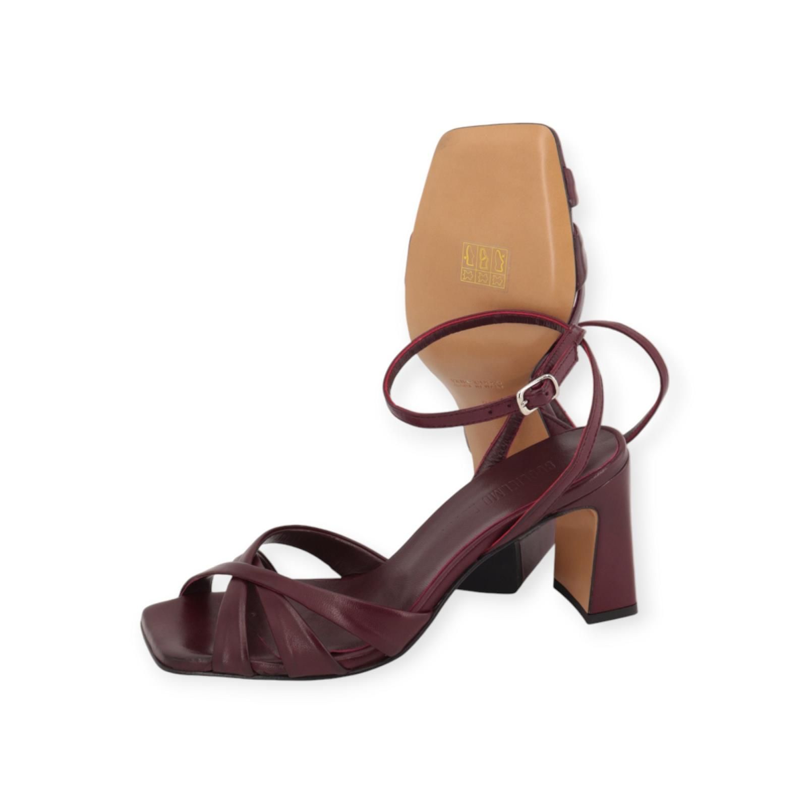 Sandaal Amour van Guiglelmo Rotta voor dames. Deze elegante sandaal is in bordeaux leer. Heeft gekruiste fijne bandjes over de wreef met een carré top. Is mooi afgesloten met een bandje rond de hiel en zit mooi vast rond de enkel met een gouden gespsluiting. Is op een elegante blokhak van 7cm hoog met een leren buitenzool.