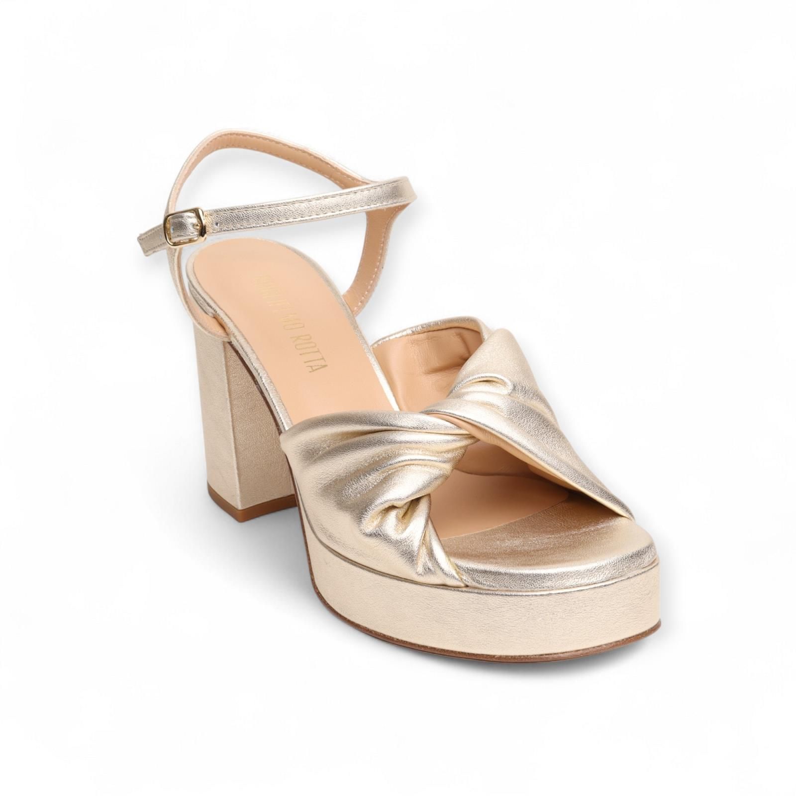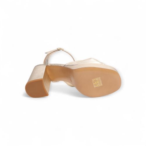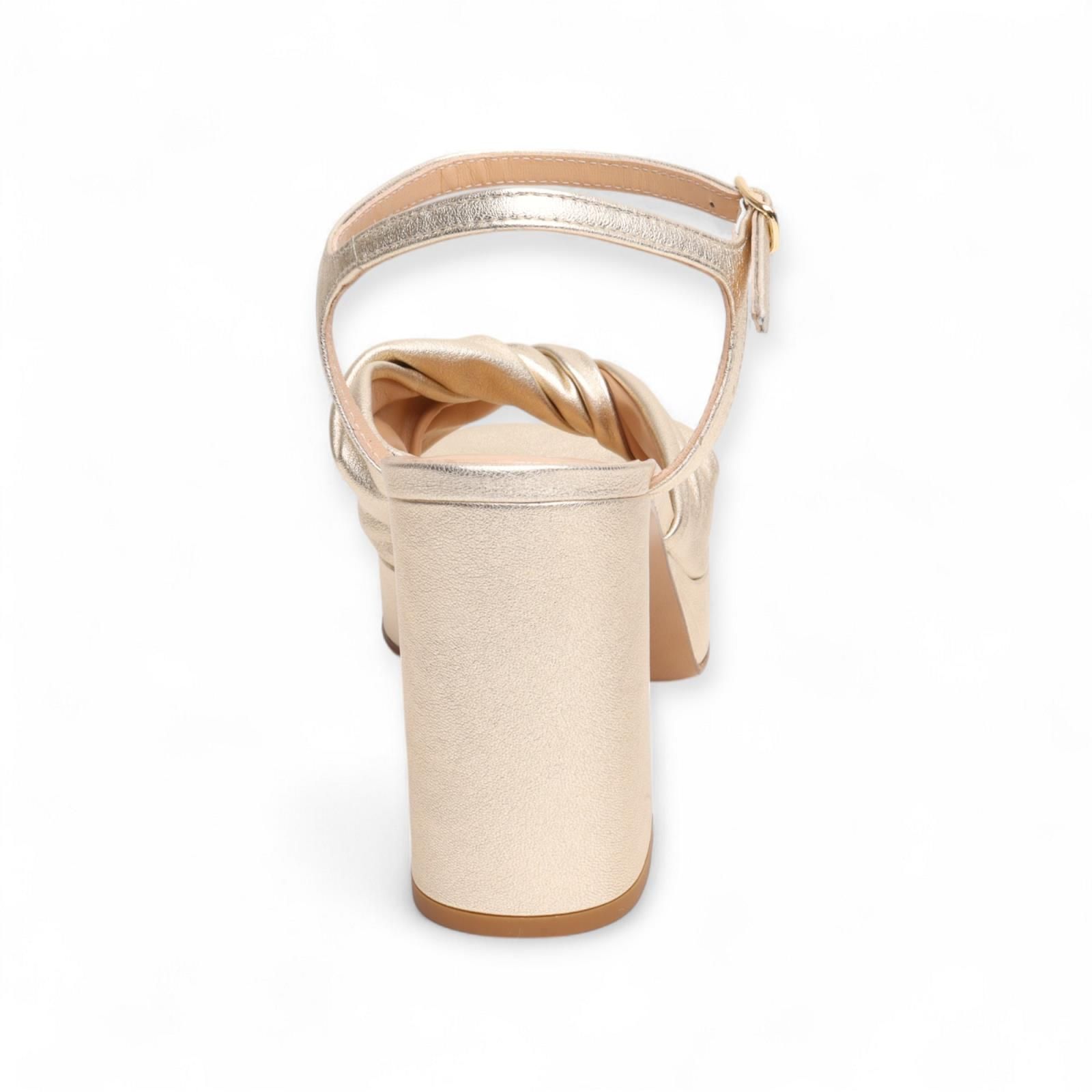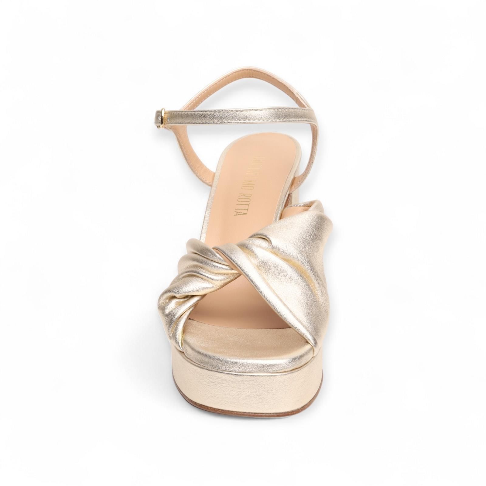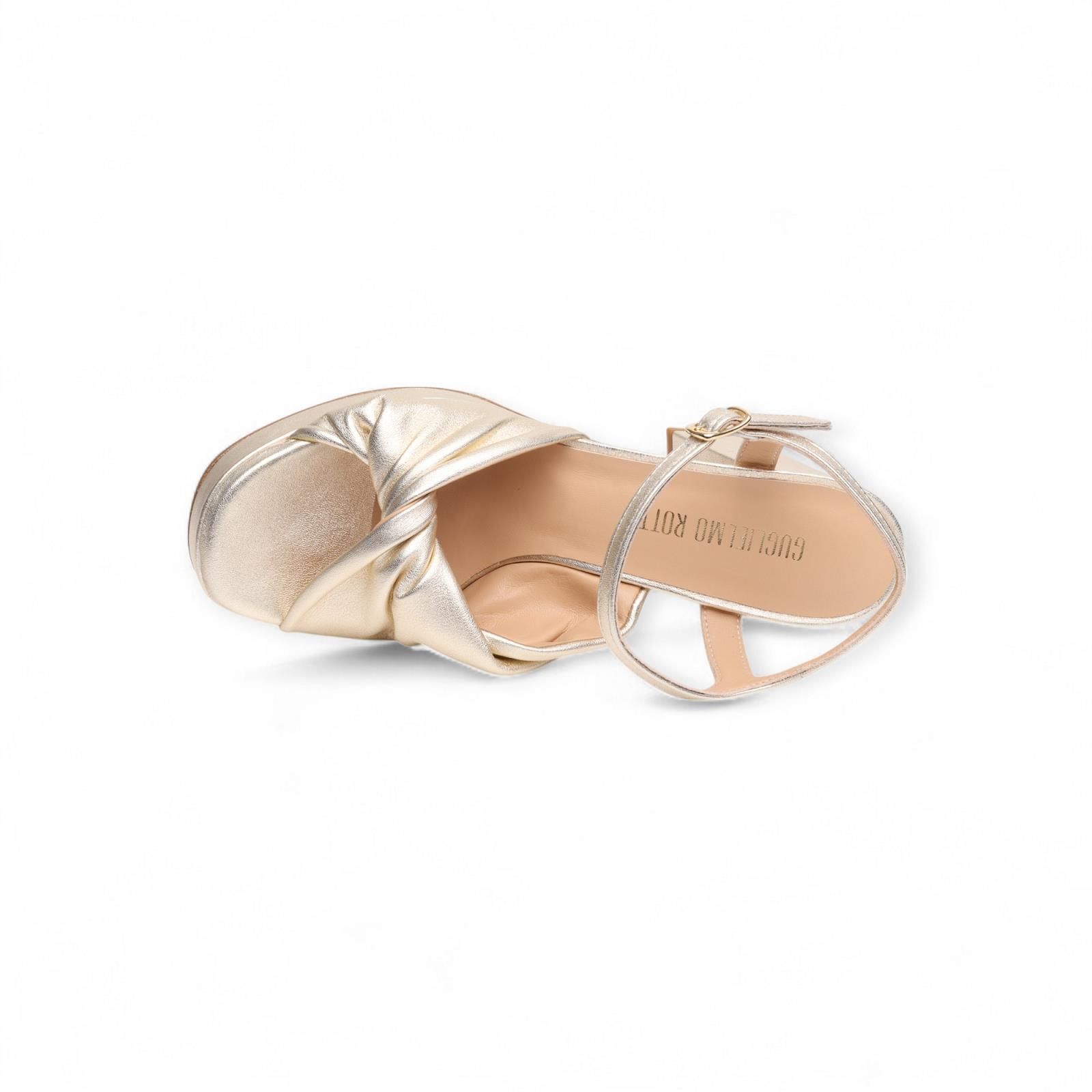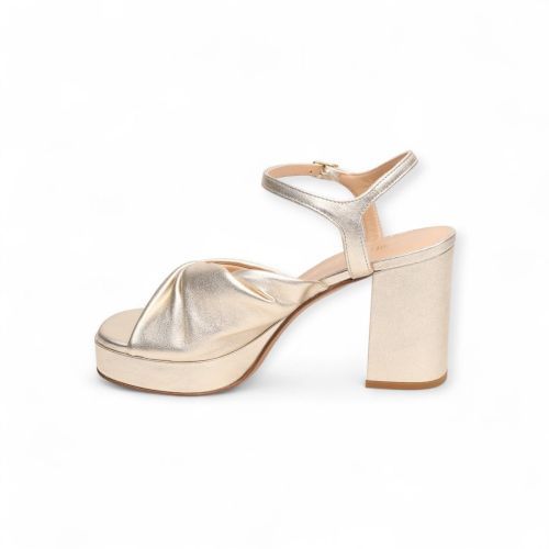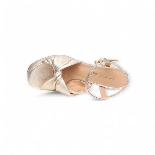 Sandaal Cara van Guglielmo Rotta voor dames. Deze sandaal is in goud shining leder. Heeft een mooi gevlochten band over de wreef en een bandje rond de hiel en enkel met gespsluiting. Is op een hak van 7-7,5cm hoog.
