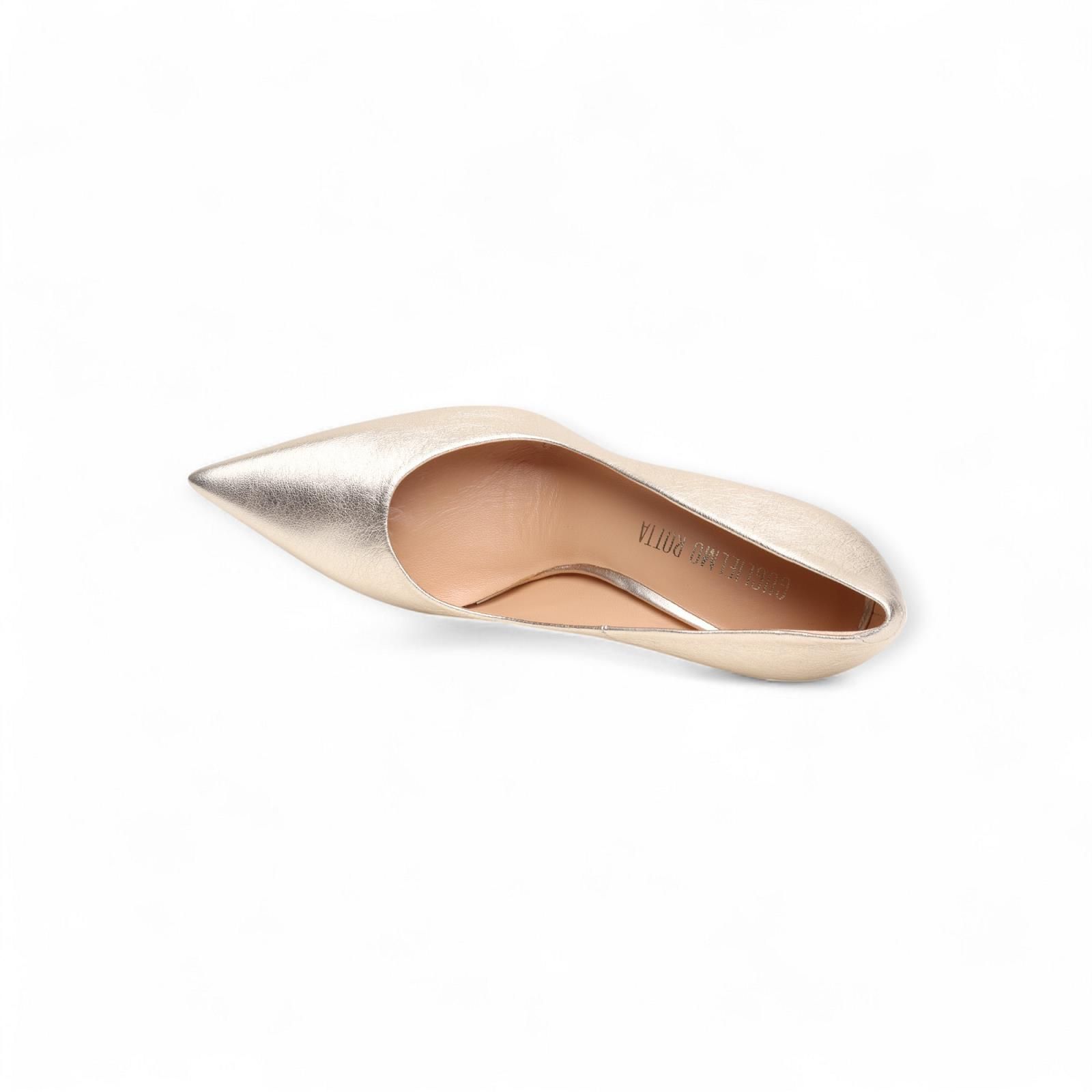 Pump Fiamma in goud van Guglielmo Rotta voor dames. Deze elegante en comfortabele pump is volledig in leder. Heeft een scherpe top en is op een klein hakje van 7-7.5cm hoog.