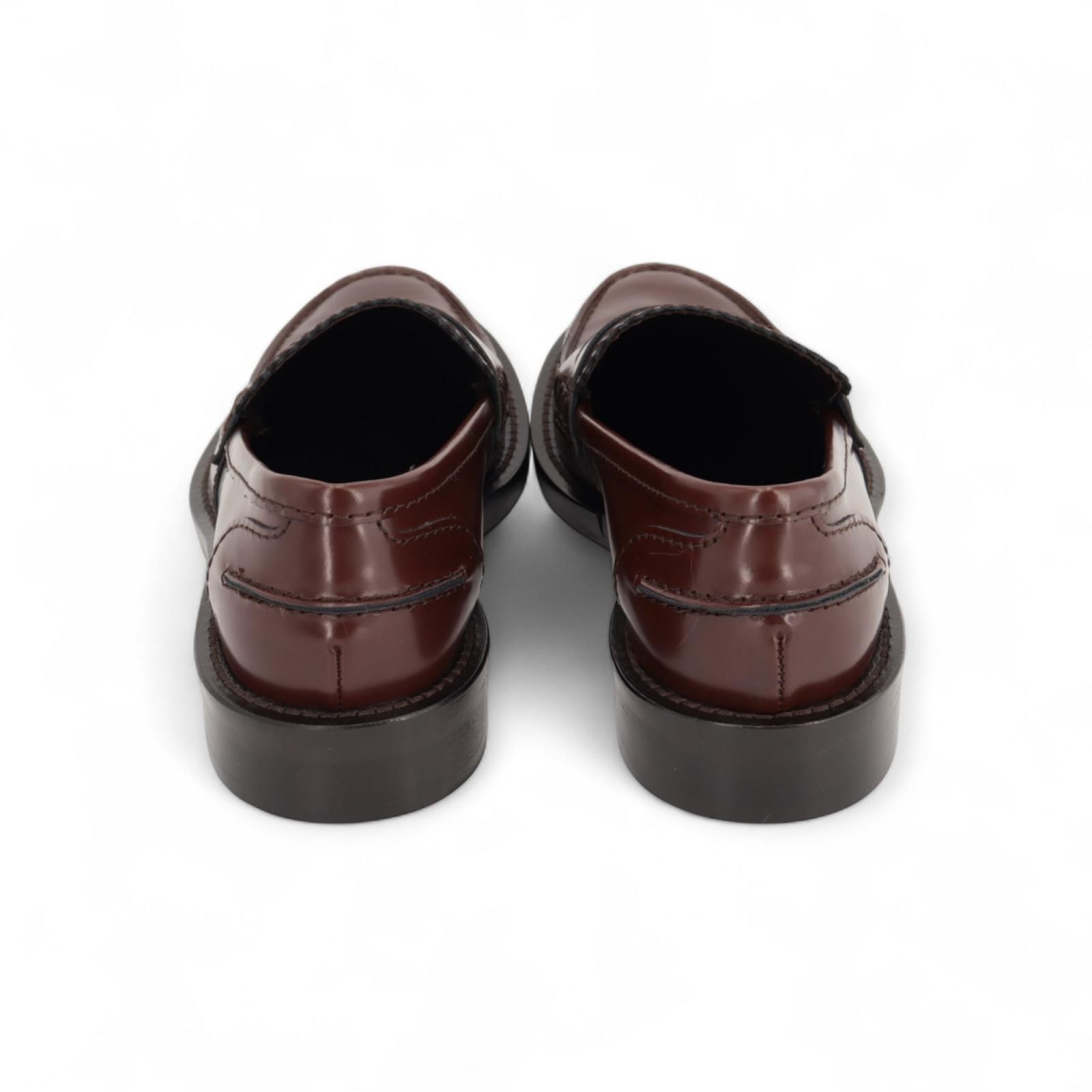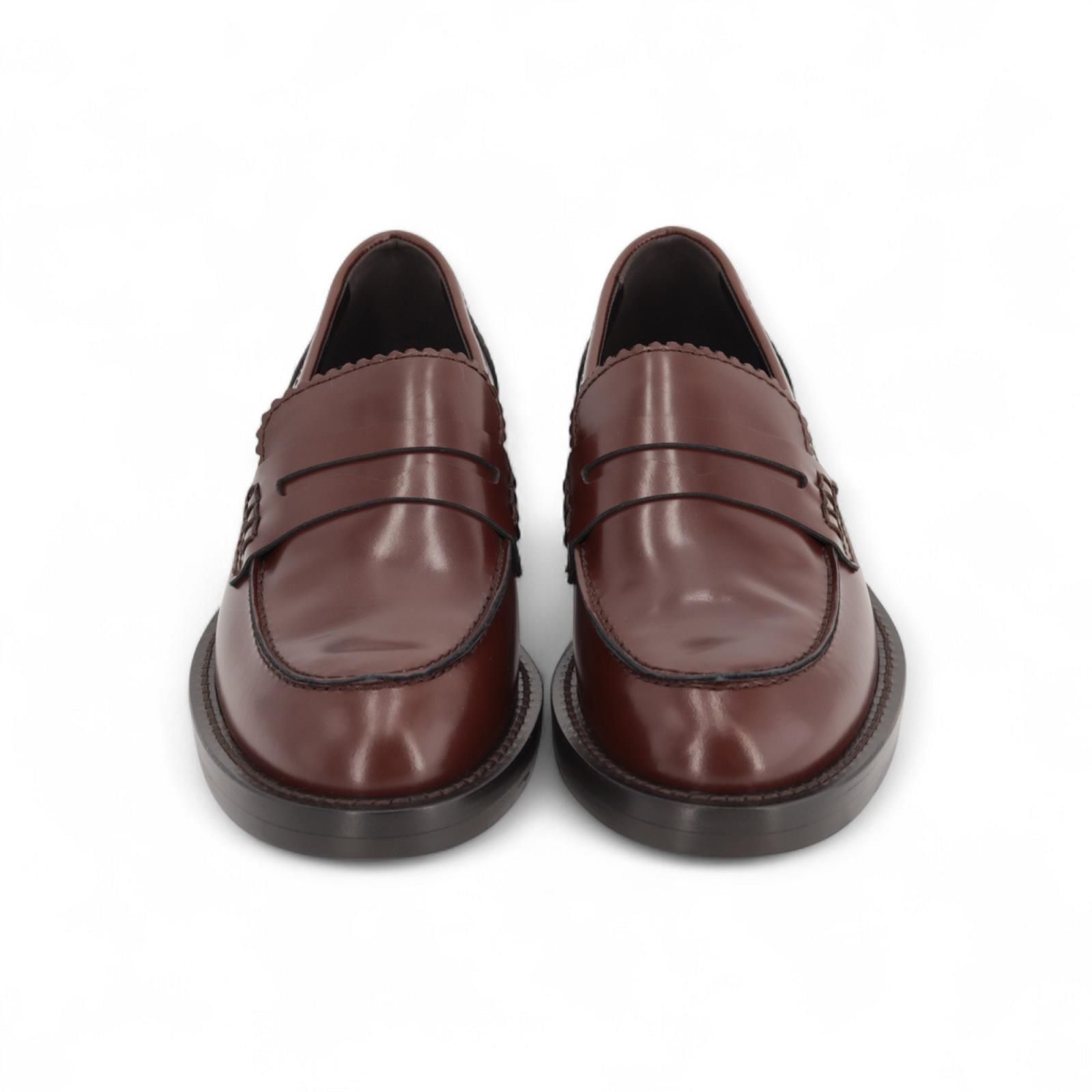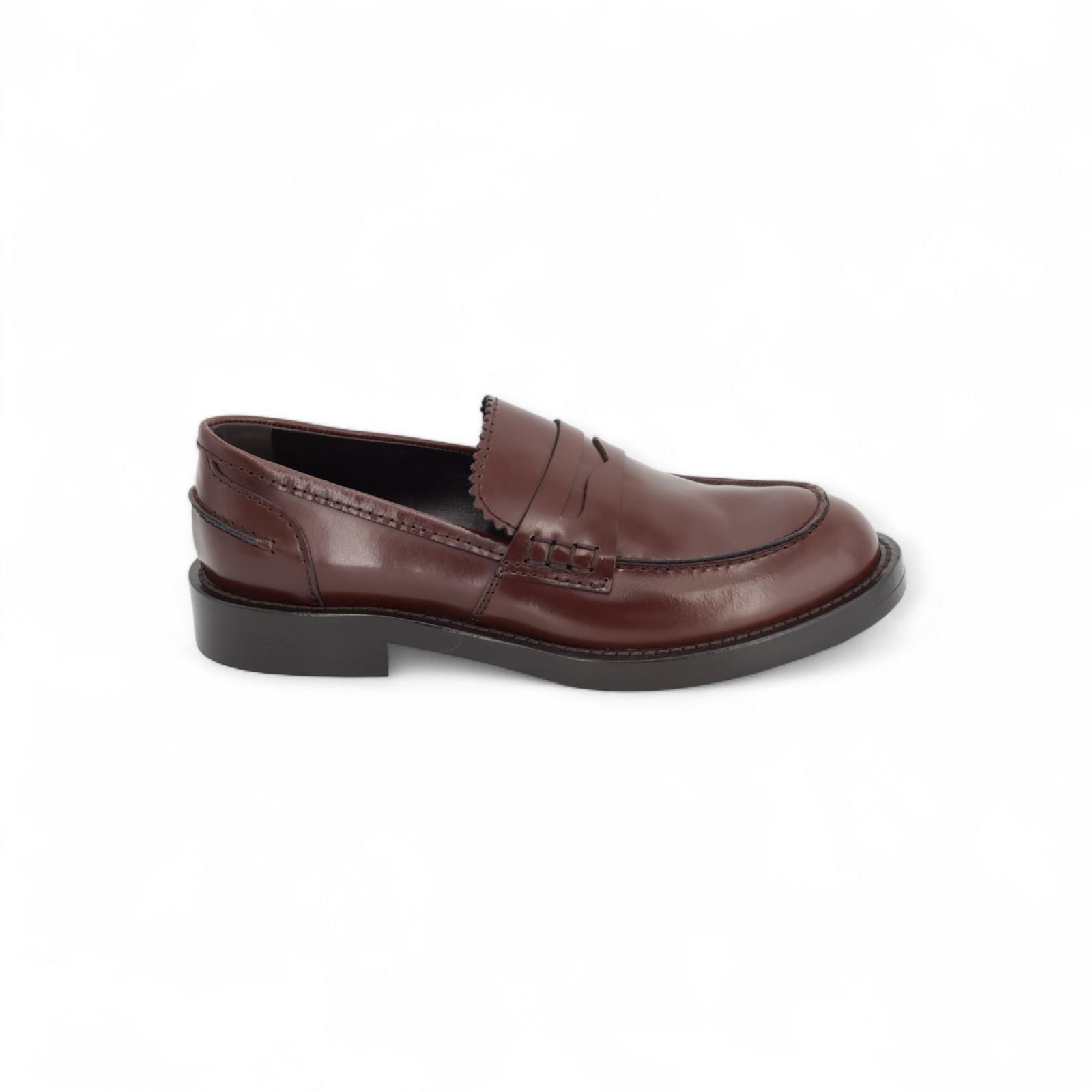 Mocassin Pretty van Guglielmo Rotta voor dames. Deze stijlvolle mocassin is in bruin leer afgewerkt met een gekartelde flap, en een stekking in de hiel. Heeft een brede band en stekking op de voorvoet die het model nog eleganter maakt. Is op een zwarte antislipzool.