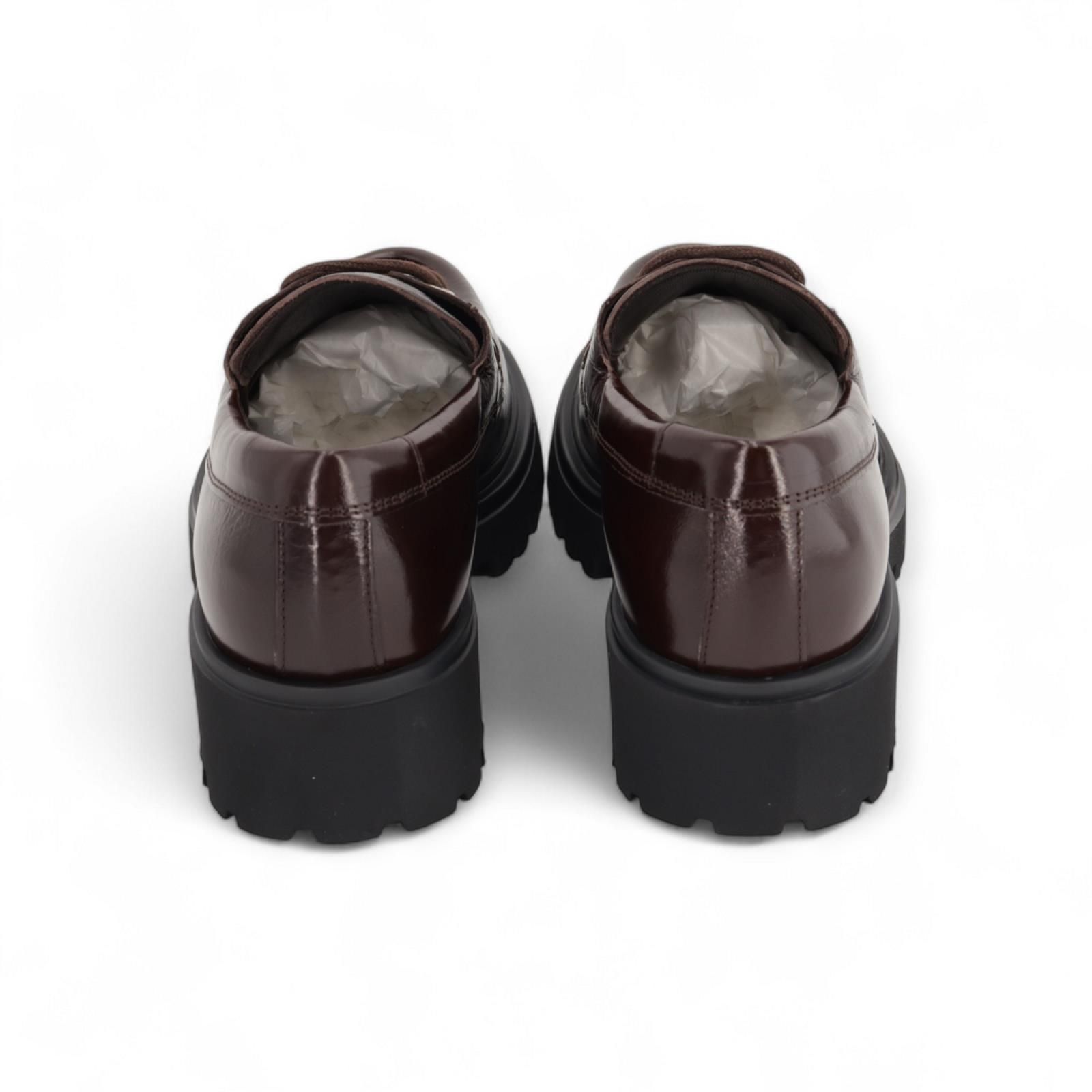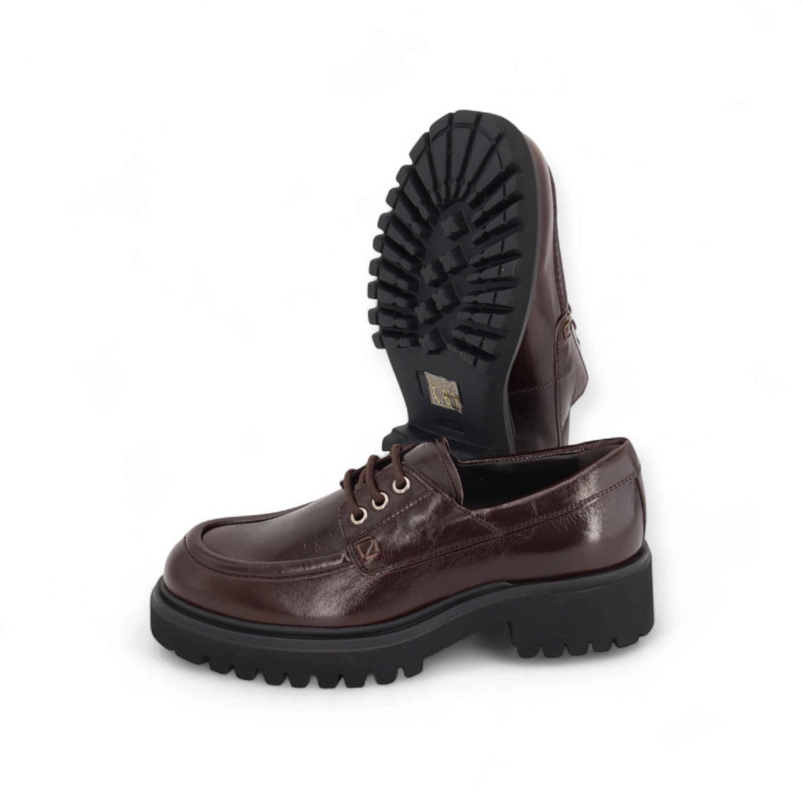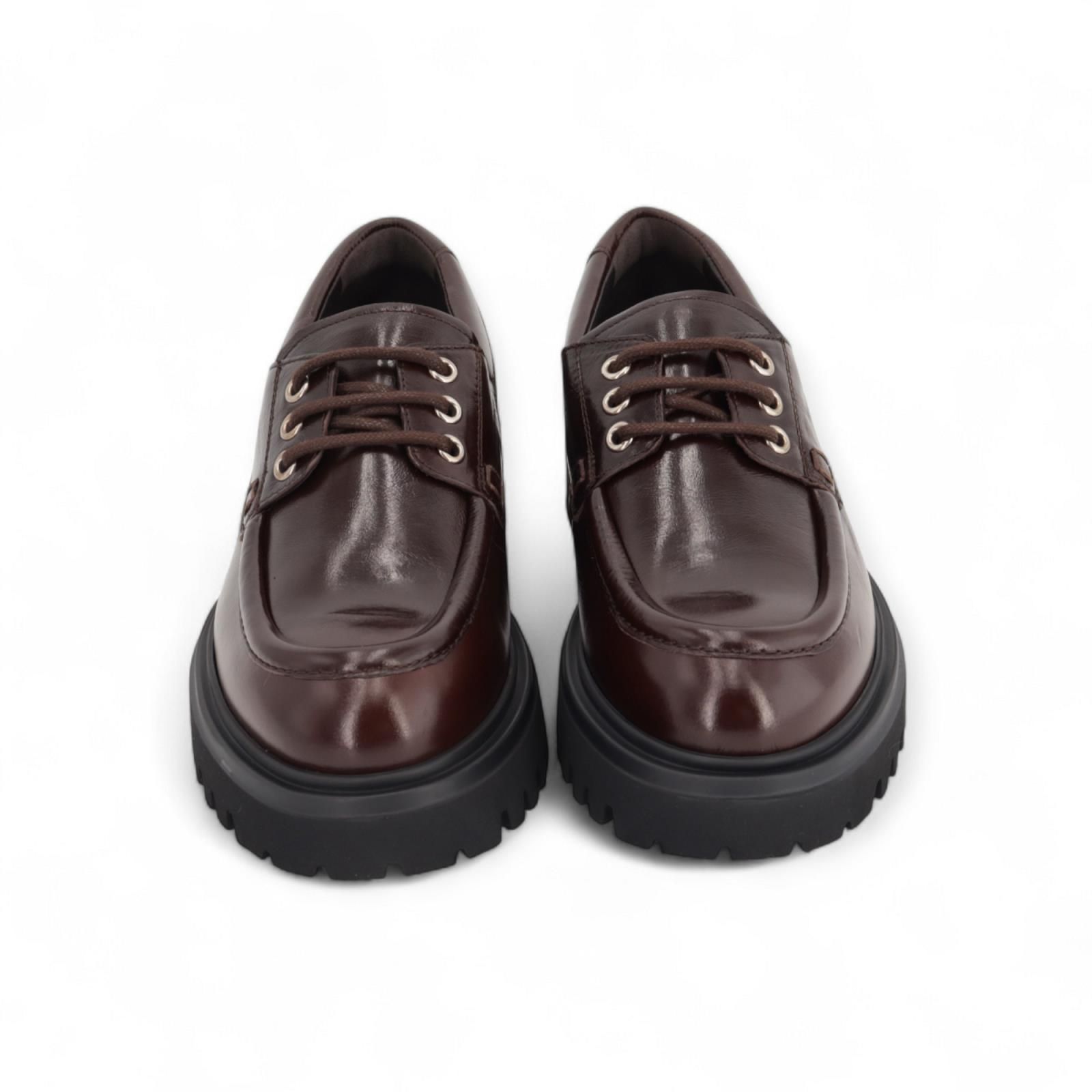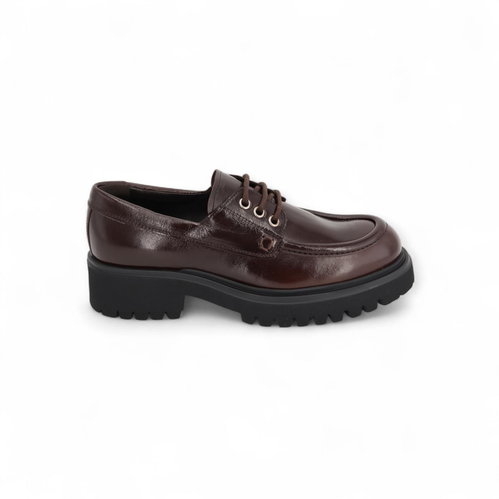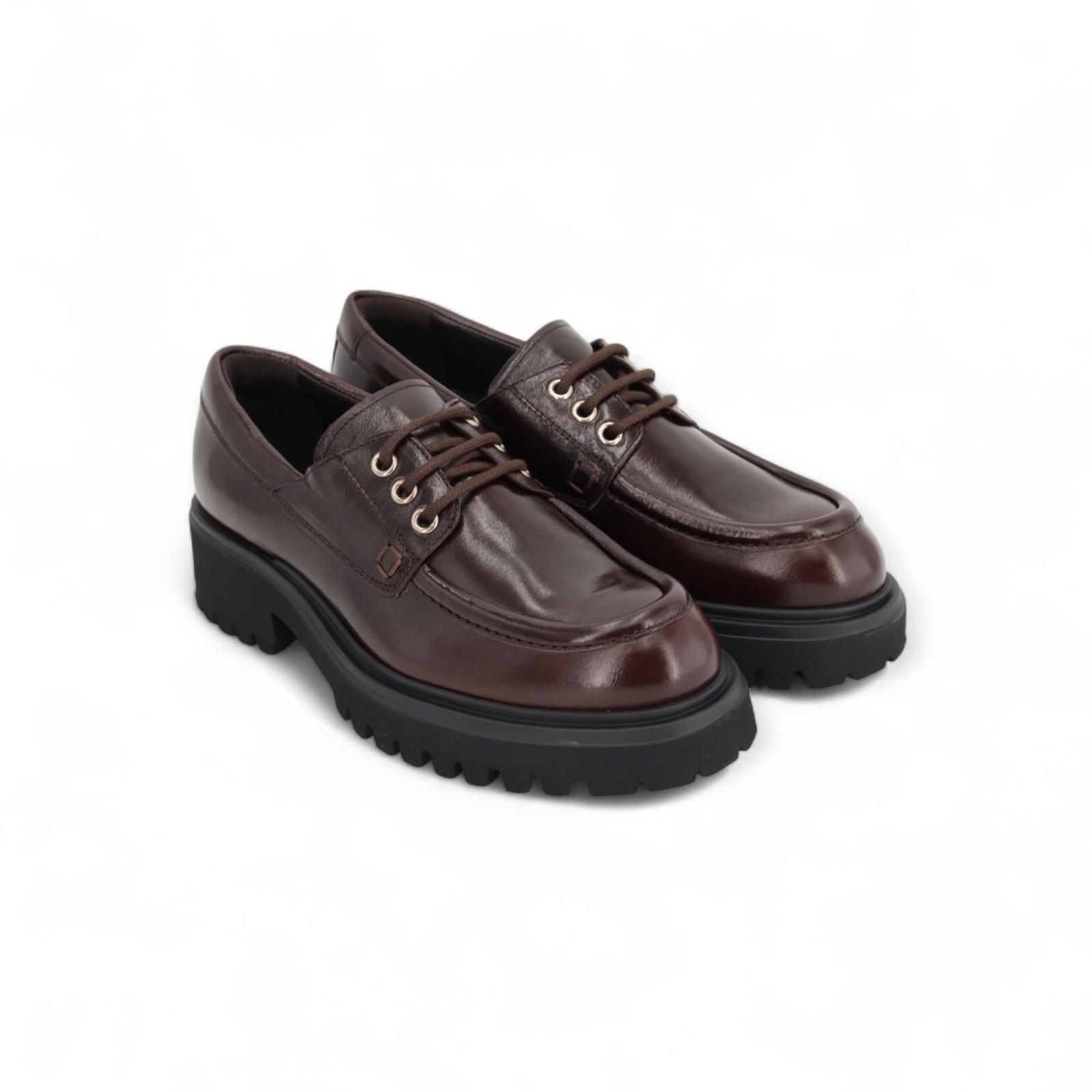 Veterschoen Wylder van Guglielmo Rotta voor dames. Deze stoere veterschoen is in bruin lakleer. Is mooi afgewerkt met een dikke stekking op de voorvoet en gouden vetergaatjes. Is op een dikke zwarte zool met een blokhak die voor nog meer comfort zorgt.