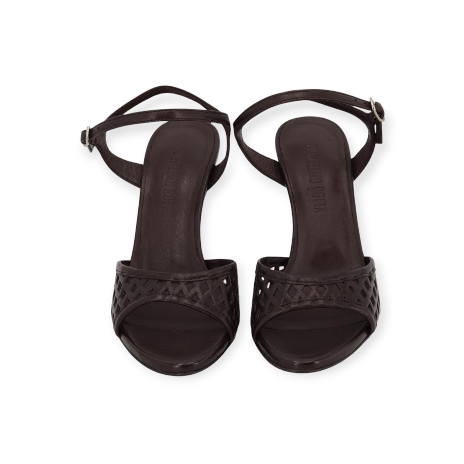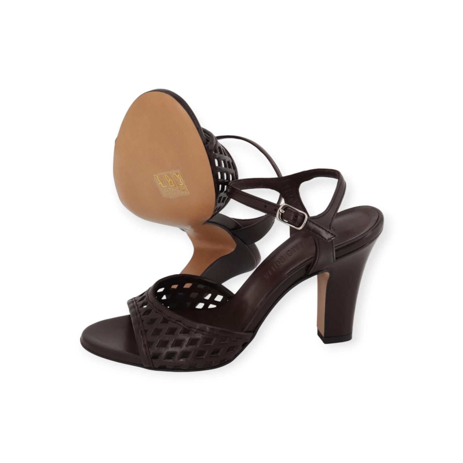 Sandaal Yele van Guglielmo Rotta voor dames. Deze sandaal is volledig in bruin nappa leer. Heeft vooraan een geperforeerde band met een ronde neus. Blijft mooi aan de voet daar het bandje rond de hiel en enkel met gespsluiting. Is op een leren buitenzool met een blokhak van 9cm hoog.