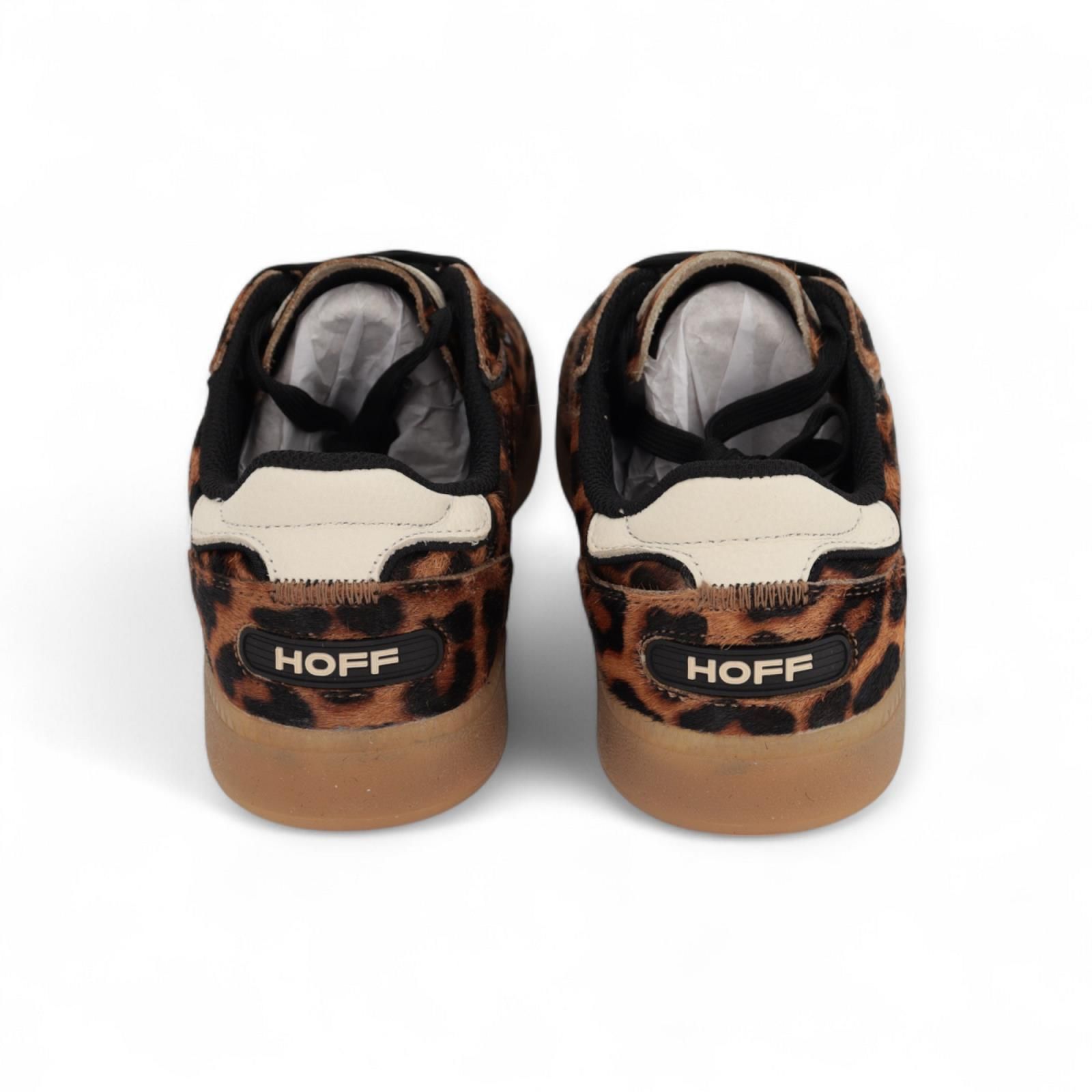 Sneaker Alley van Hoff voor dames. Deze sneaker is in leopard met stiksels afgewerkt. Heeft een off wit hielflap met HOFF achteraan. Is op een aangename gummy zool en de binnenzool is uitneembaar.