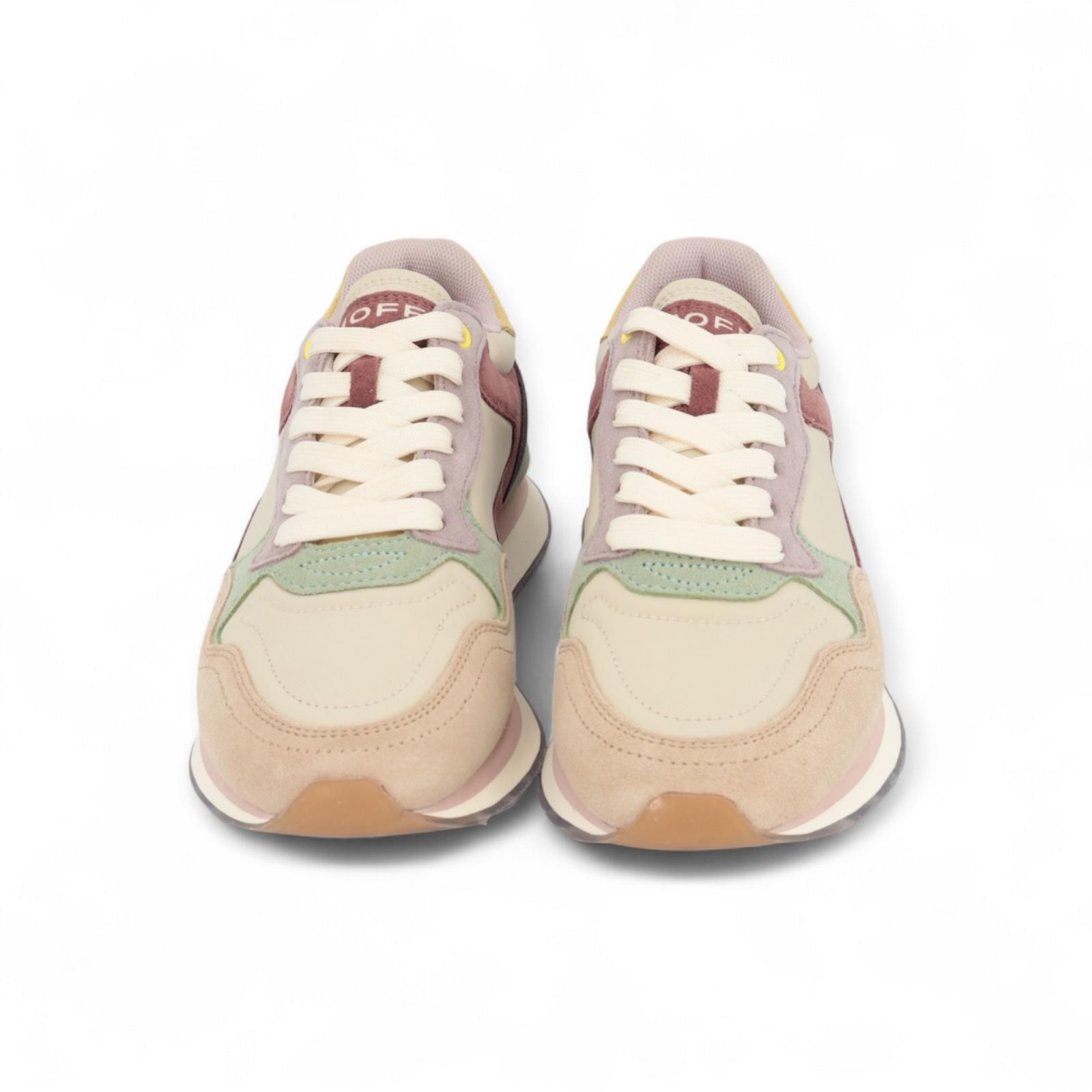 Sneaker City Brussels van Hoff voor dames. Deze sneaker is in zachte paarse tinten suède met off wit nylon. Heeft een taupe hiel met okergele hielflap en logodetail. De binnenzool is uitneembaar en heeft de typische citylook zool.