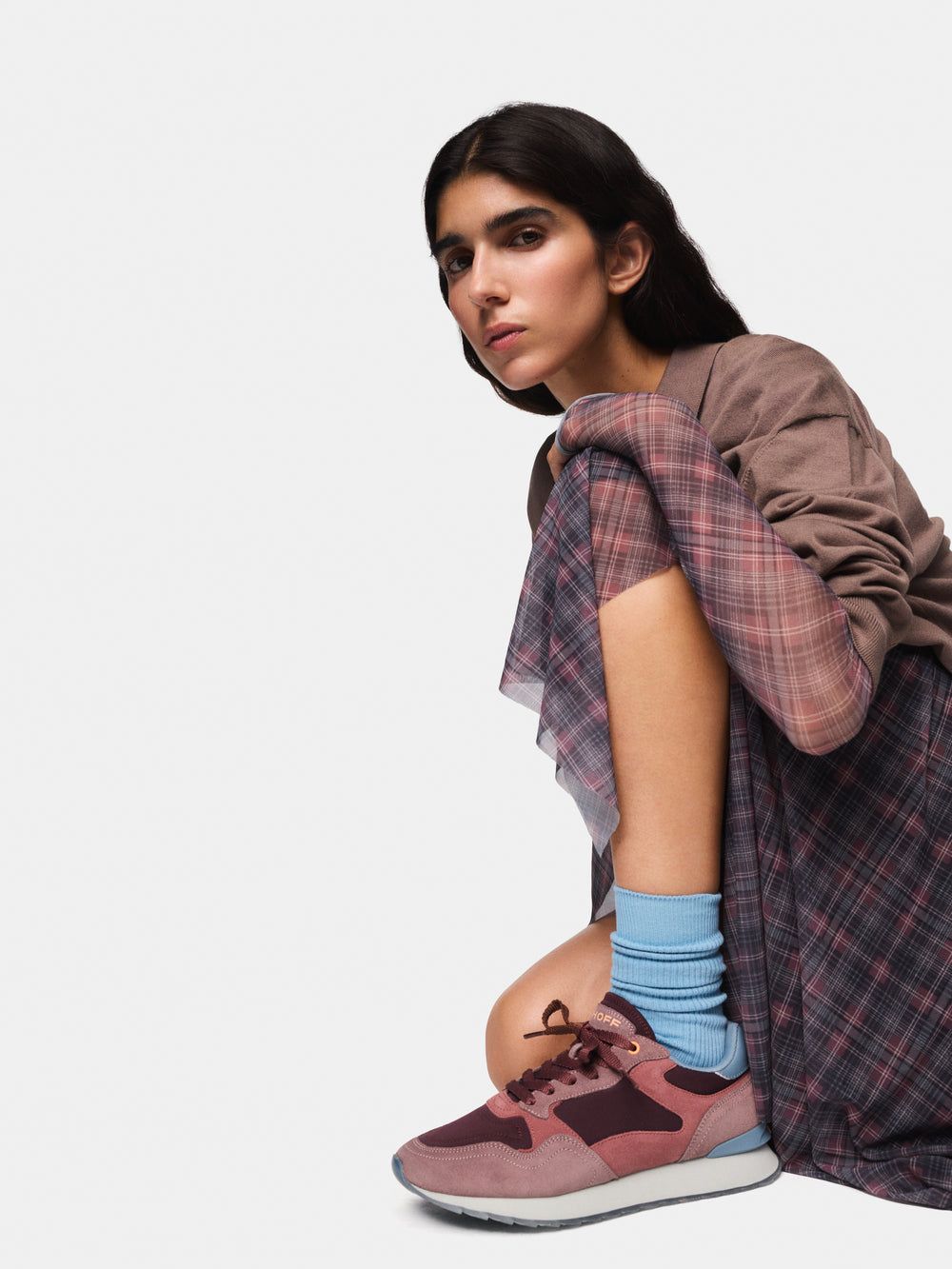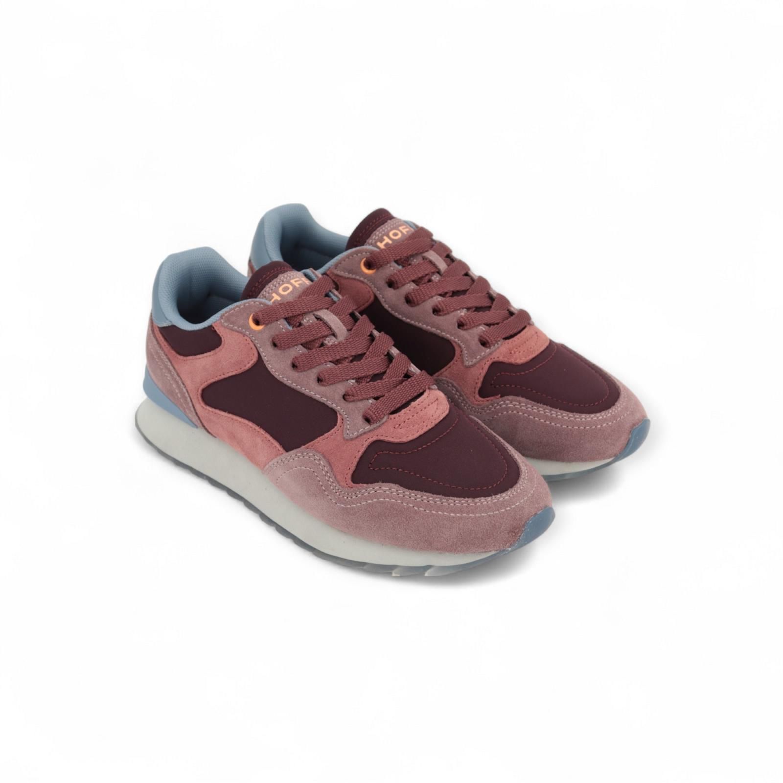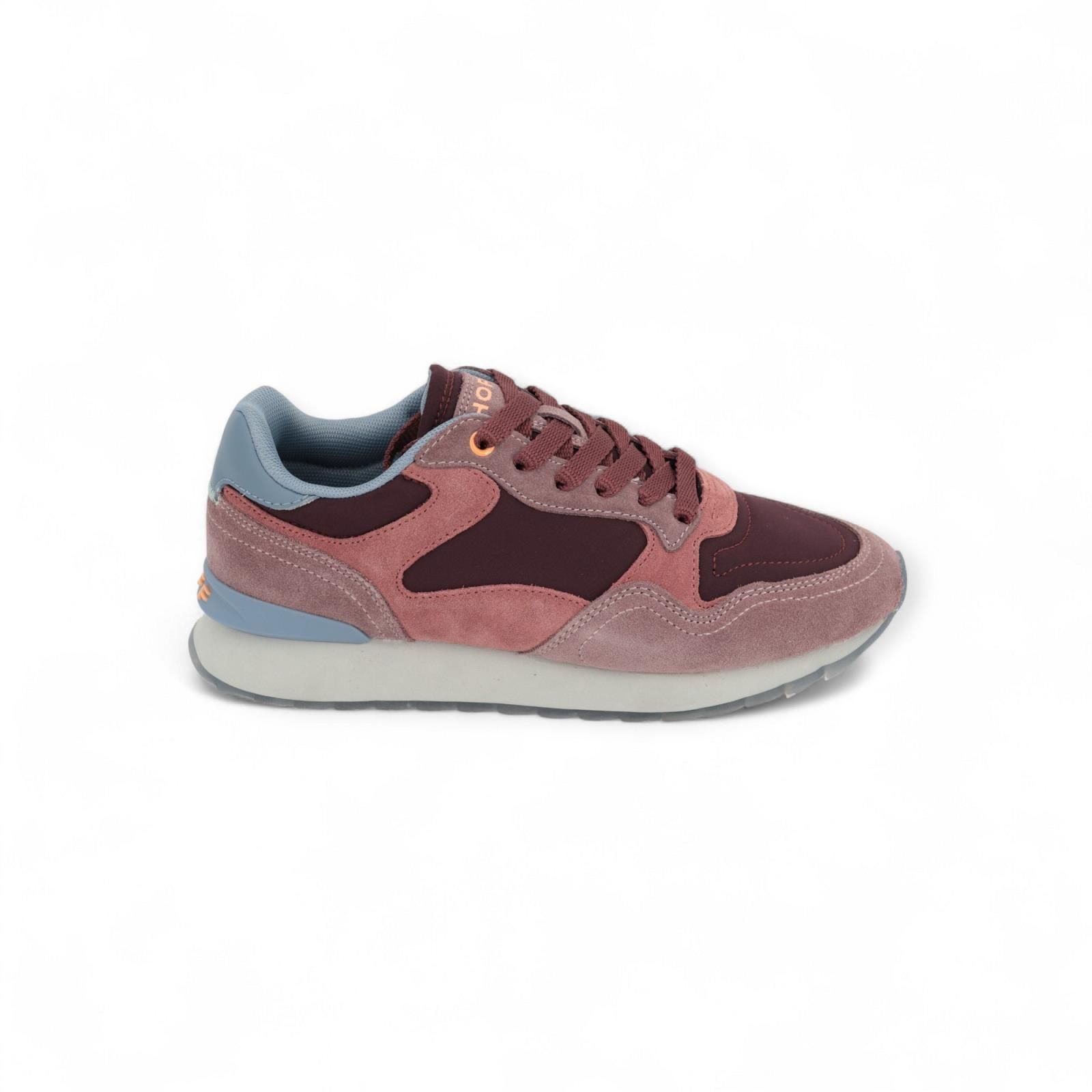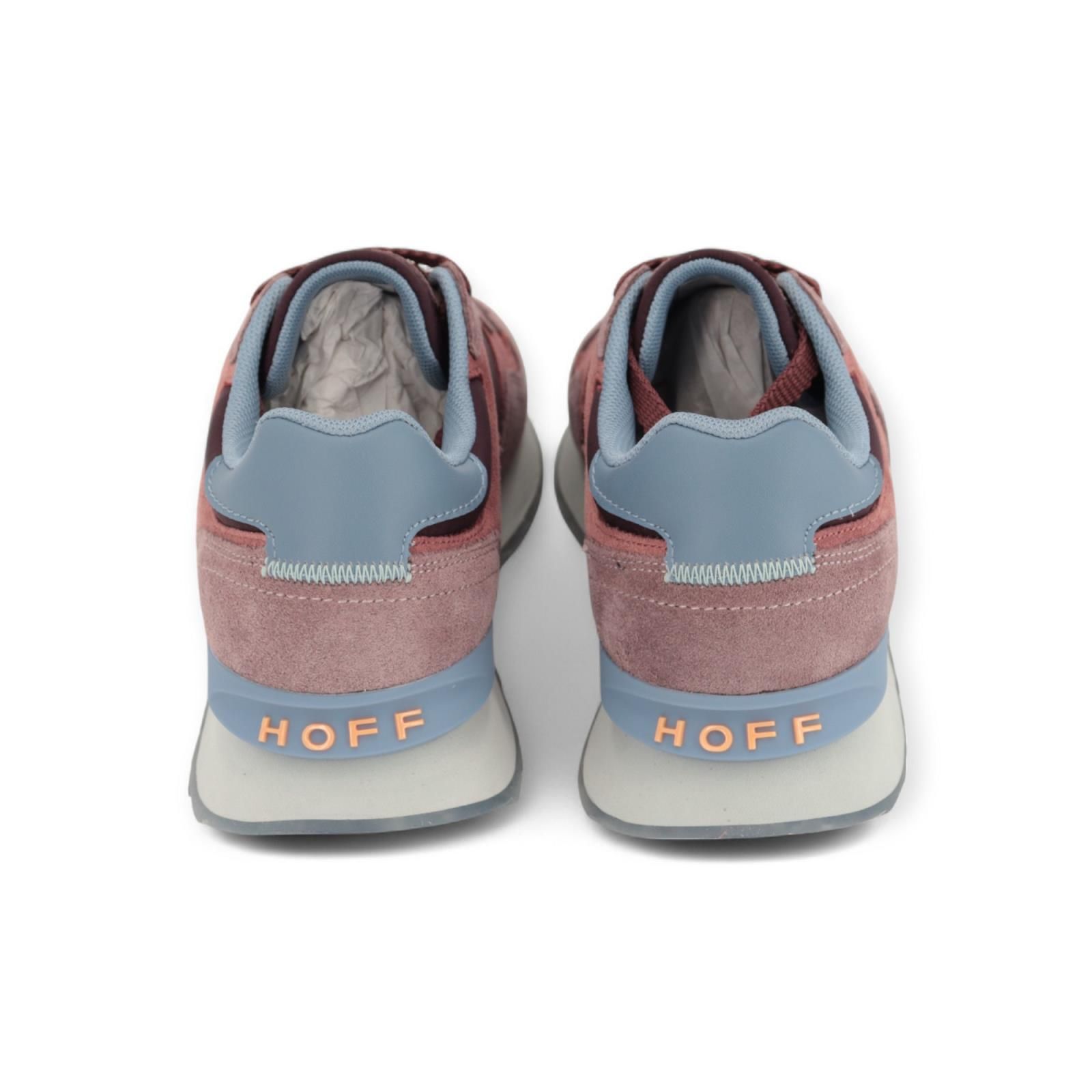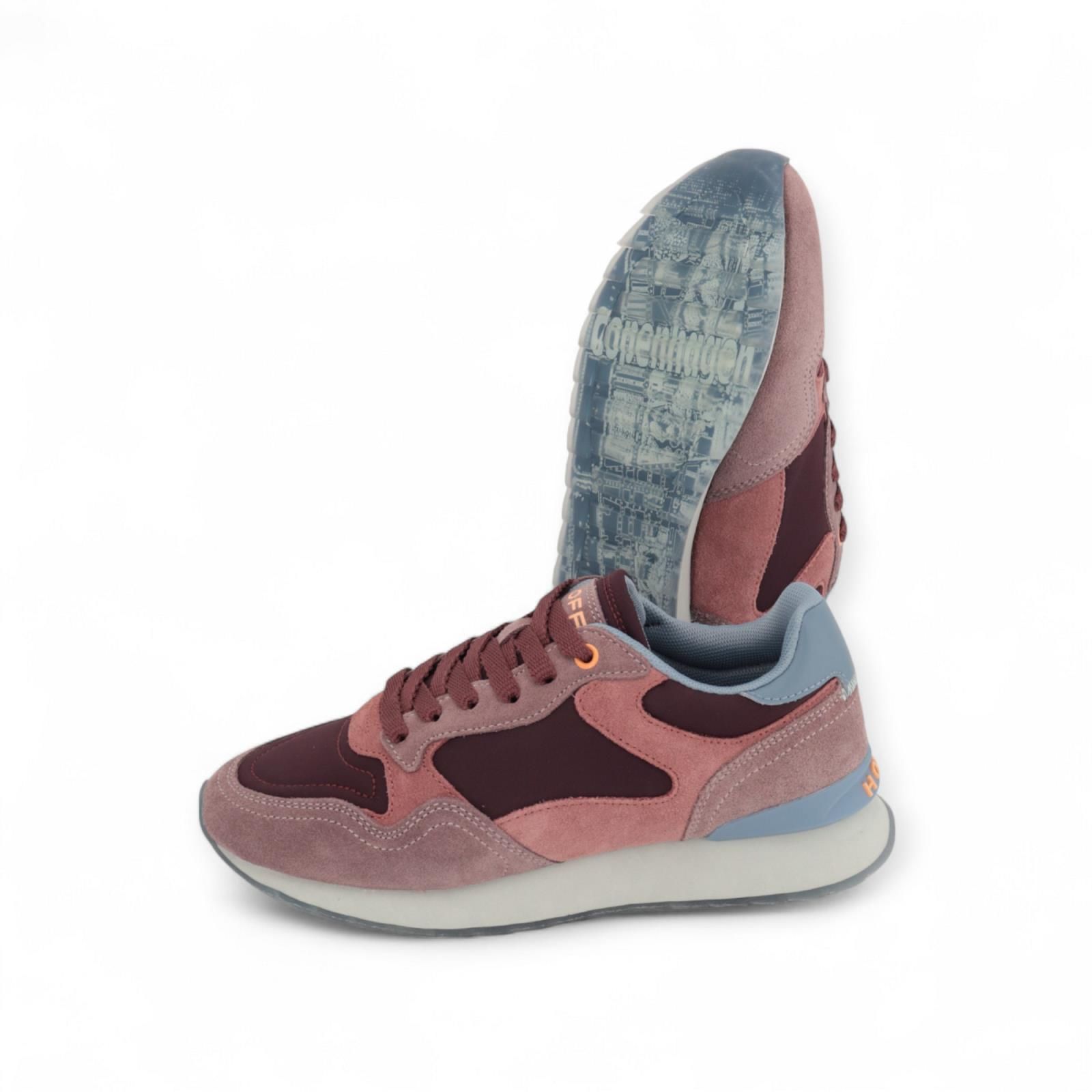 Sneaker City Copenhagen van Hoff voor dames. Deze sneaker is bordeaux tinten suède en nylon met een lichtblauwe hielflap. Heeft een logodetail in de hiel en een bedrukte citylook zool. De binnenzolen zijn uitneembaar.