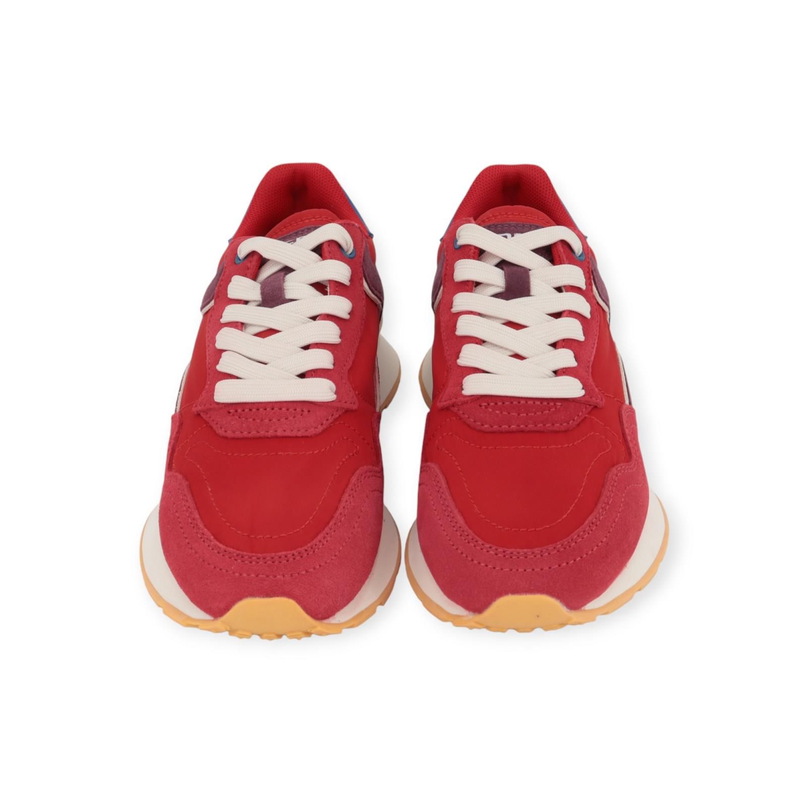 Sneaker City Dopamine van Hoff voor dames. Deze urban sneaker is in rood suède met nylon. Afgewerkt met bordeaux suède aan de zijkant, een blauwe hielflap en 3D wit inzetstuk aan de hiel. Heeft een aangename zool met een uitneembare binnenzool.
