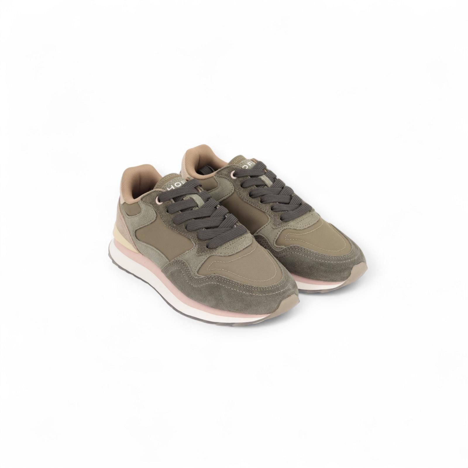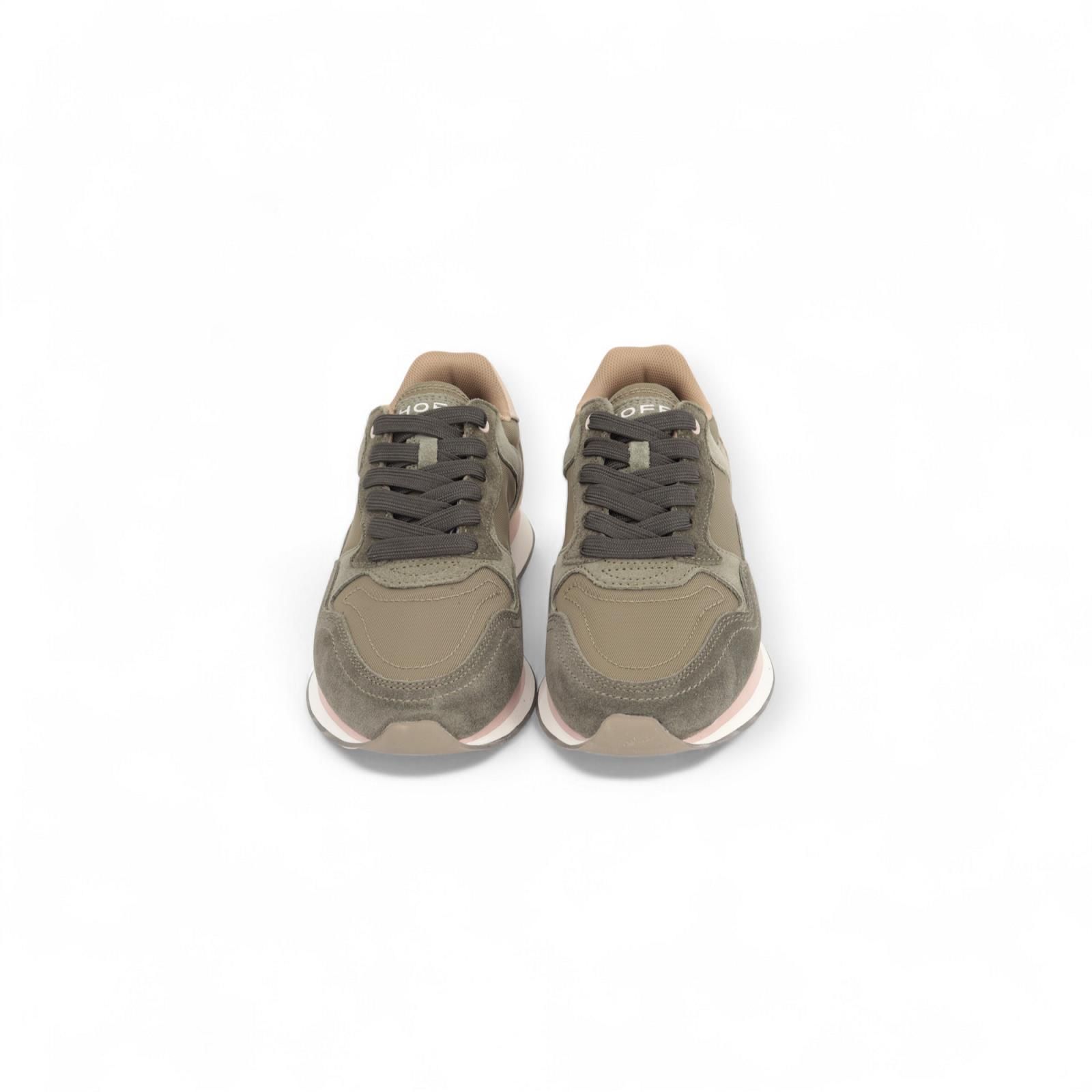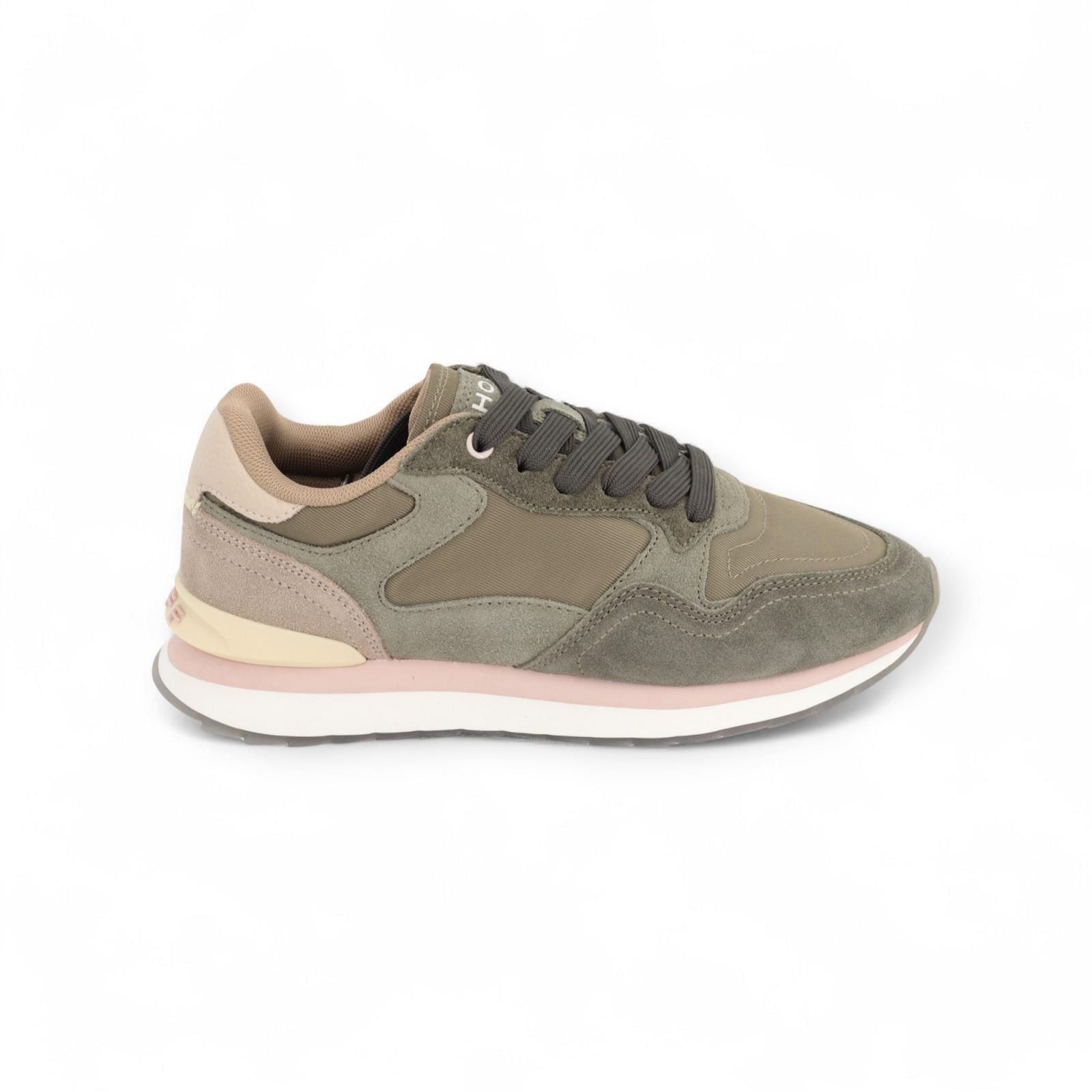 Sneaker City Los Angeles van Hoff voor dames. Deze sneaker is in kaki suède met nylon. Heeft een zacht roze hiel met beige hielflap en logdetail. De binnenzool is uitneembaar en heeft de typische citylook zool.