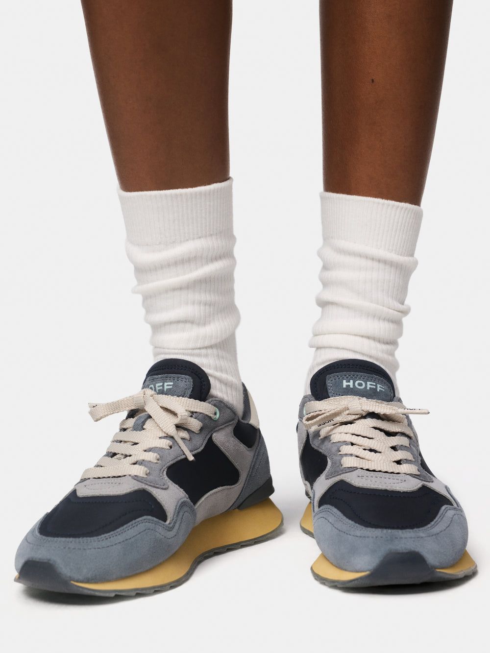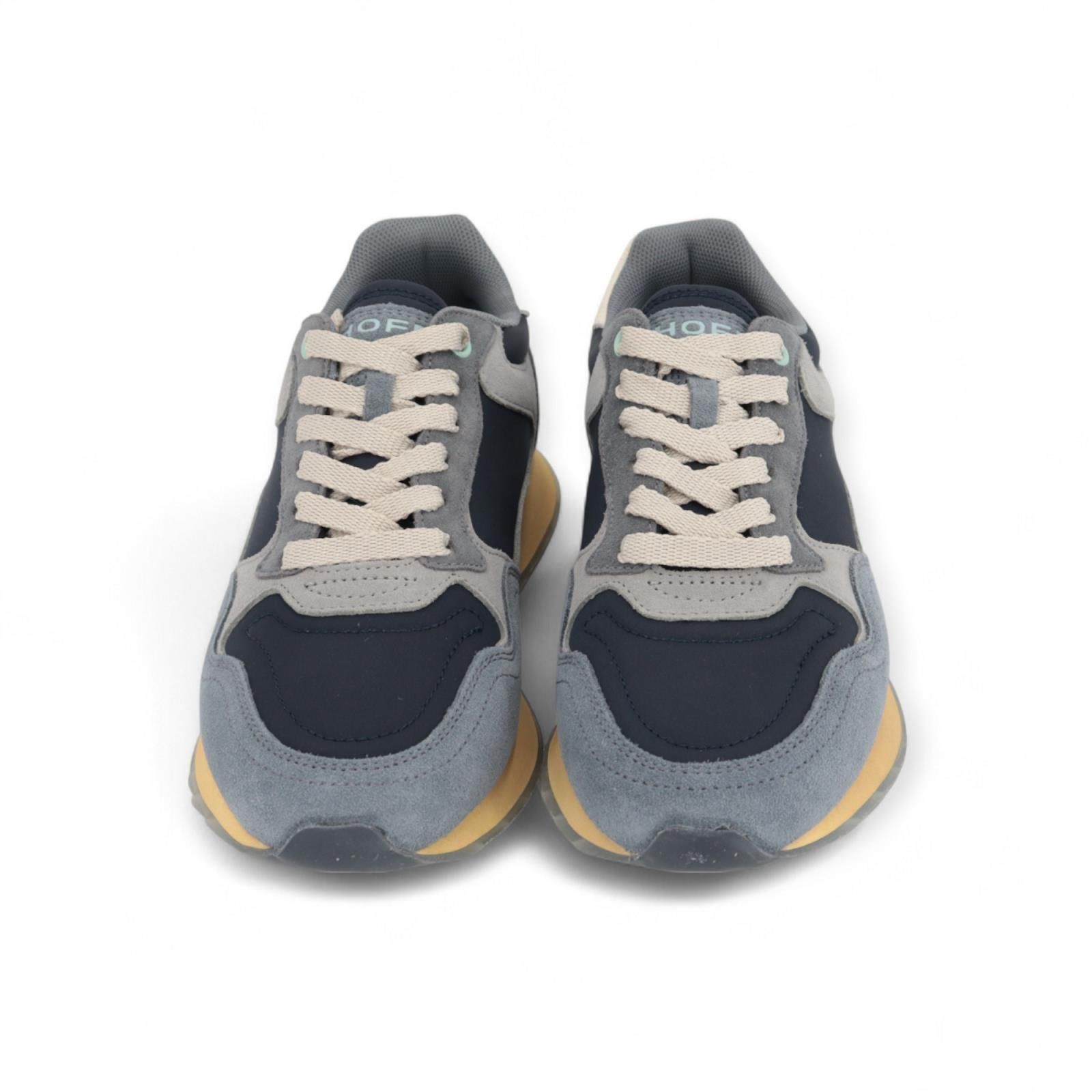 Sneaker City Moscow van Hoff voor dames. Deze sneaker is in blauwe tinten suède en een off wit hielflap. Heeft een logodetail in de hiel en een bedrukte citylook zool. De binnenzolen zijn uitneembaar.