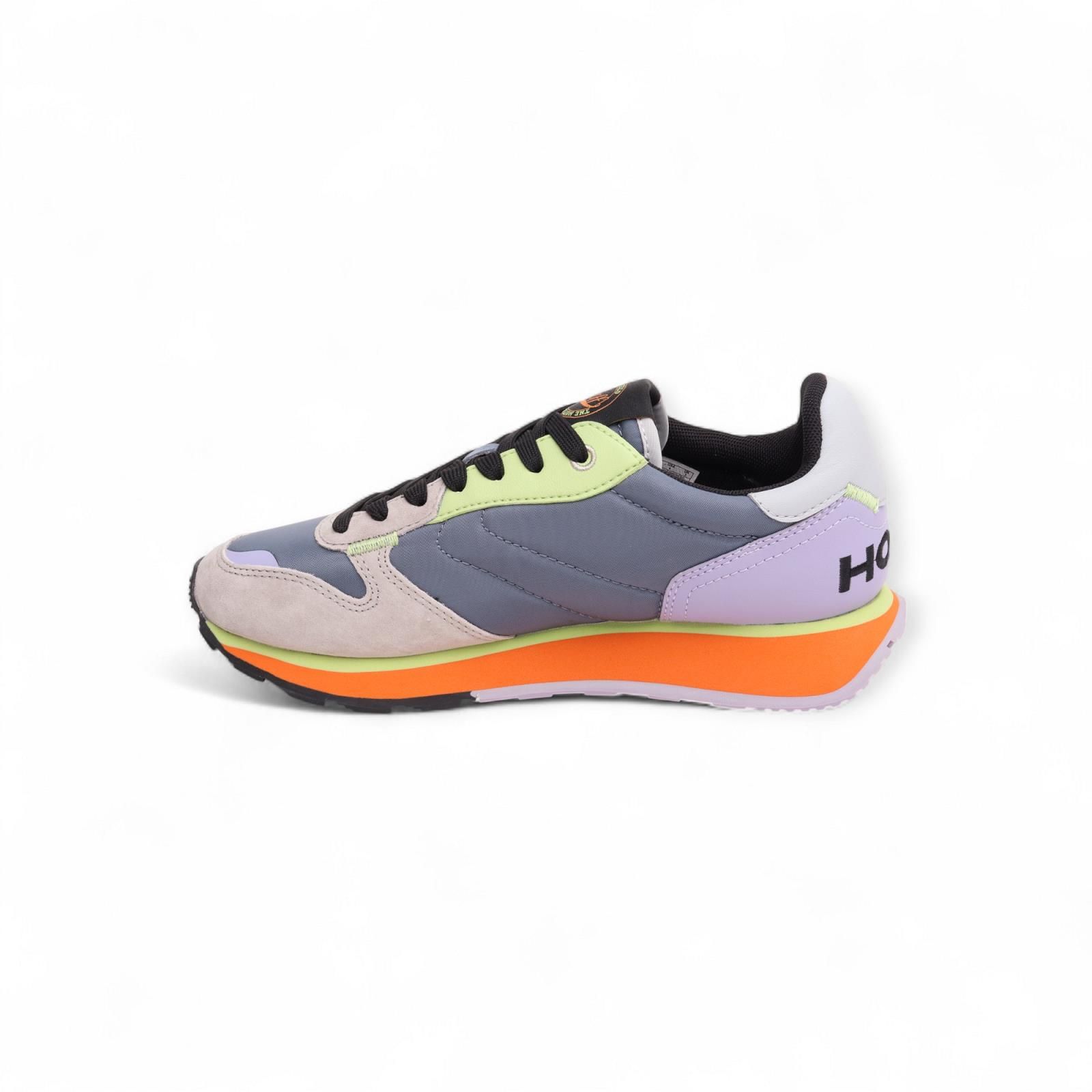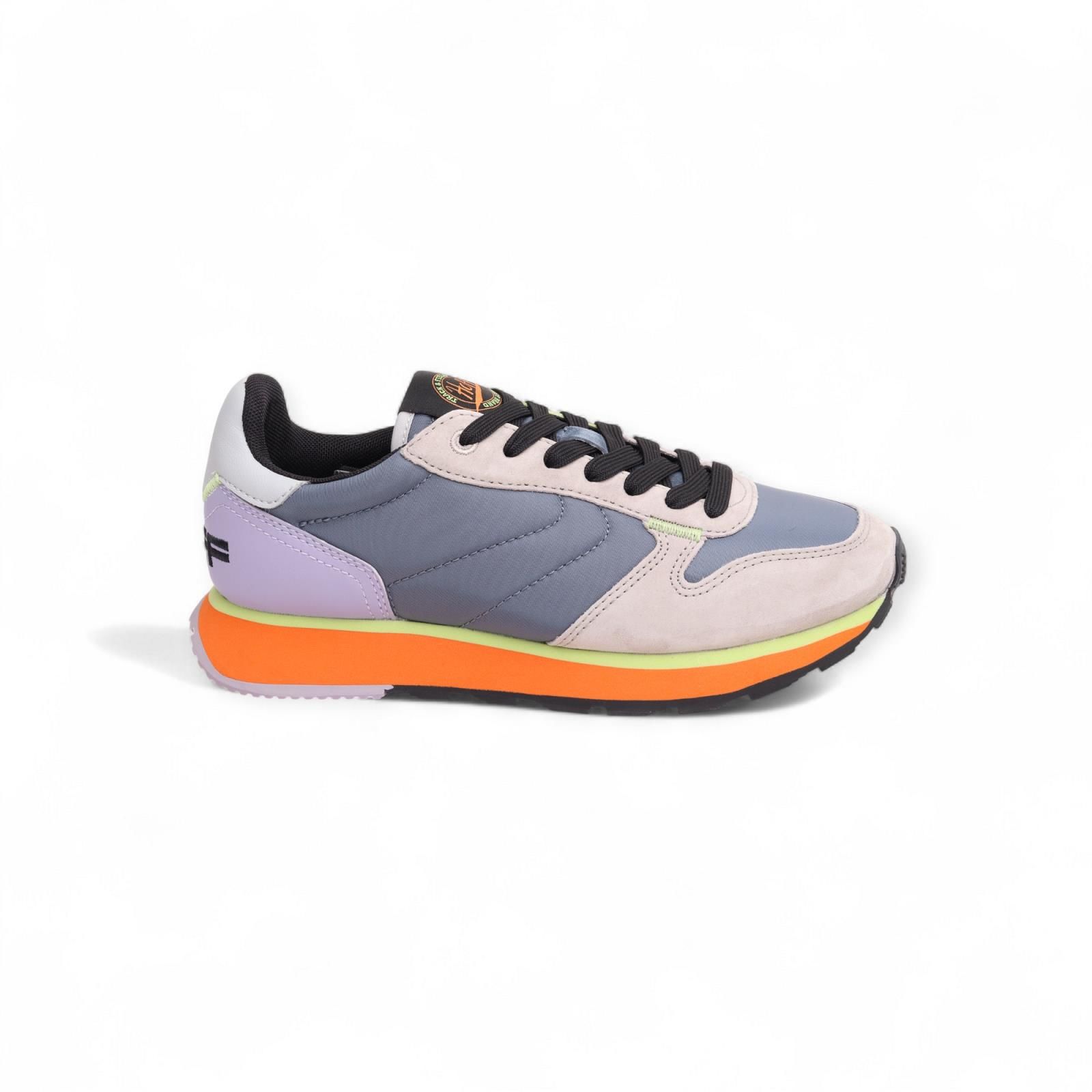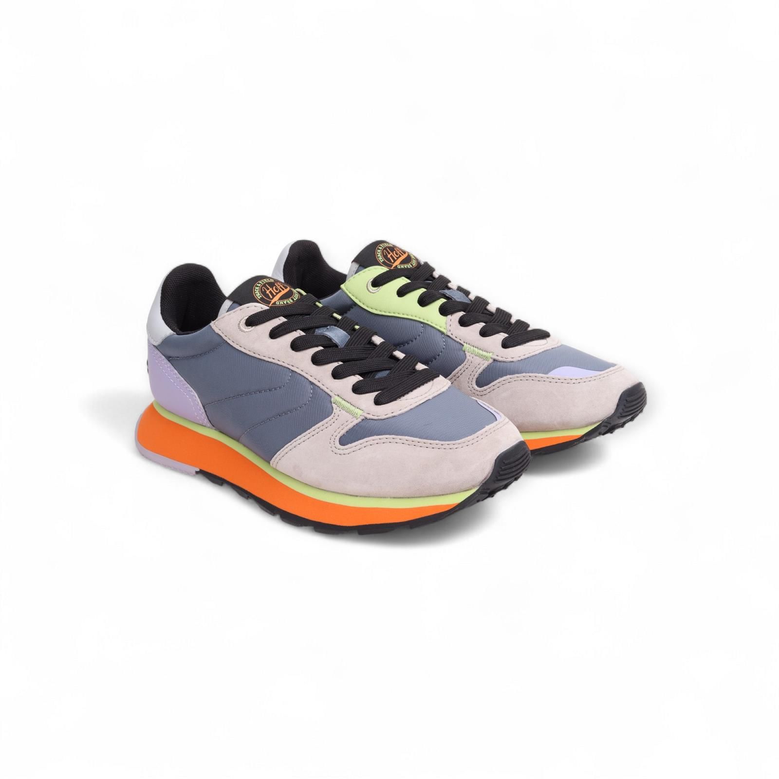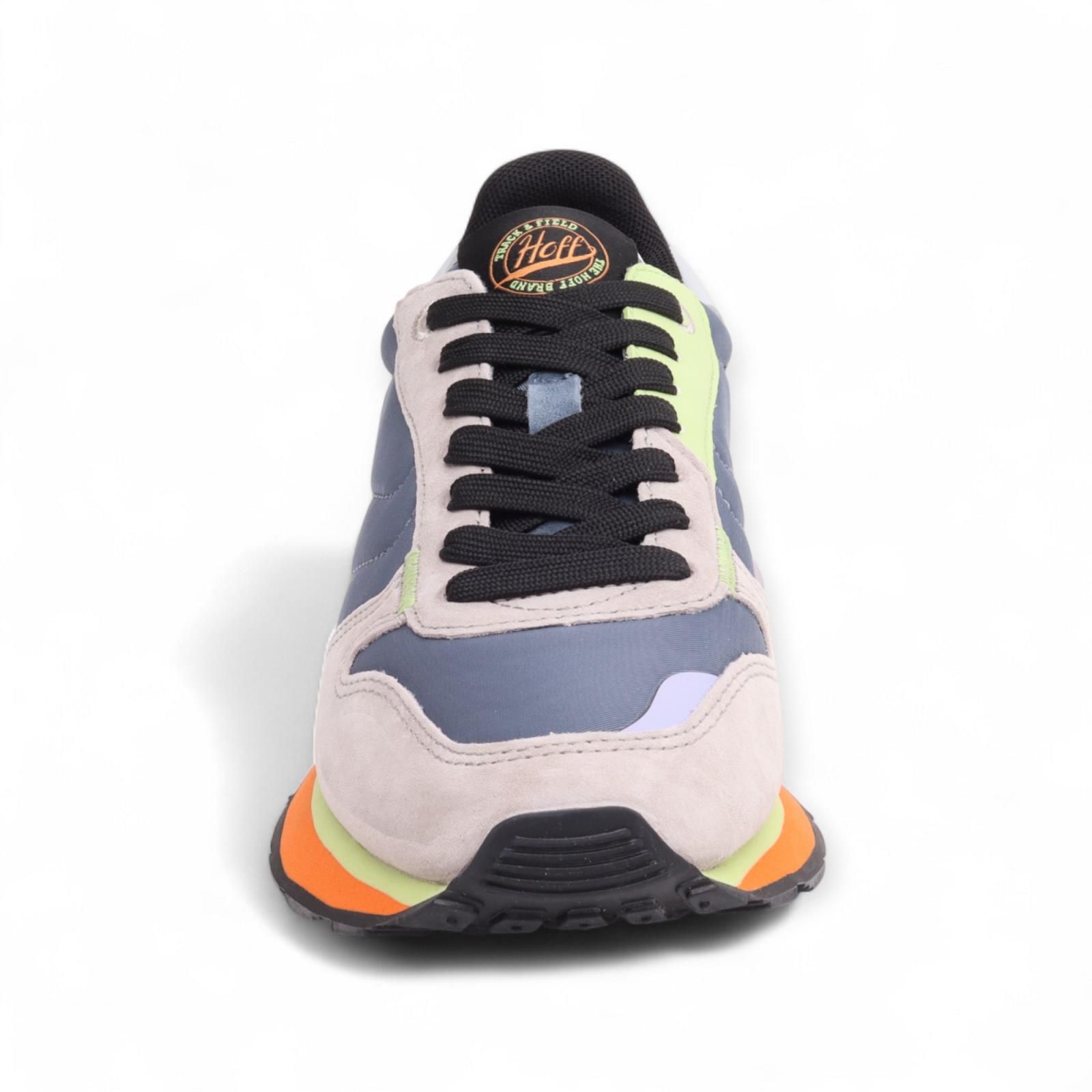 Phaistos damessneaker van Hoff: elegant en functioneel. Ontworpen met blauwe tinten nylon en grijs suède afgewerkt met een paarse hielflap. De zachte zool die ook uitneembaar is zorgt voor uw comfort en passen zich aan de contouren van je voet. Heeft een opvallende oranje met zwarte zool en zwarte veters.