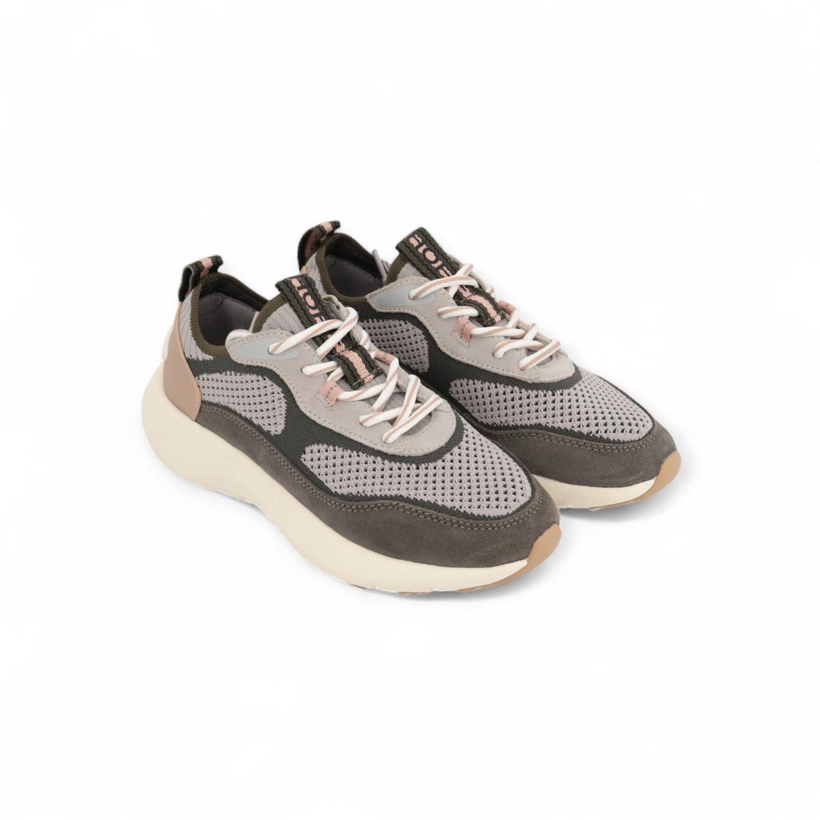 Sneaker Traveler van Hoff voor dames. Deze sneaker is in kaki en beige suède met grijs/groen elastische stof. Voelt zeer zacht aan door het elastische ontwerp. Is mooi afgewerkt met een beige rubberen hielflap met HOFF logo. Het ortholite voetbed biedt lichtgewicht demping en ondersteuning. Terwijl de runnerzool voor het nodige comfort zorgt. De binnenzool is uitneembaar.