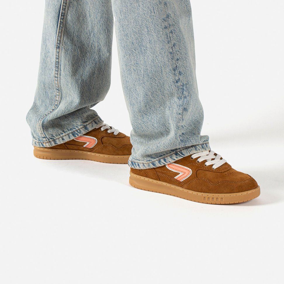Sneaker Vancouver van HUB voor dames. Deze sneaker is in cognac suède met verschillende stiksels en inzetstukken. Is mooi afgewerkt met het logo aan de zijkant in roze en een roze hielflap. Is op een bruine zool en de binnenzool is uitneembaar.
