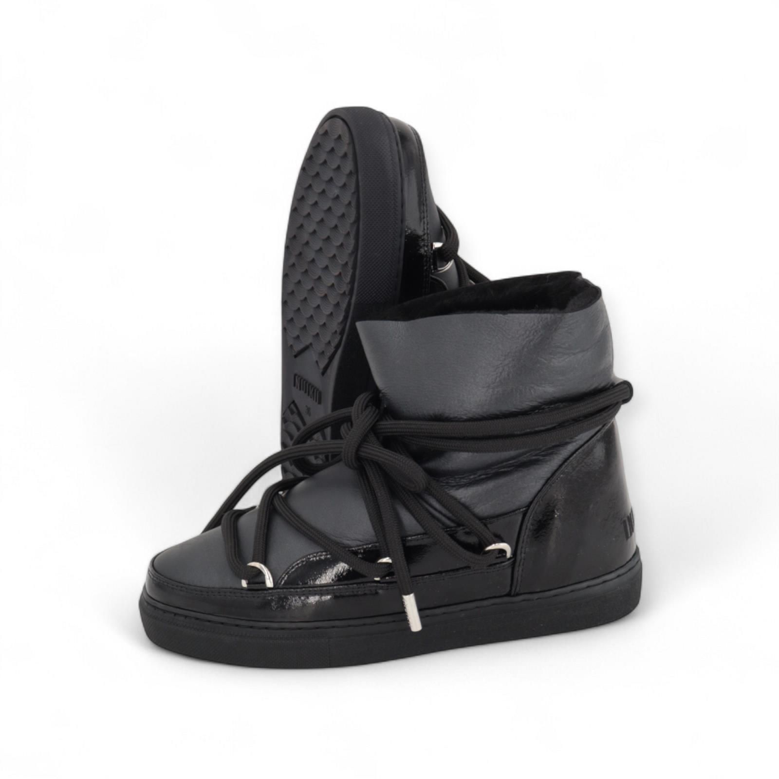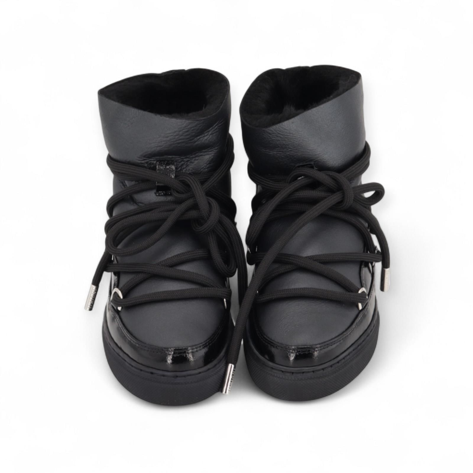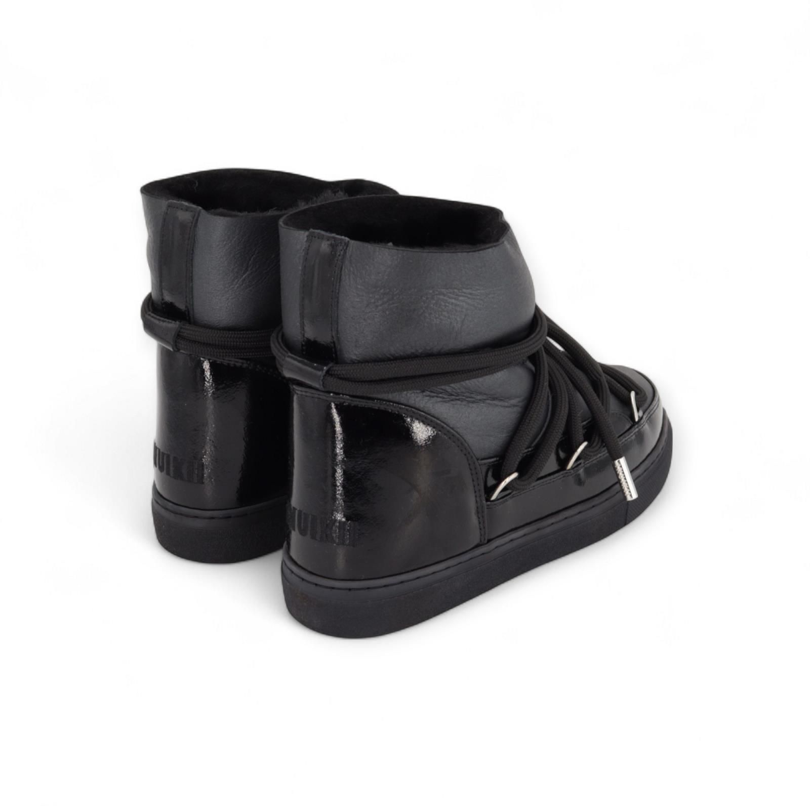 Enkellaars Gloss van Inuikii voor dames. Deze enkellaars is in zwart leer met lakleren details. Geeft een frisse draai aan de iconische classics. Is met warme wol en afgewerkt met dikke veters. Is op een aangename sneakerzool en de binnenzool is uitneembaar. Deze enkellaars komt iets hoger aan de enkel dan de classic low.