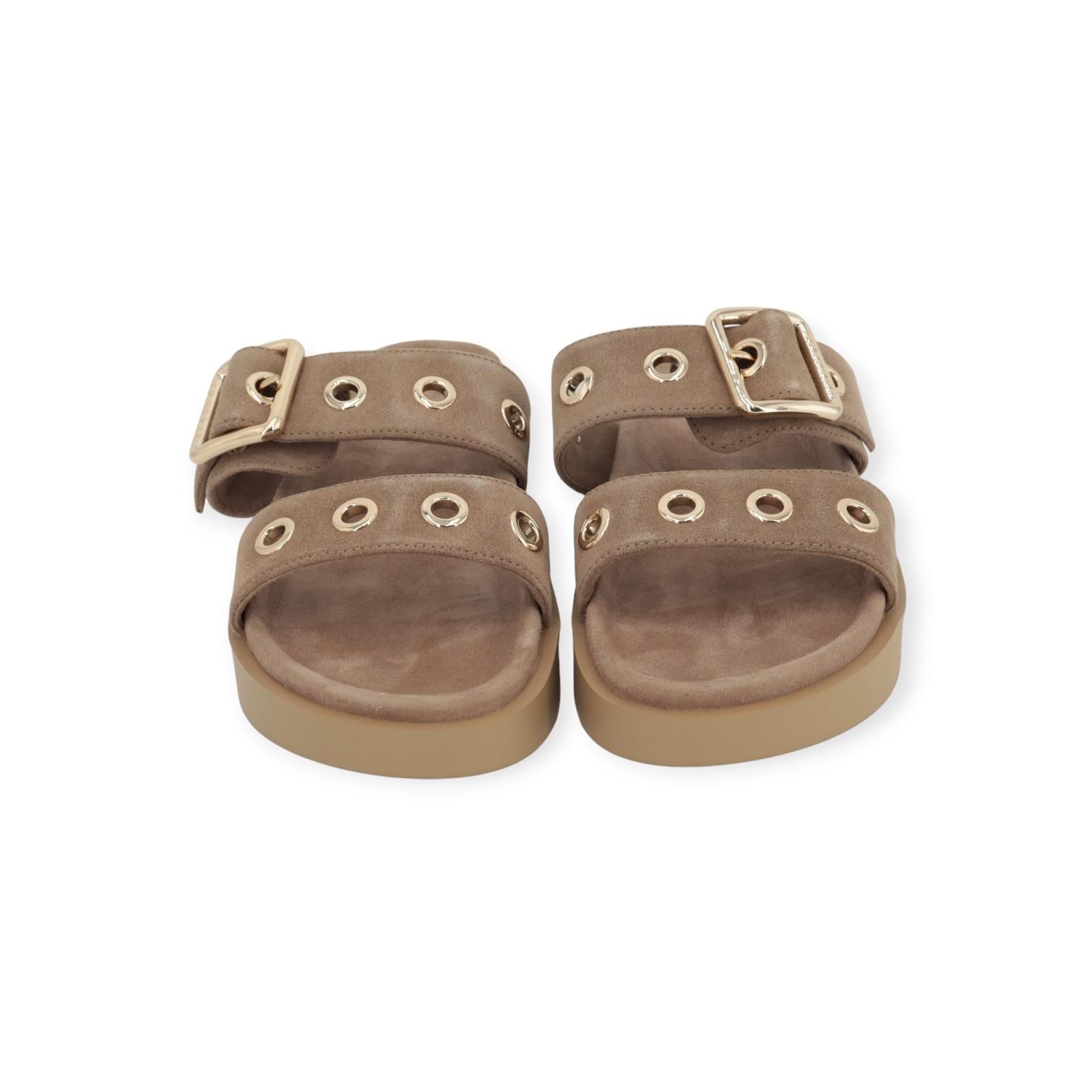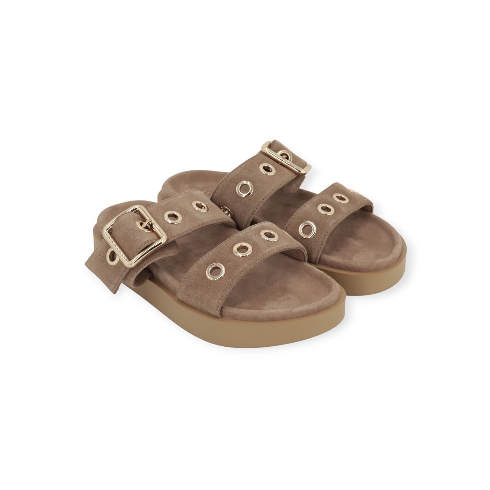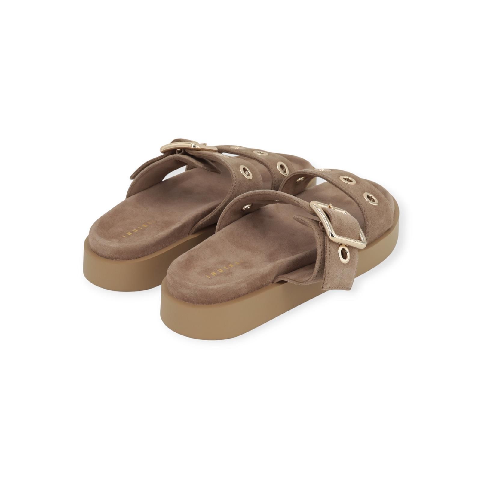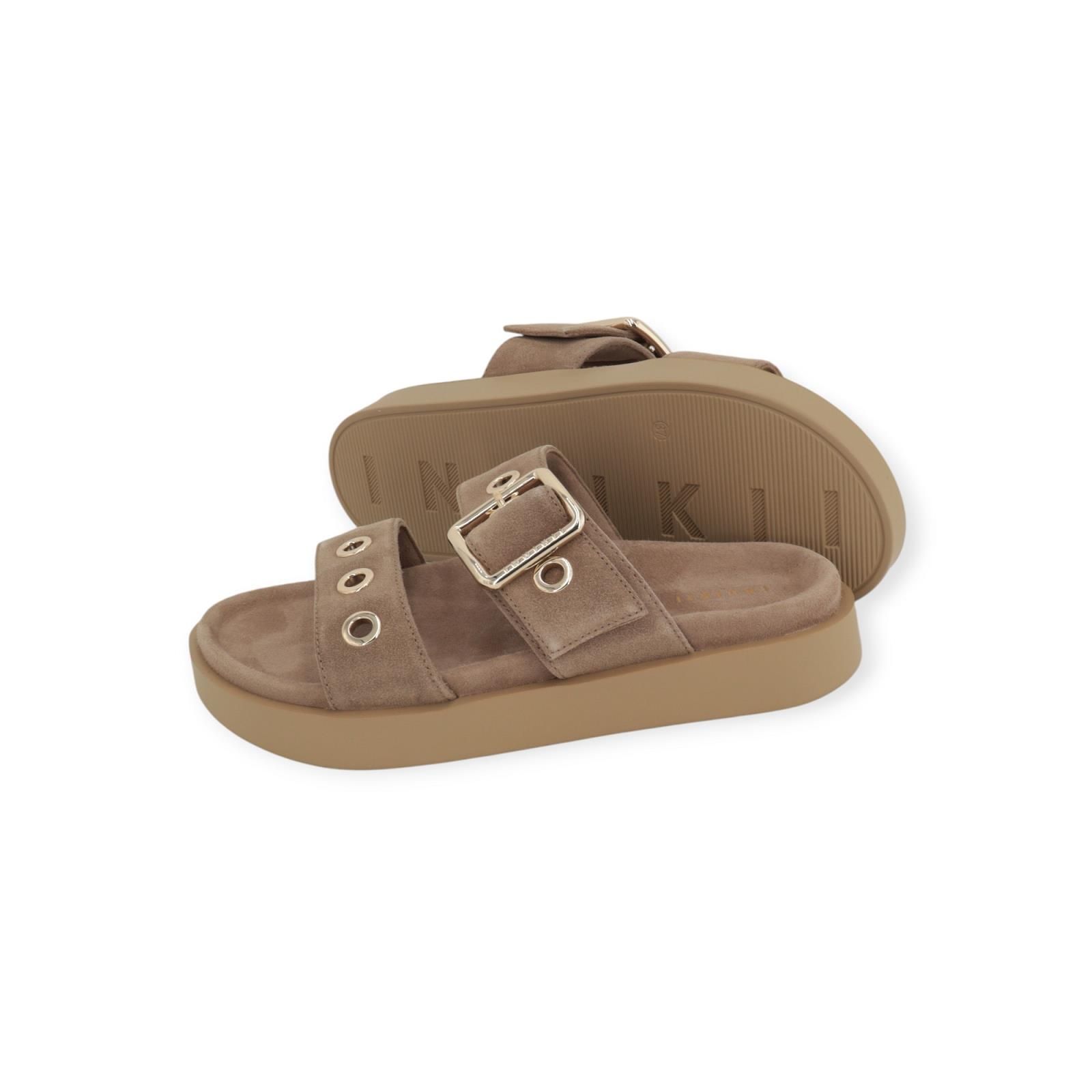 Slipper / muil Tilda Buckle van Inuikii voor dames. Deze slipper is in beige suède. Heeft 2 banden over de wreef met opvallende gouden oogjes en een gespsluiting. Heeft een aangenaam voetbed met een dikke vaste antislipzool.