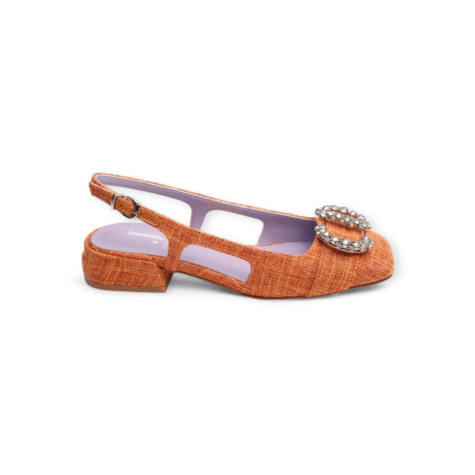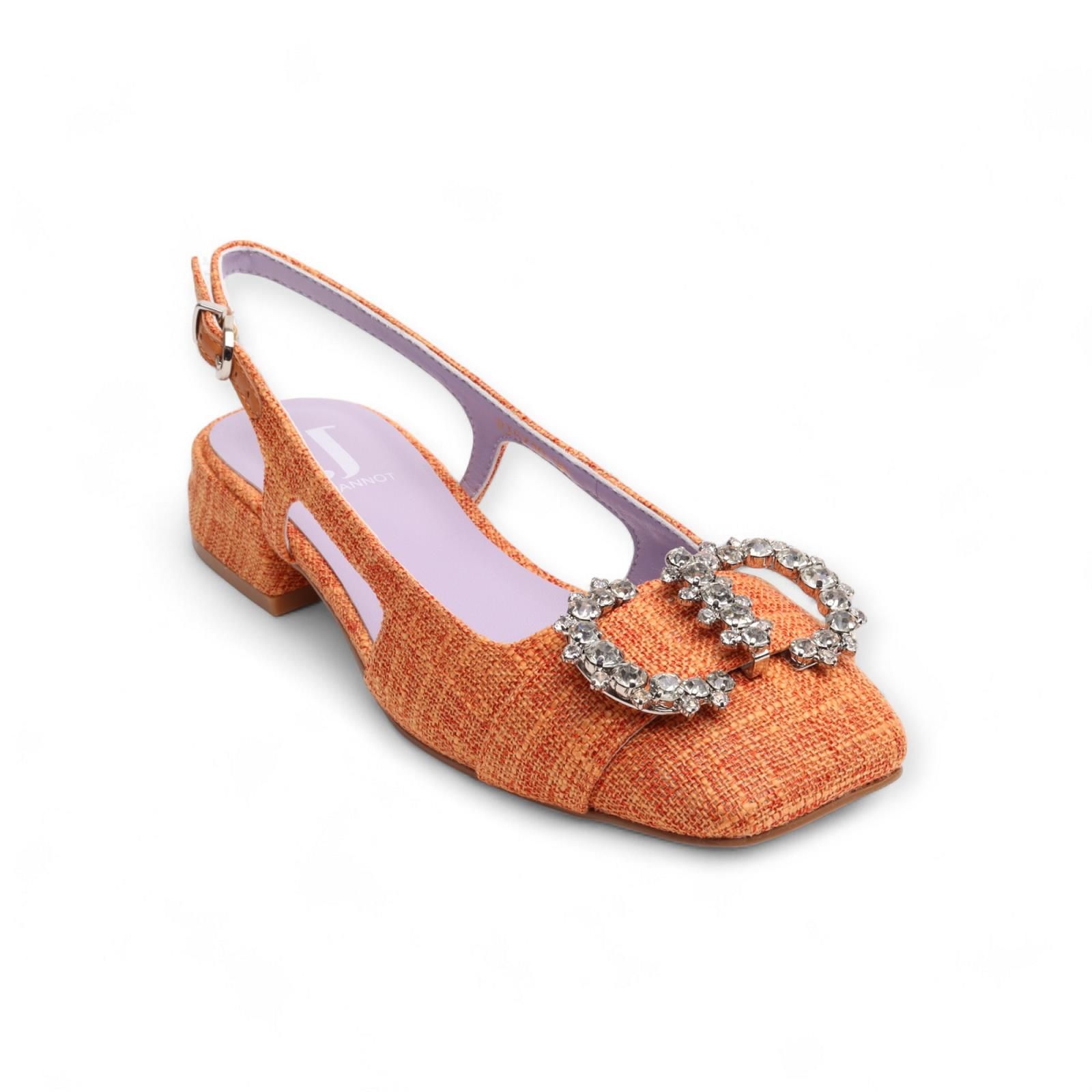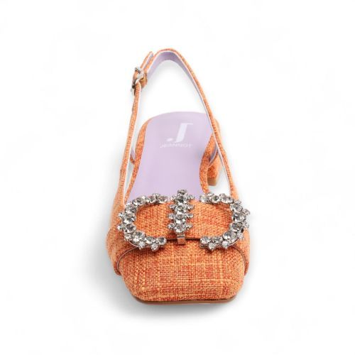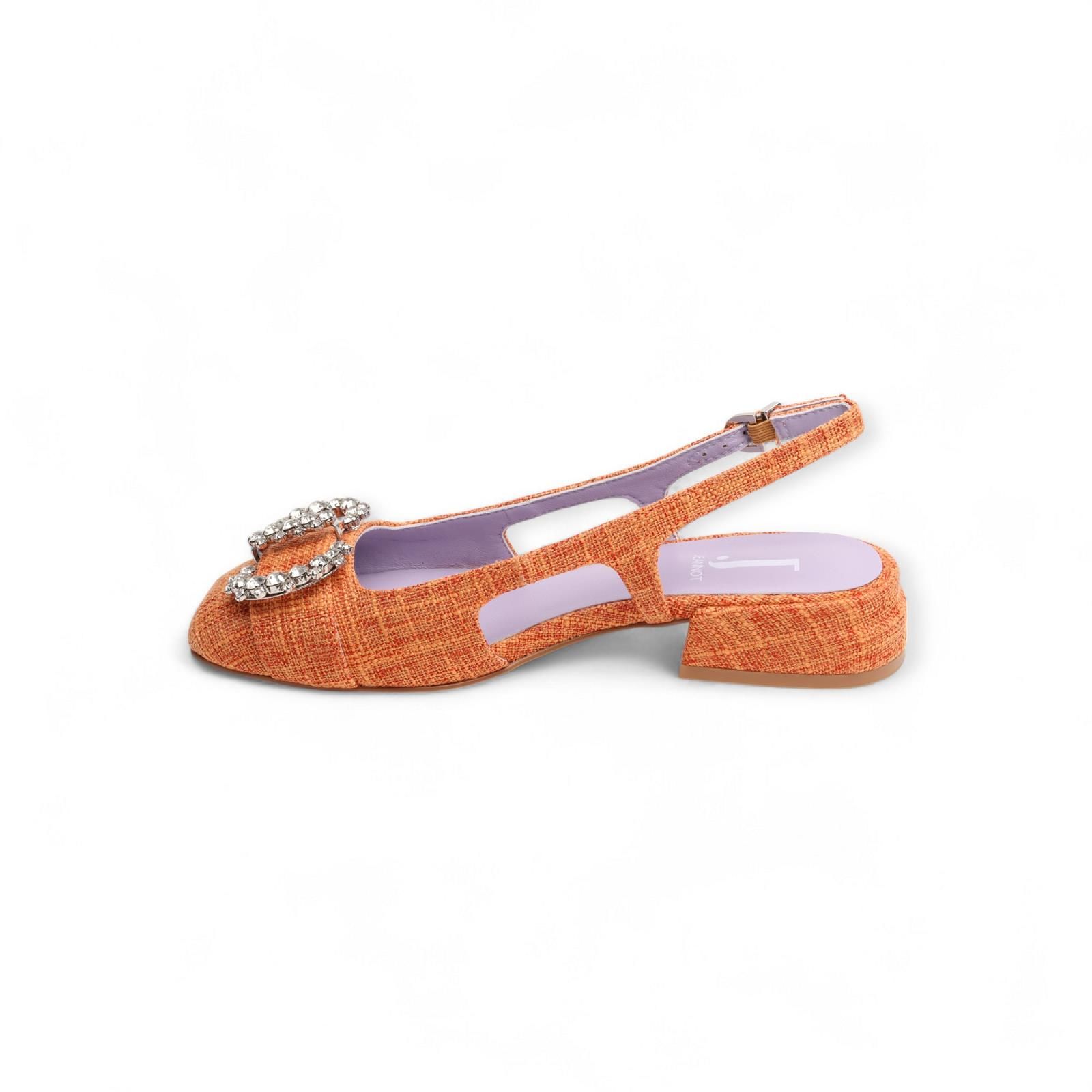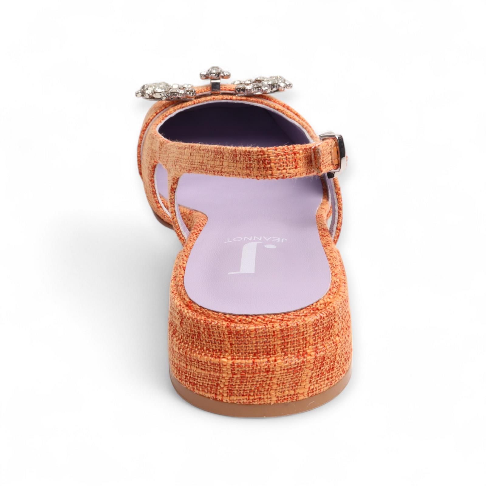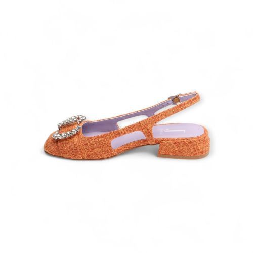 Ballerina Jeannot in oranje voor dames. Dit slingback model in rafia is met een open hiel en een gesloten voorkant. De voorkant is met een extra detail in steentjes die het ballerinatje nog eleganter maakt. De hak is mee afgewerkt in rafia en is met een gespsluiting rond de hiel.