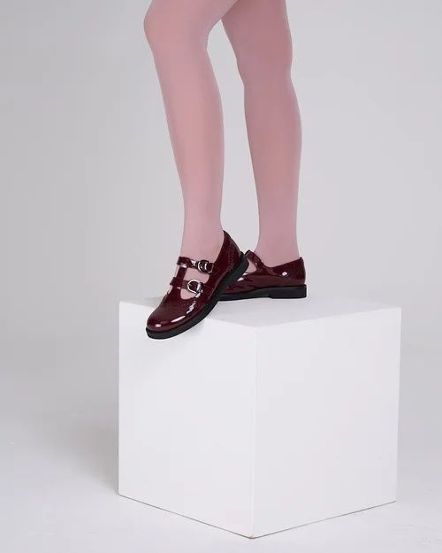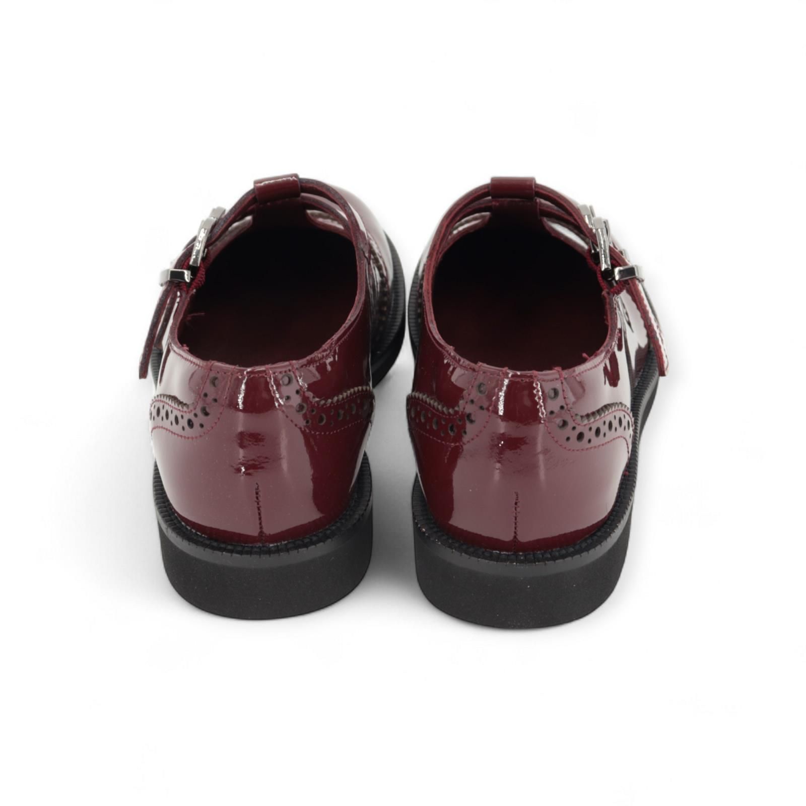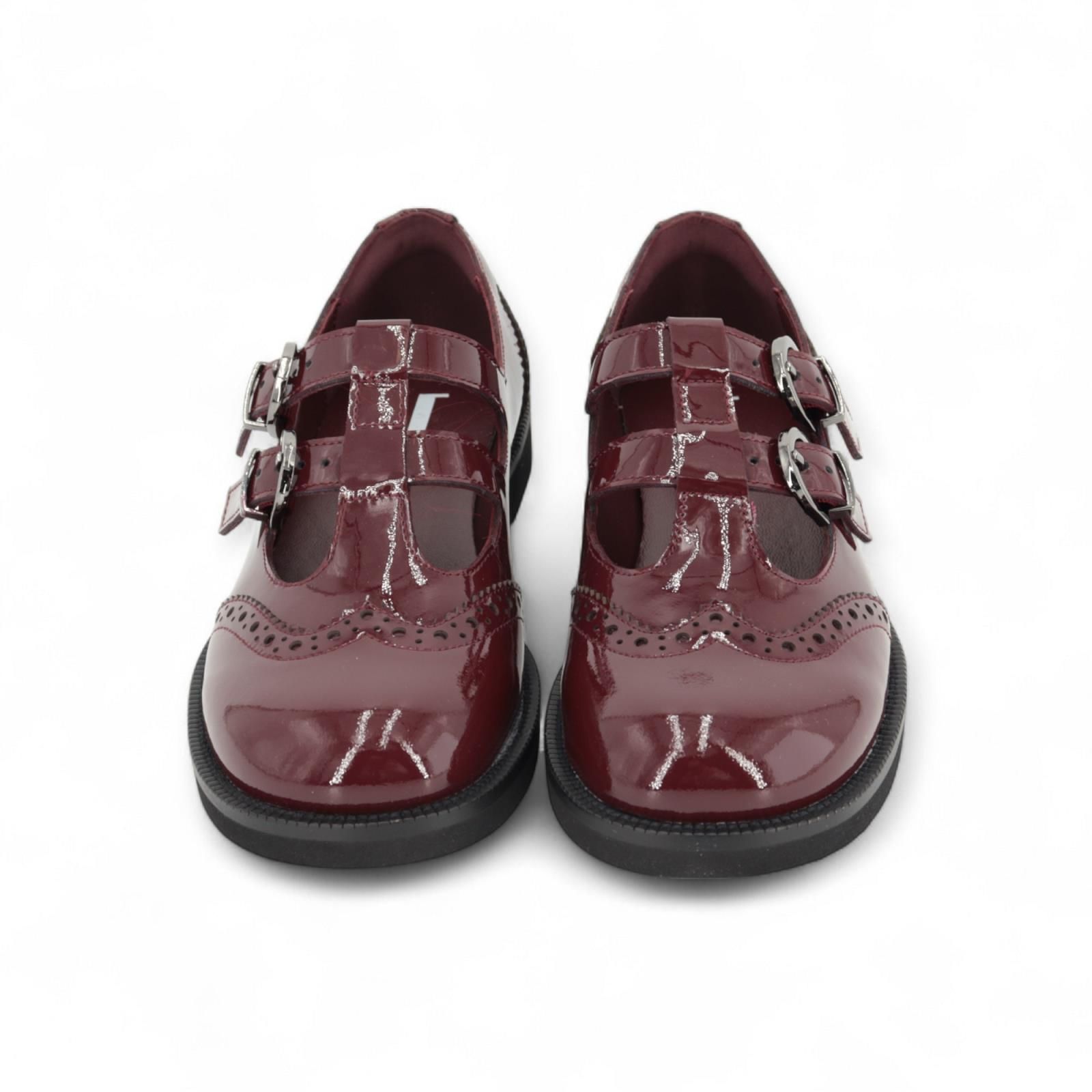 Ballerine VJ572 van Jeannot voor dames. Deze elegante schoen is in bordeaux lakleer. Heeft een ronde neus , 2 bandjes met gespsluiting over de wreef en afgewerkt met sierstiksels op de voorvoet en hiel. Is op een dikke zwarte antislipzool.