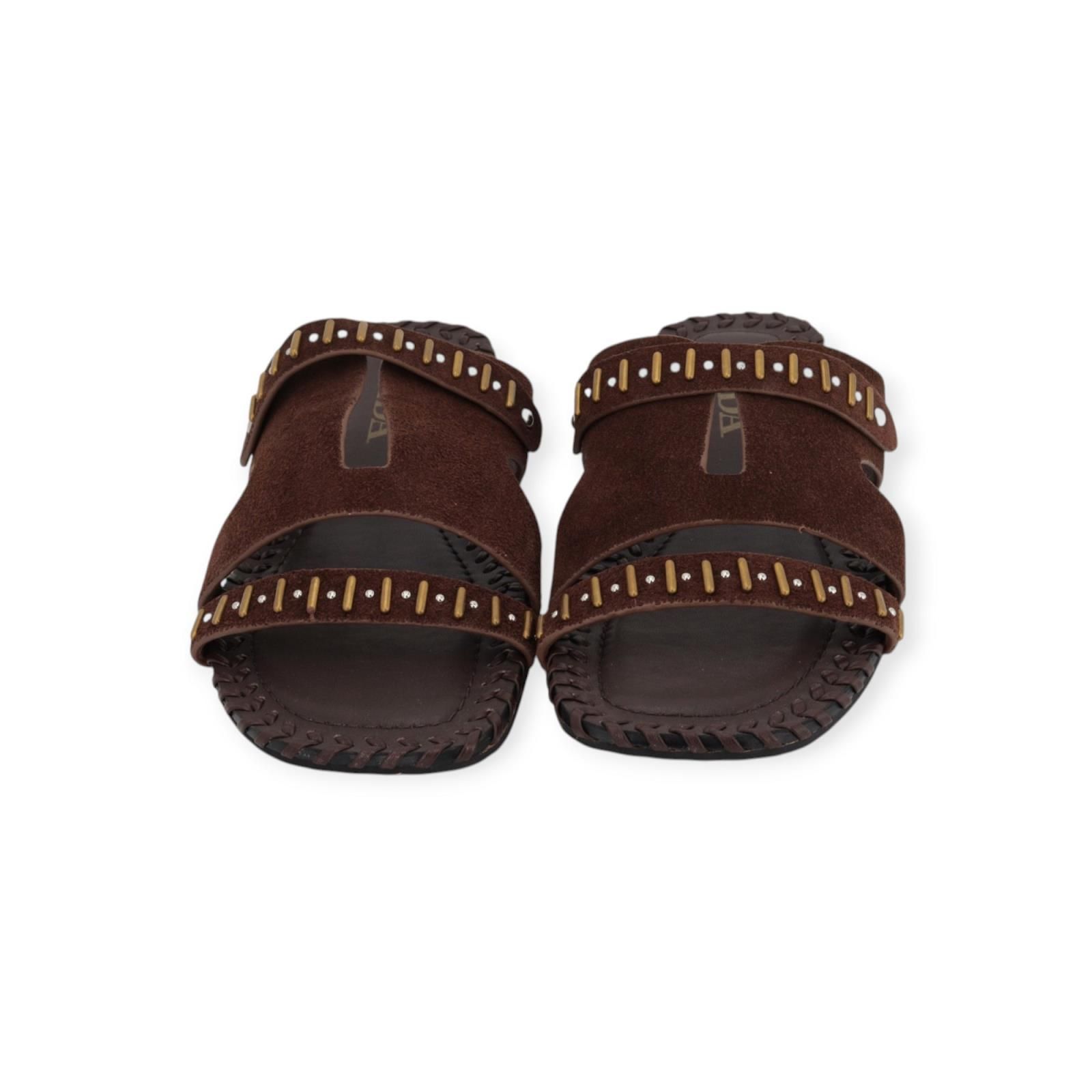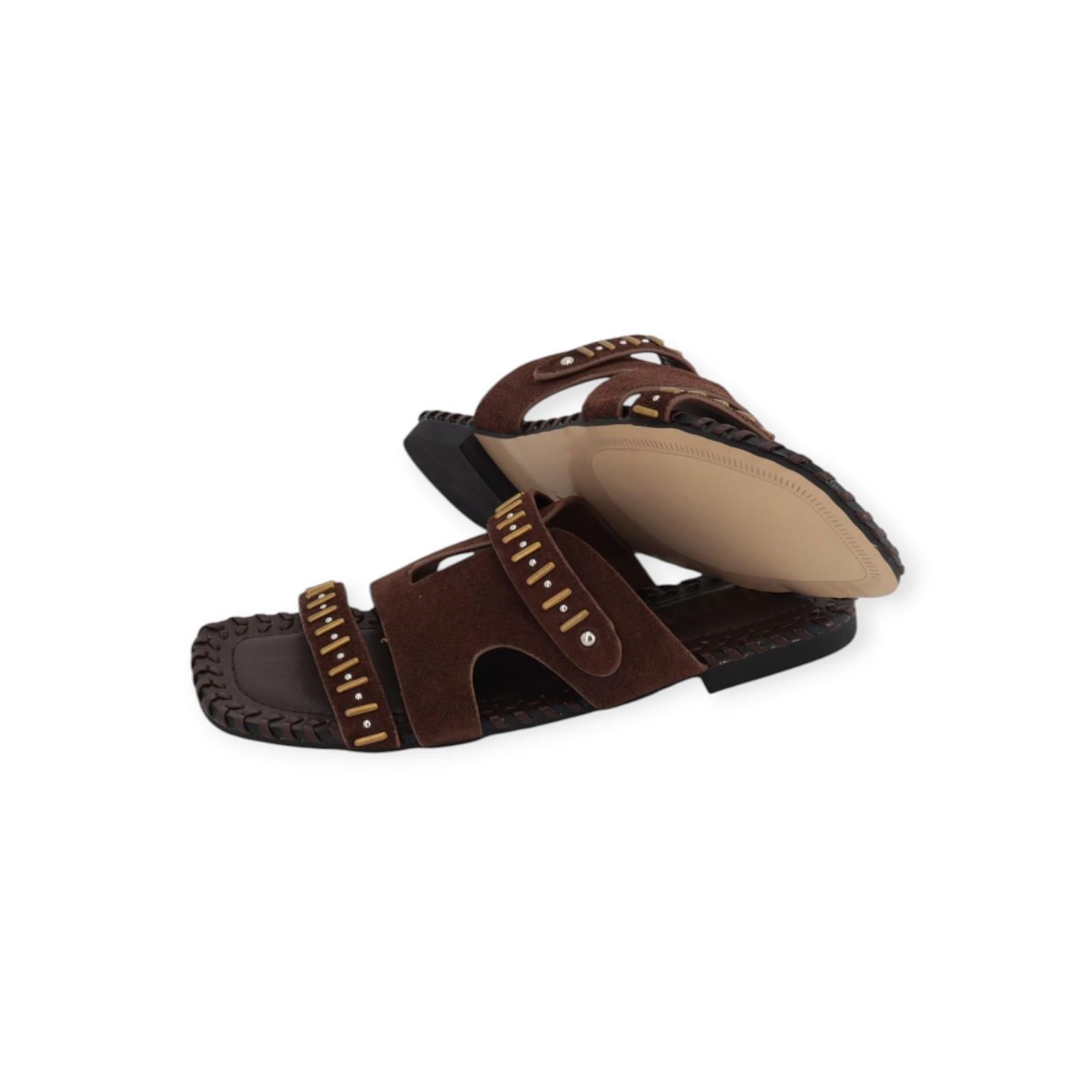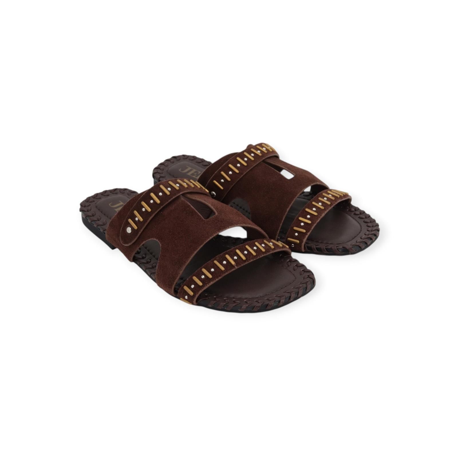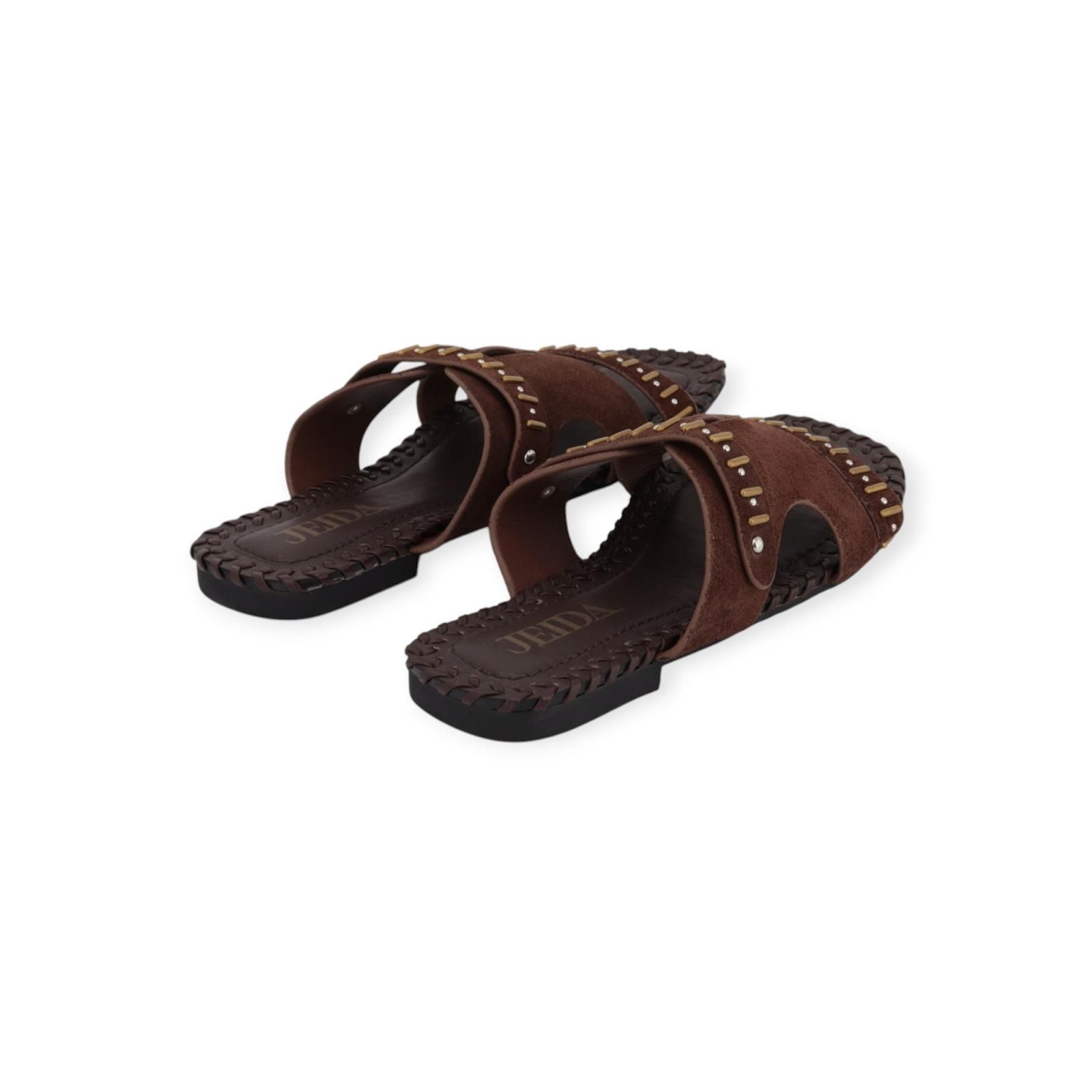 Slipper, Muil J81 van Jeida voor dames. Deze slipper is in bruin leer met suède. Is met 2 bandjes over de wreef een fijn en breed, afgewerkt met gouden en zilveren studs. Heeft een leren binnenzool omrand met stiksel, de buitenzool is eveneens in leer.