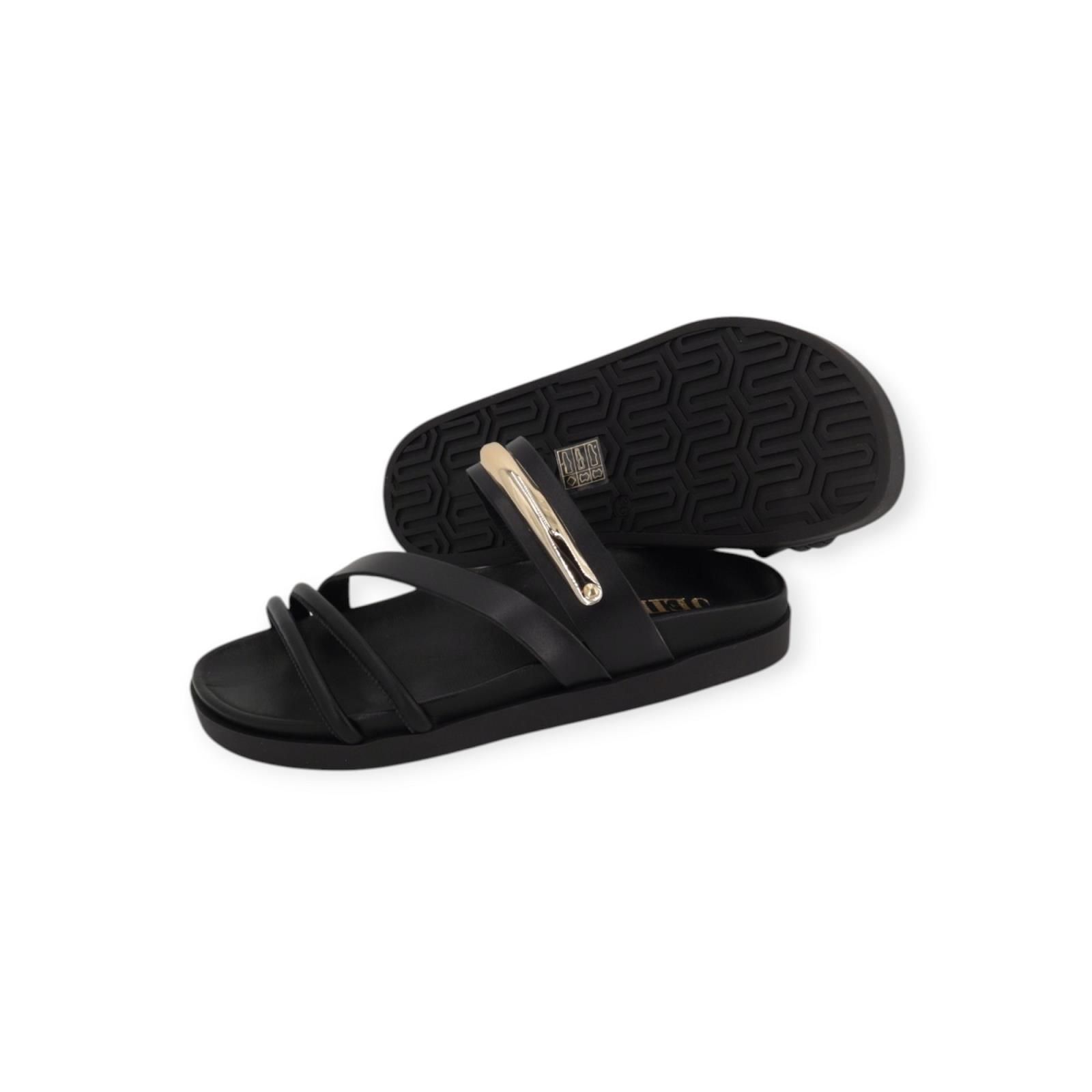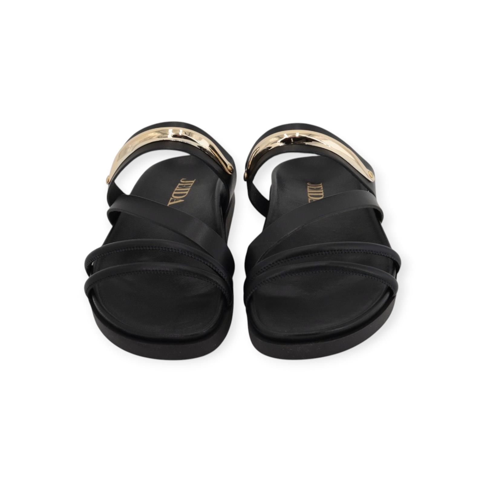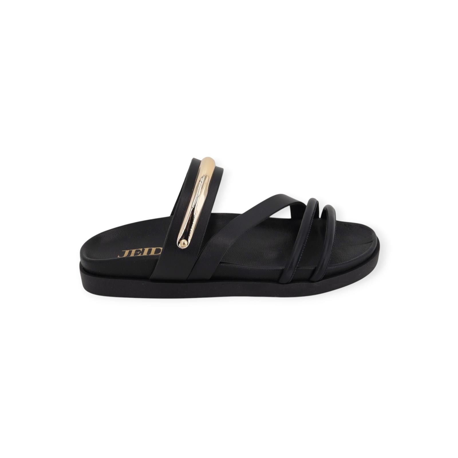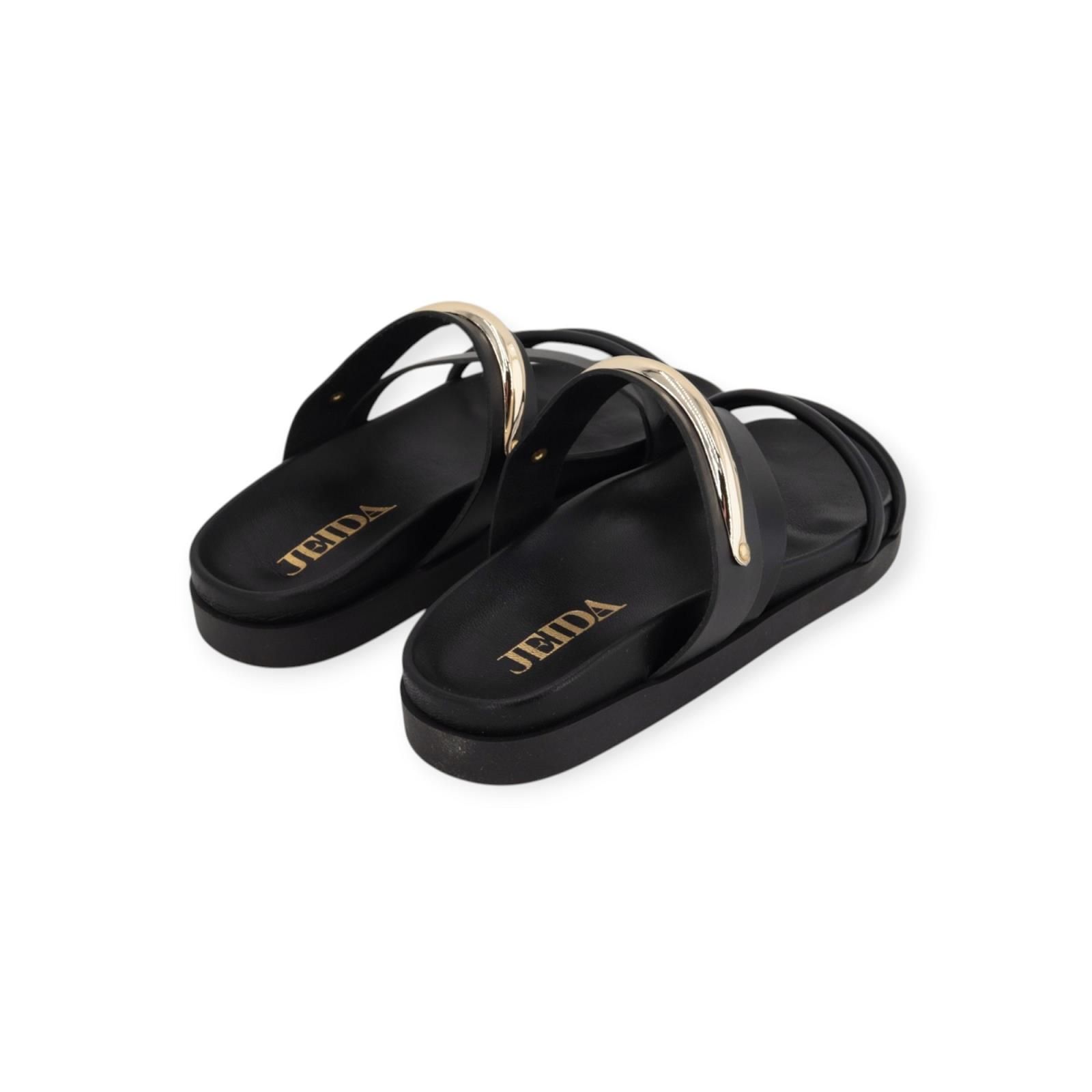 Slipper, Muil J905 van Jeida voor dames. Deze slipper is met fijne zwarte bandjes over de wreef. Mooi afgewerkt met gouden boekel. Is op een aangenaam leren voetbed met antislip buitenzool.